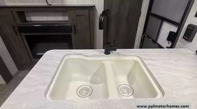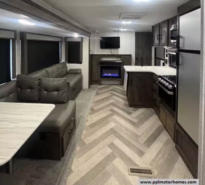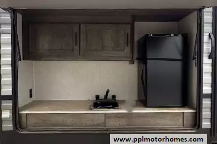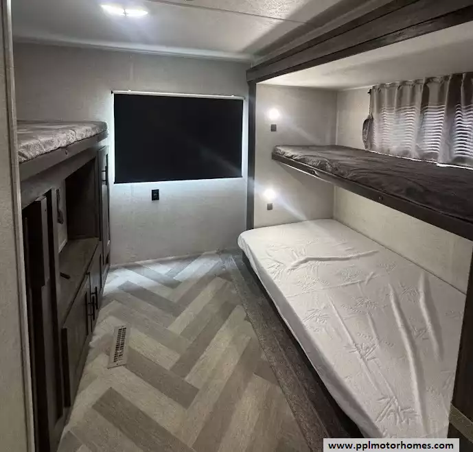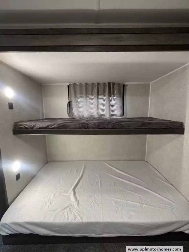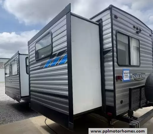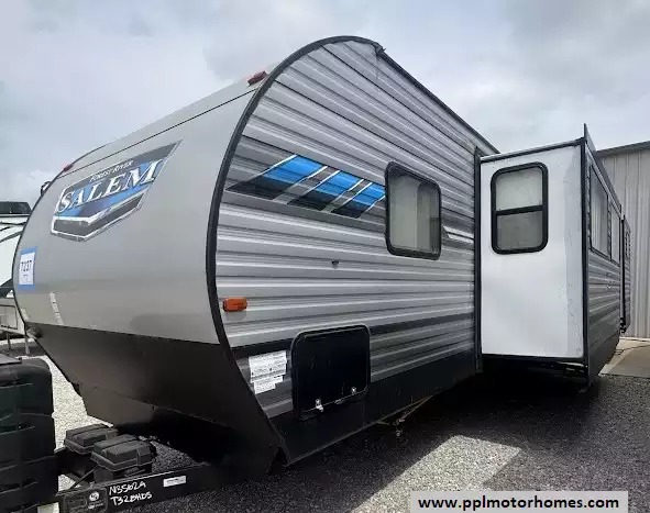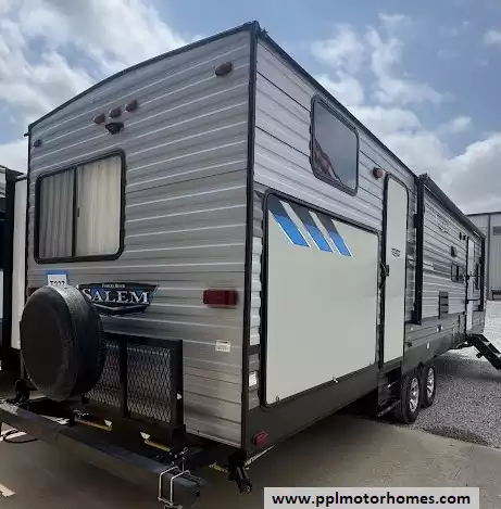 This 2020 Salem 32BHDS has a spacious bunkhouse layout, outdoor fridge and sink area as well as a fireplace. It has an Electric Tongue Jack, 2 Slide-outs, 1 Ducted Air Conditioner, Double Door Gas/110v Refrigerator, Automatic Main Awning, Outside Speakers, TV, Outside Shower, Microwave, 3 Burner Range, Oven