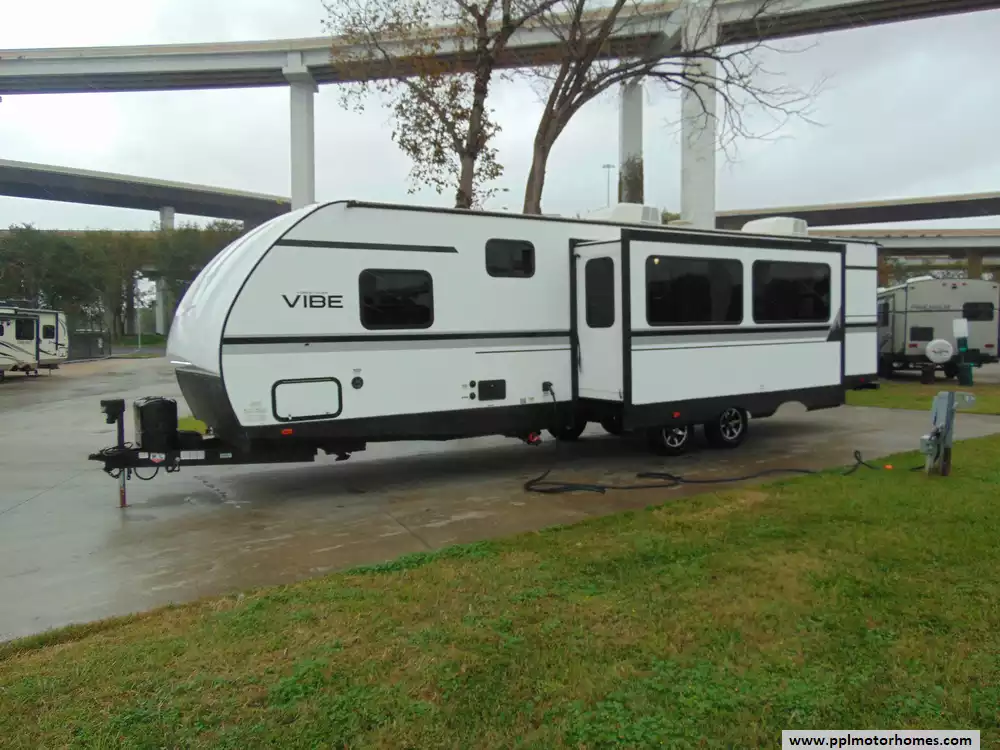 This 2020 Vibe 28BH is a spacious and family-friendly travel trailer that blends modern design with practicality,making it a great choice for families or groups seeking adventure with the comforts of home.Features Include...Electric Tongue Jack, 1 Slide-out, 1 Non-Ducted And 1 Ducted Air Conditioner, Double Door 12v Everchill Refrigerator, Automatic Main Awning,Outside Speakers,TV,Outdoor Kitchen,Outside Shower,Microwave,3 Burner Range,and Oven.With its thoughtful design and family-oriented features,it ensures a comfortable and enjoyable camping experience for everyone.
