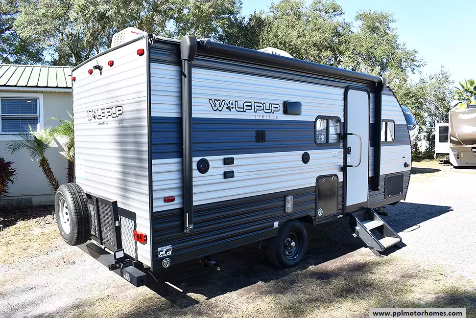This 2020 Wolf Pup 16BHS has an Electric Tongue Jack, 1 Ducted Air Conditioner, Double Door 12v Everchill Refrigerator (Additional Refrigerator Present), Automatic Main Awning, Outside Speakers, TV, Outside Shower, Convection Microwave, 2 Burner Range