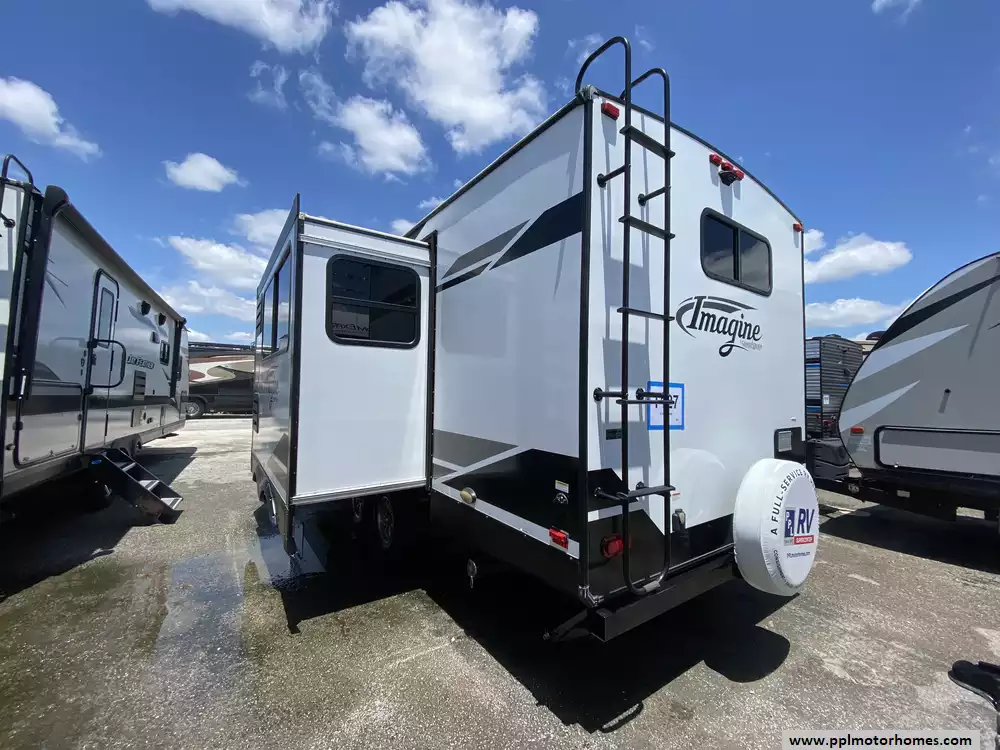 This 2020 Imagine 2150RB has an Electric Tongue Jack, 1 Slide-out, 1 Ducted Air Conditioner, Double Door Gas/110v Dometic Refrigerator, Automatic Main Awning, Outside Speakers, TV, DVD Player, Outside Shower, Microwave, 3 Burner Range, Oven