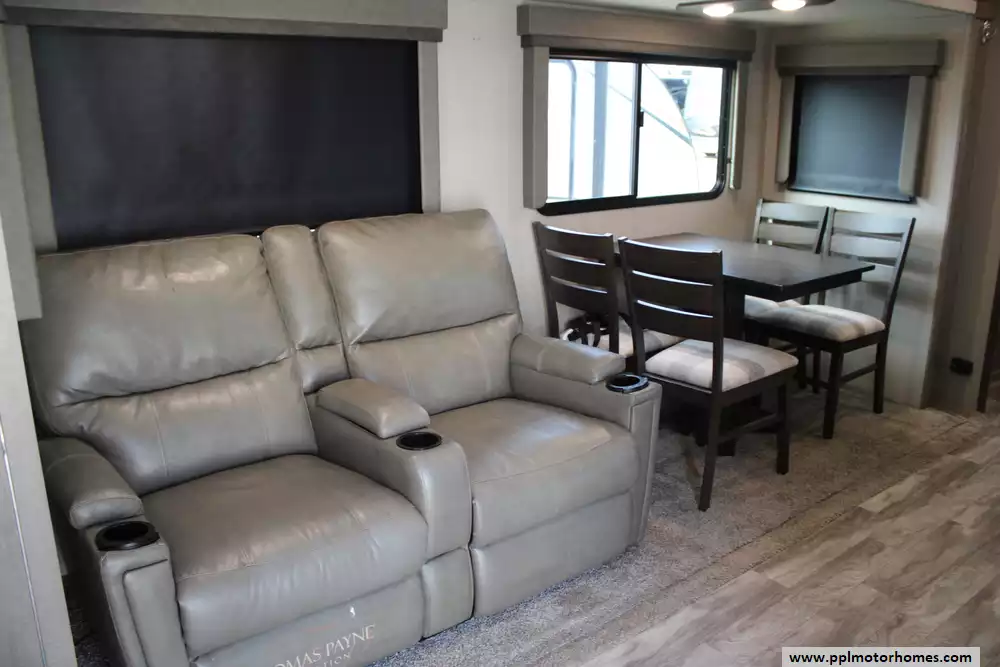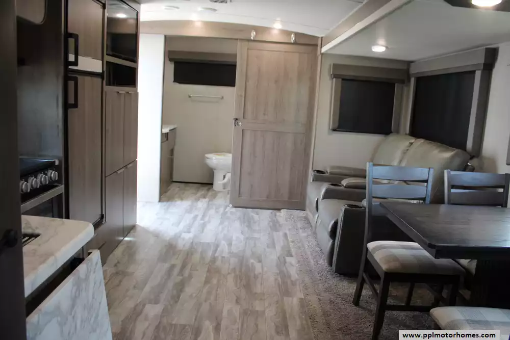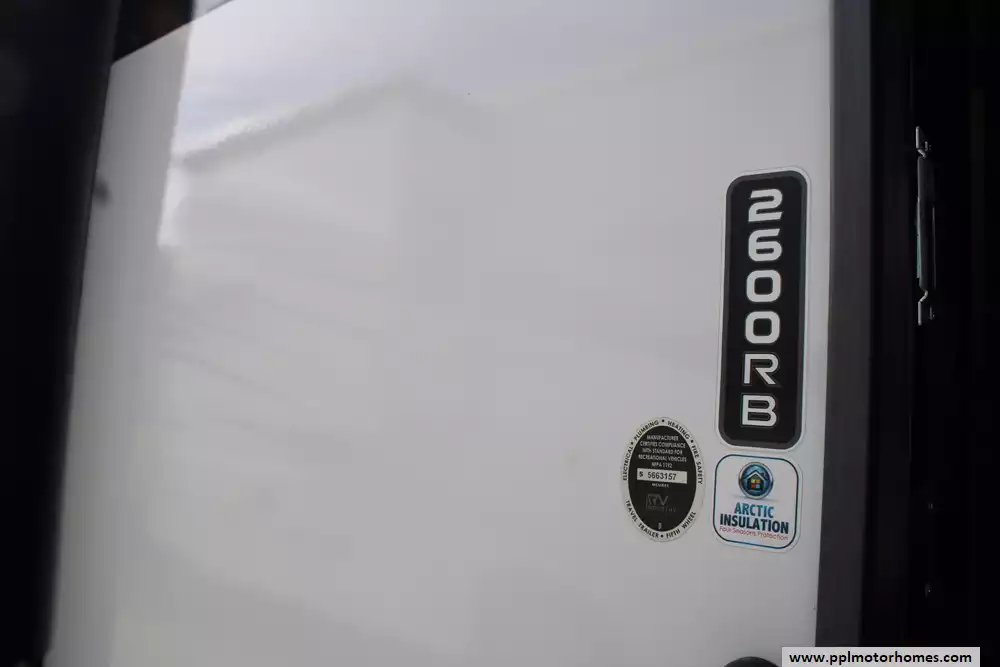 The 2020 Grand Design Imagine 2600RB is a thoughtfully designed travel trailer that emphasizes comfort and functionality in a compact, easy-to-tow package, measuring just under 30 feet in length and sleeping up to six people. Its standout feature is the spacious rear bathroom, which spans the full width of the trailer and includes a large residential-style shower, vanity, and ample storage, while the central living area offers a slide-out with theater seating, a free-standing dinette, and a fully equipped kitchen with solid-surface countertops, a three-burner range, oven, microwave, and mid-size refrigerator. Up front, a private master bedroom with a queen bed and sliding door provides separation and comfort, and the unit is built with aluminum framing and fiberglass sidewalls for durability without excessive weight.