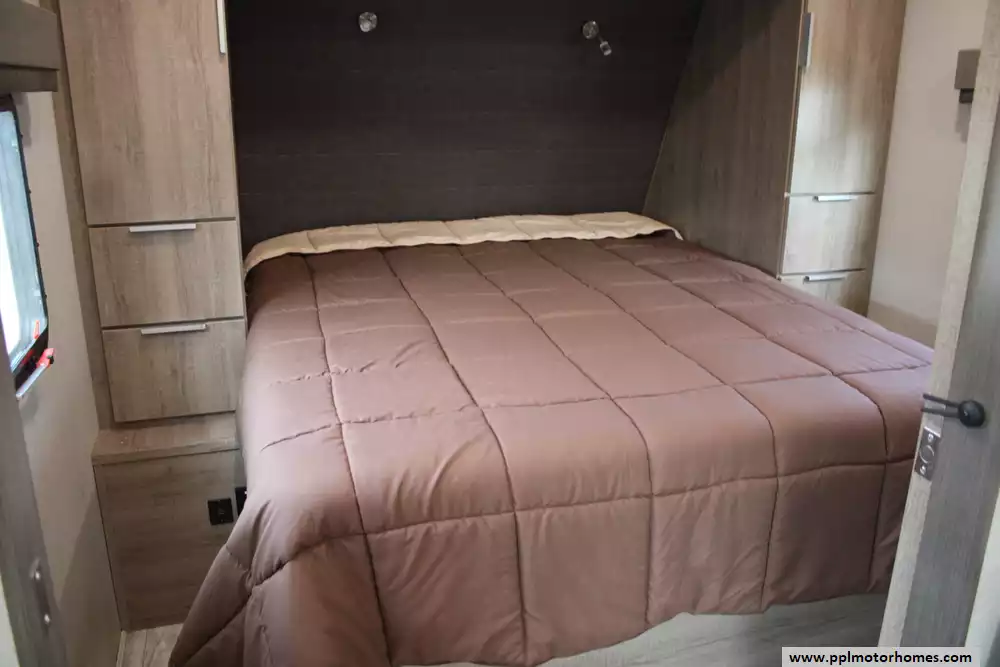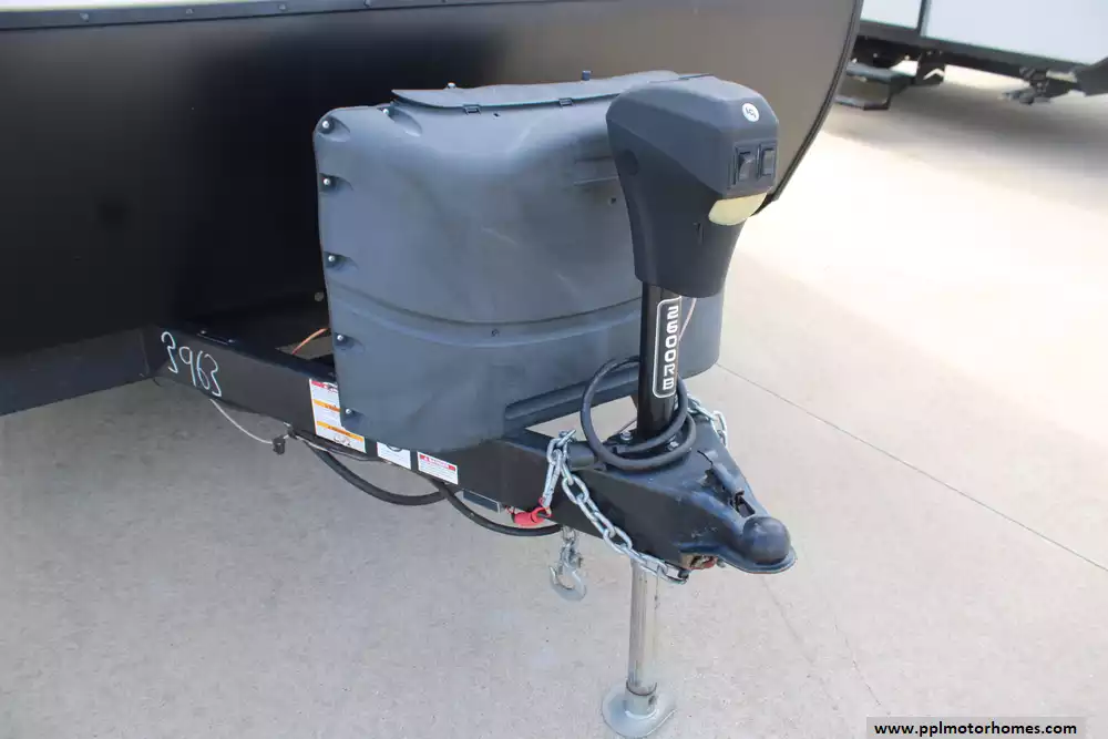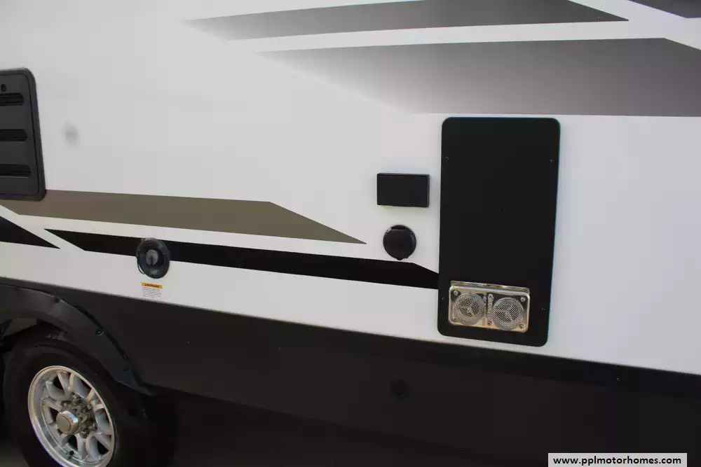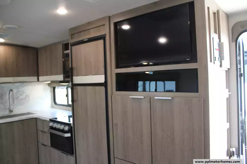 Additional highlights include ducted air conditioning, a heated and enclosed underbelly for extended-season camping, a large power awning, pass-through storage, and modern conveniences like solar prep and upgraded entertainment systems, making it a versatile option for couples or small families seeking a balance of livability and towability.