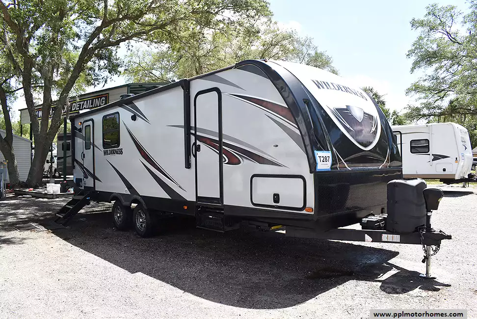 This 2020 Wilderness by Heartland 2575RK has an Electric Tongue Jack, 1 Slide-out, 1 Ducted Air Conditioner, Double Door Gas/12V Dometic Refrigerator, Automatic Main Awning, Outside Speakers, TV, Outside Shower, Microwave, 3 Burner Range, Oven