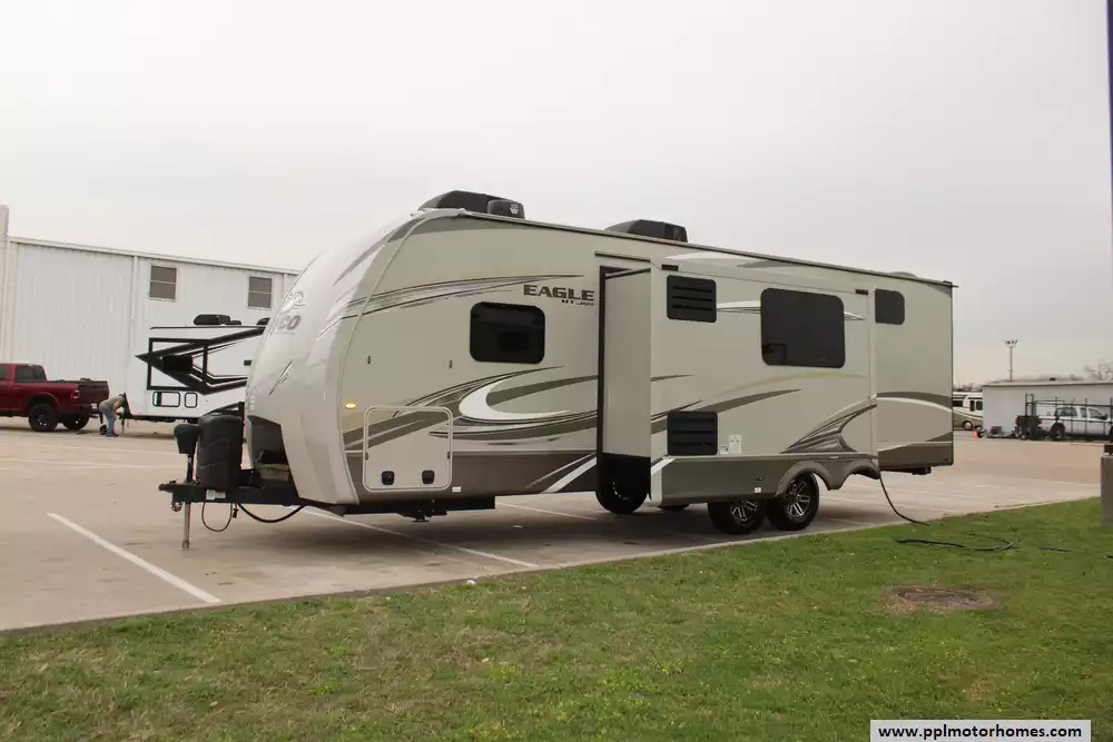 The highlight of this 2020 Eagle HT 264BHOK is the rear bunkhouse, providing a dedicated space for the younger travelers. The bunkhouse typically features multiple bunks, creating a fun and comfortable environment for children or guests. The clever use of space ensures that this area is both functional and inviting. Features Include...Electric Tongue Jack, 1 Slide-out, 2 Ducted Air Conditioners, Double Door Gas/110v Dometic Refrigerator, Automatic Main Awning And Slide Awning, Outside Entertainment System, 2 TVs, DVD Player, Outdoor Kitchen, Outside Shower, Fireplace, Microwave, 3 Burner Range, and Oven. The 2020 Eagle HT 264BHOK is a well-designed and family-friendly travel trailer, offering a comfortable and stylish home away from home. With its thoughtful layout, modern amenities, and quality construction, it caters to the needs of both experienced and first-time RV enthusiasts seeking an enjoyable camping experience.