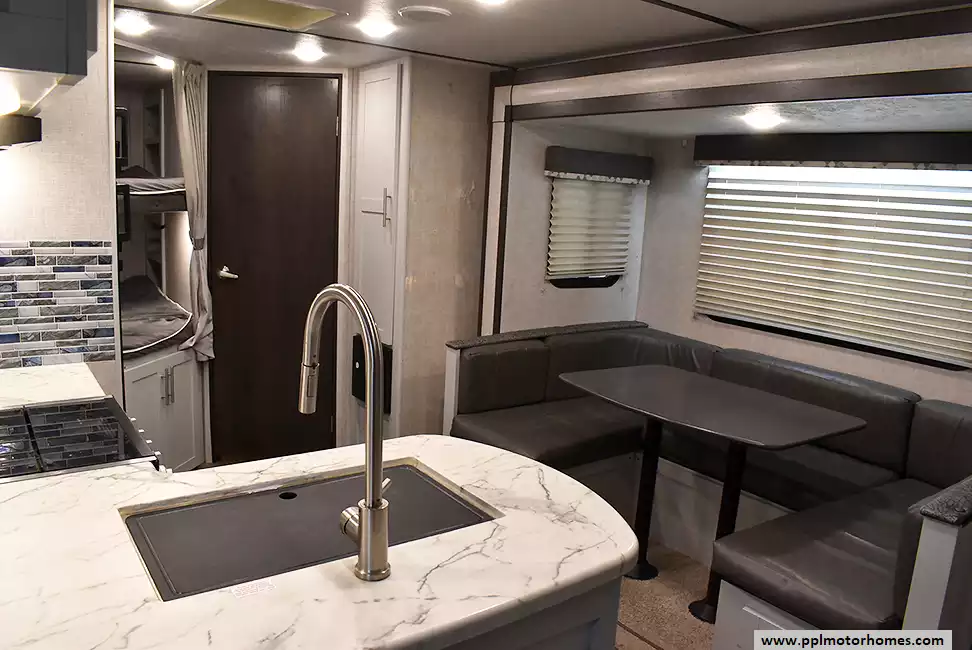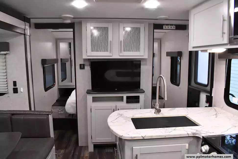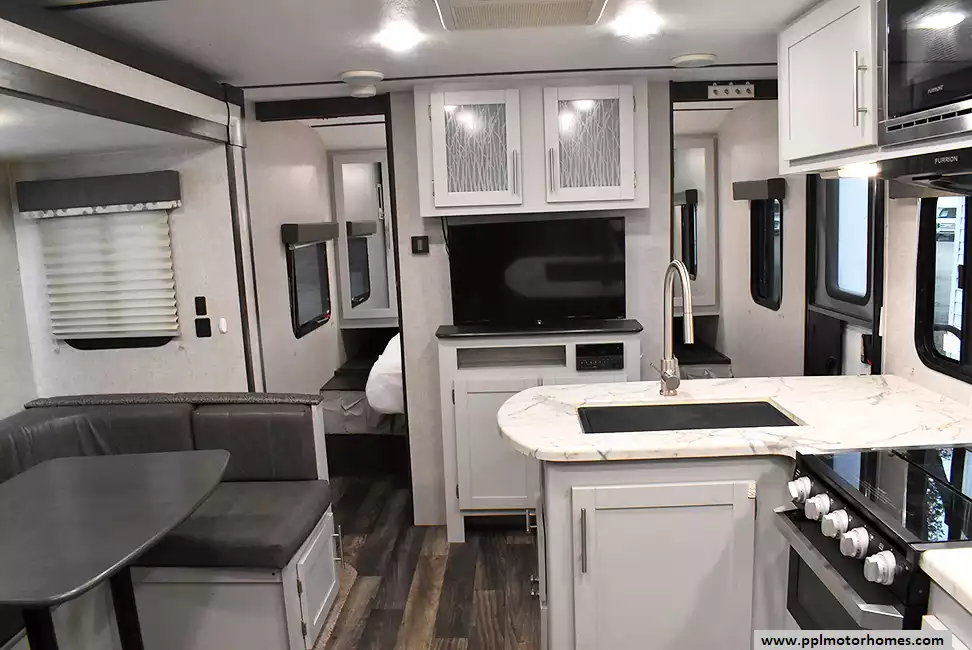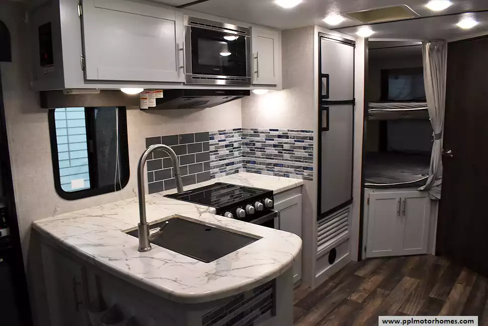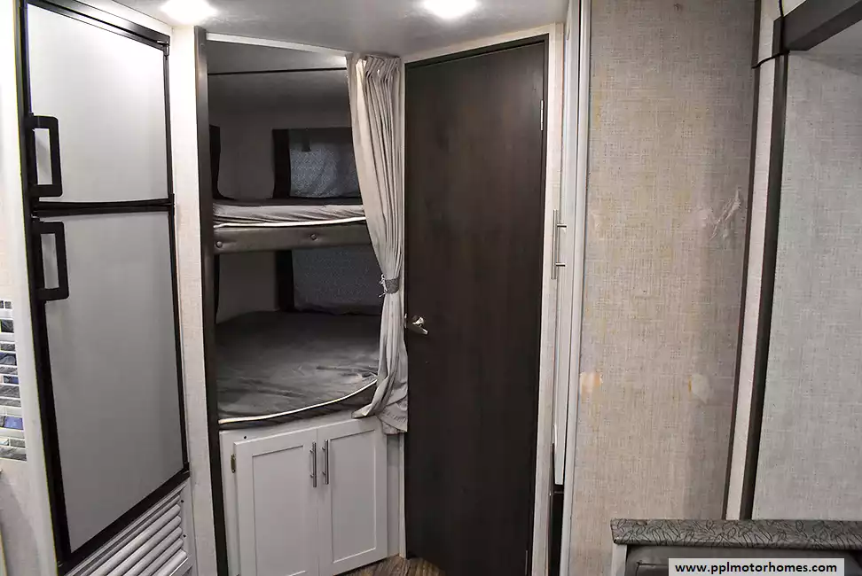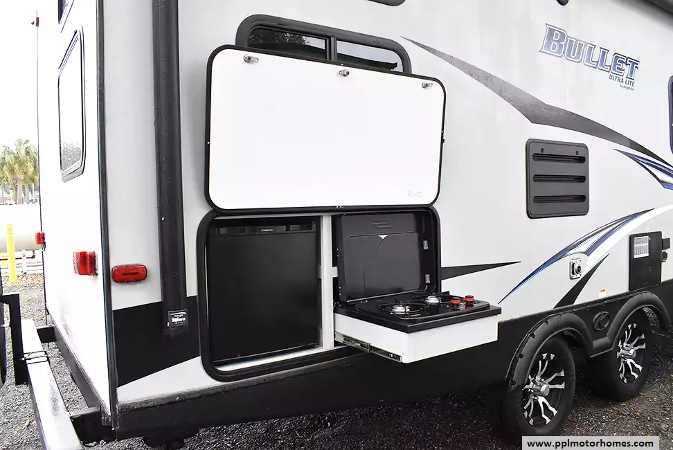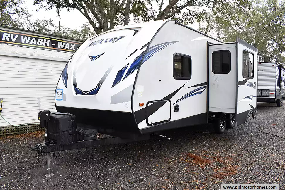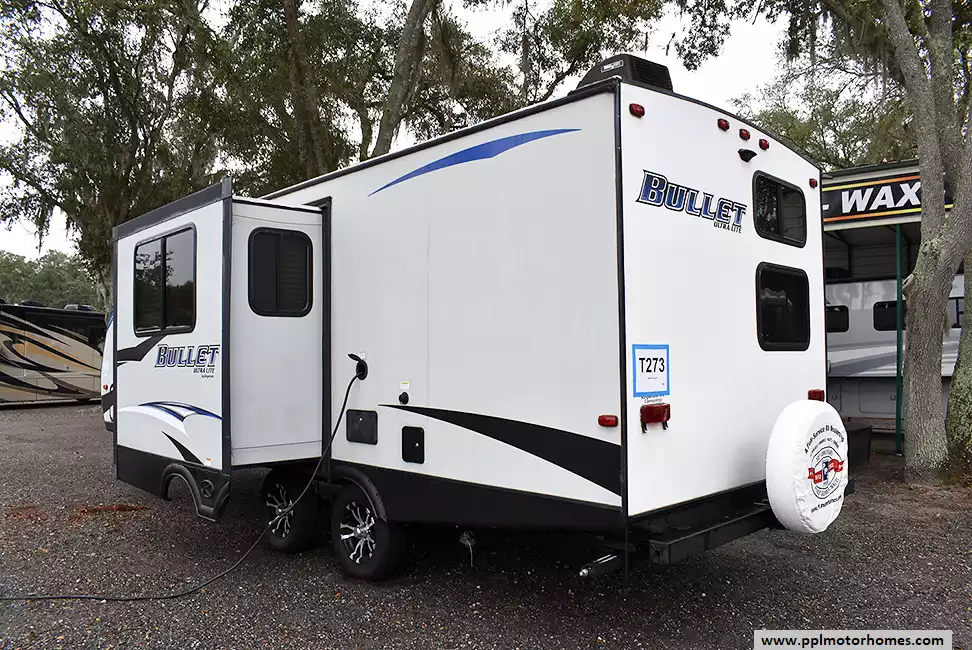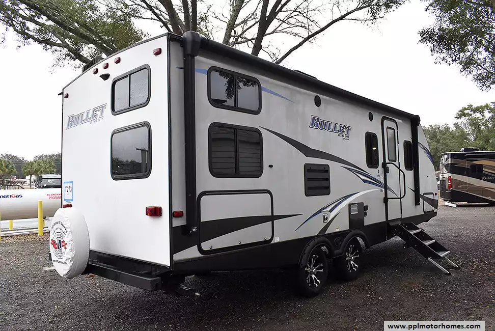 This 2020 Bullet M243BHSWE has an Electric Tongue Jack, 1 Slide-out, 1 Ducted Air Conditioner, Double Door Gas/12v Dometic Refrigerator, Automatic Main Awning, Outside Speakers, TV, Outside Shower, Microwave, 3 Burner Range, Oven
