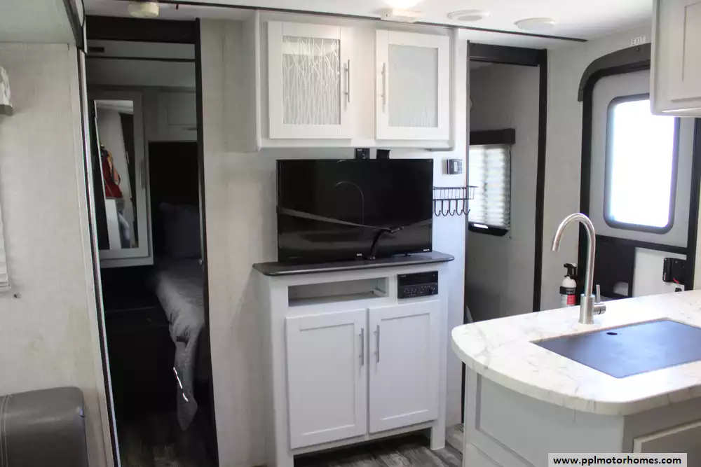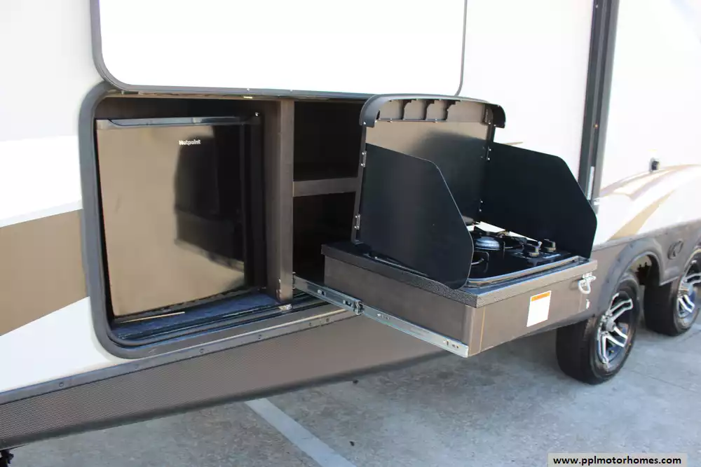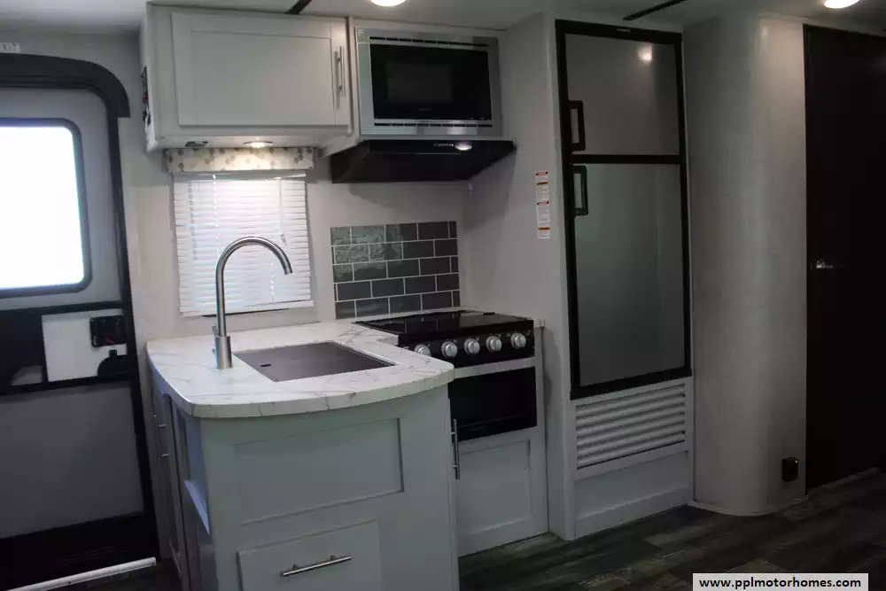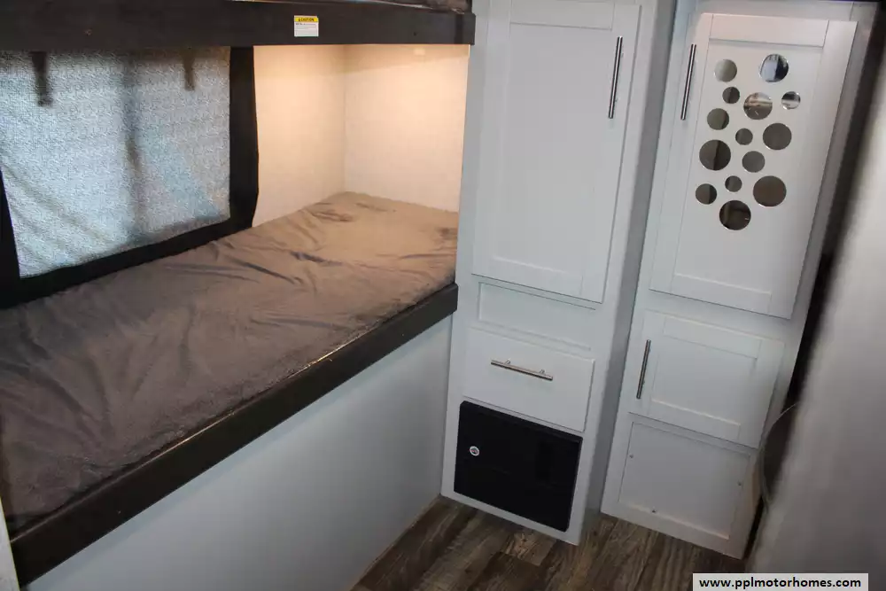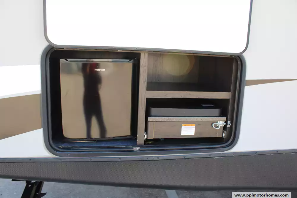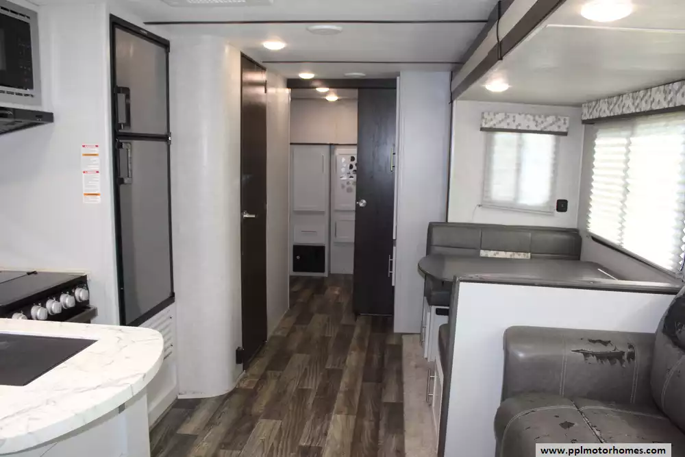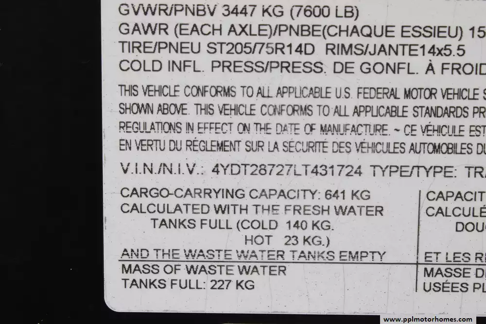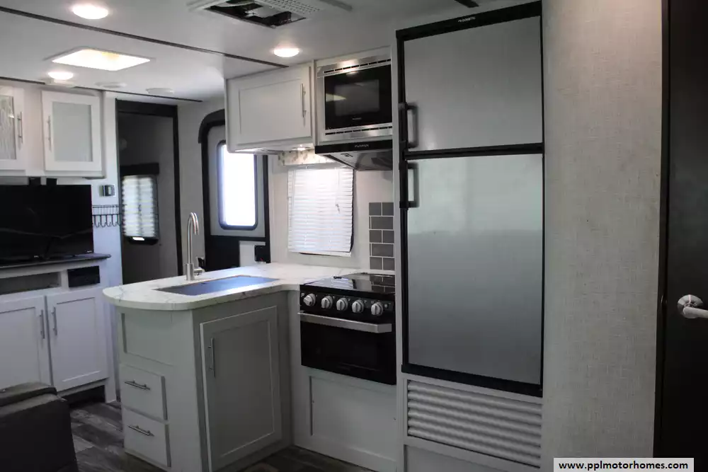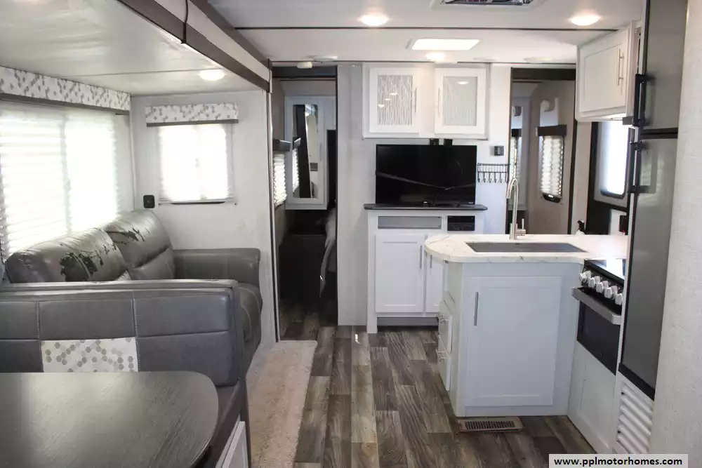 Specs: Length: 33.83 ft., Width: 8 ft., Height: 10.67 ft., Payload Capacity: 1,763 lbs., Total Fresh Water Tank Capacity: 43 gal., Total Gray Water Tank Capacity: 30 gal., Total Black Water Tank Capacity: 30 gal., Total Number of Propane Tanks: 2, Total Propane Tank Capacity: 40 lbs.