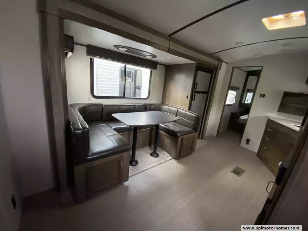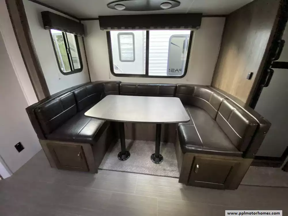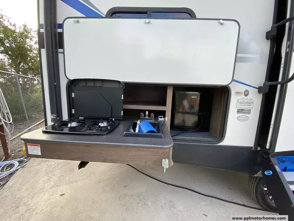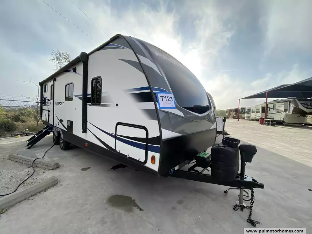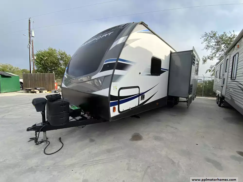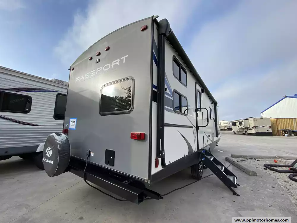 This 2020 Passport 2600BH has an Electric Tongue Jack, 1 Slide-out, 1 Ducted Air Conditioner, Double Door Gas/110v Norcold Refrigerator, Automatic Main Awning, Outside Speakers, TV, DVD Player, Outdoor Kitchen, Outside Shower, Microwave, 3 Burner Range, Oven
