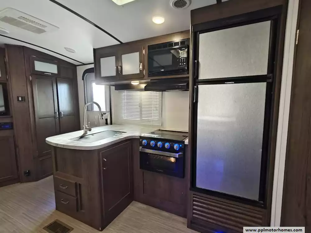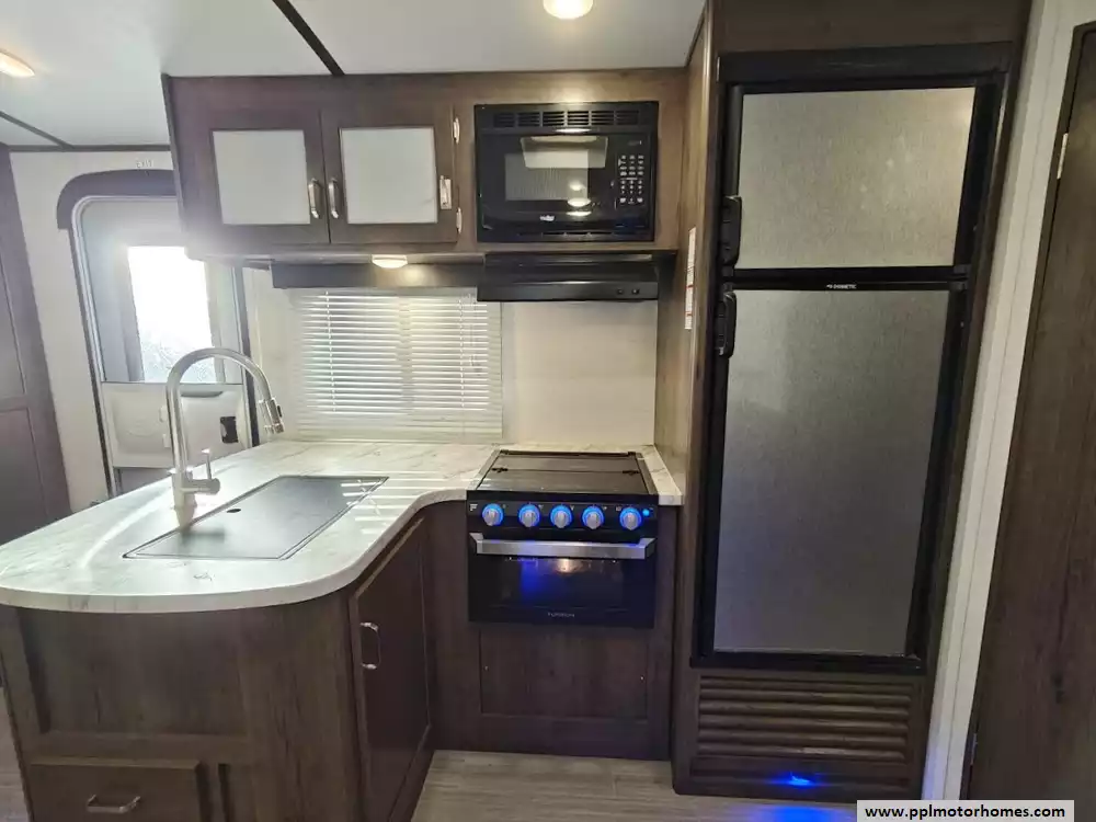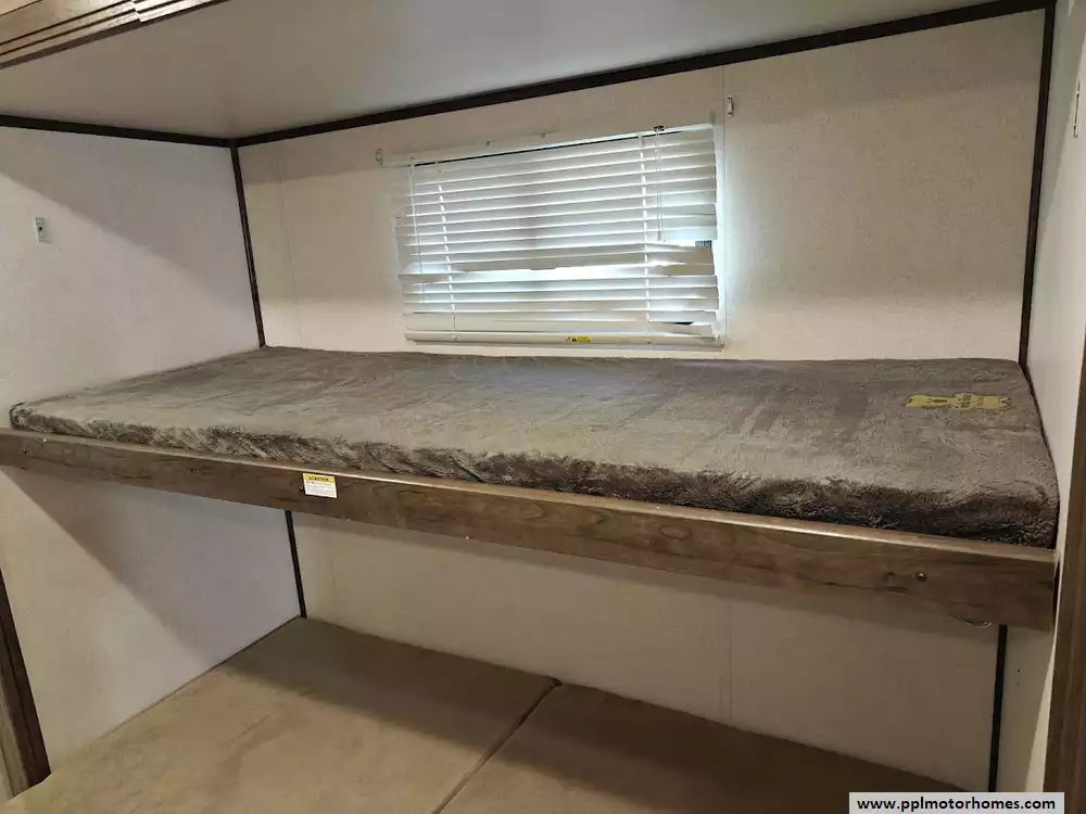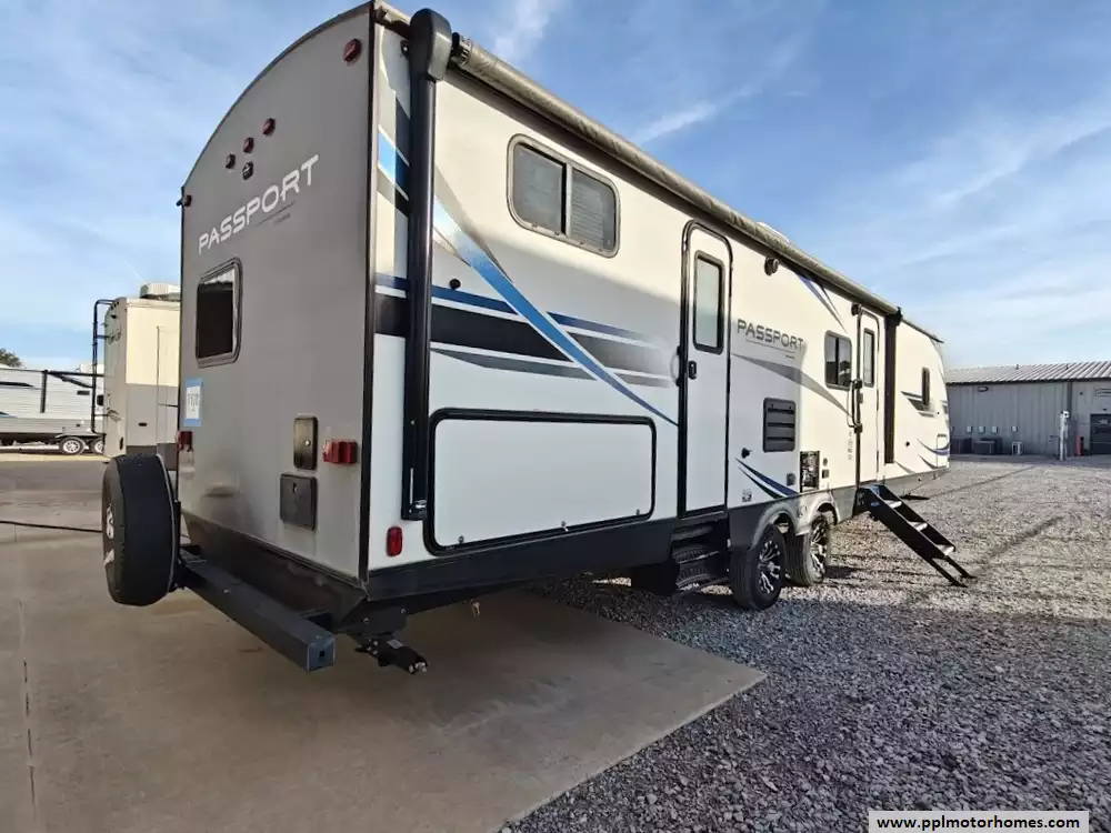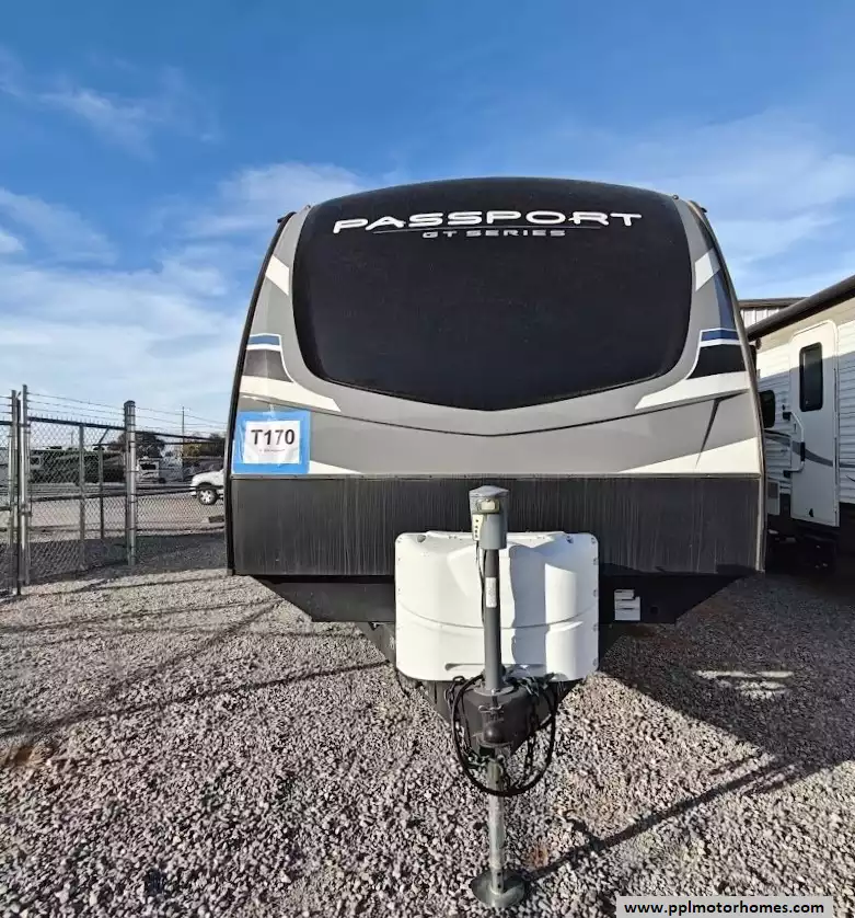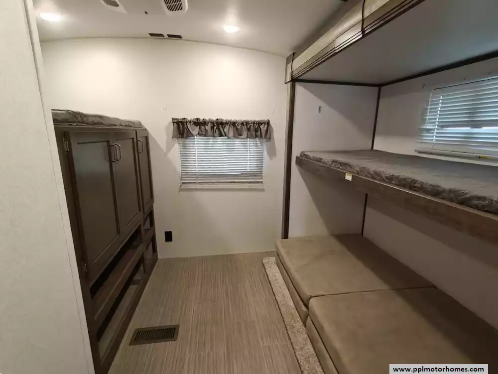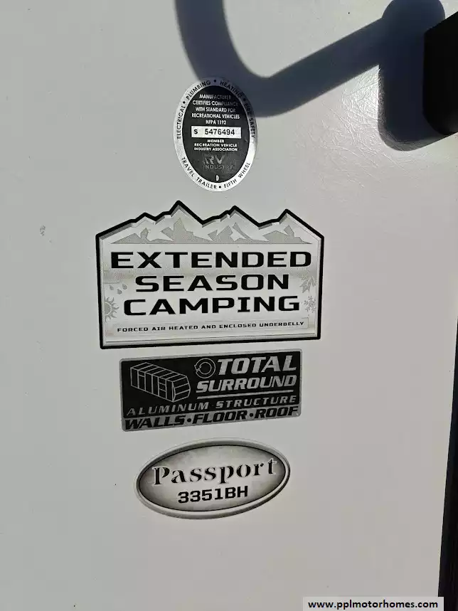 The 2020 Keystone Passport 3351BH GT Series is a bunkhouse travel trailer known for being spacious and family-friendly, featuring a bath-and-a-half design, two entry doors, and an outdoor kitchen. The floor plan includes multiple sleeping areas, the master bedroom, separate rear bunkhouse with two bunks and a trifold memory foam sofa sleeper, a U-shaped dinette and a tri-fold sofa in the main living area. The Passport 3351BH is notable for its "bath and a half" design, providing a full main bathroom and a convenient half-bath, which is a significant advantage for large groups and families. The bathroom includes a spacious shower with a tub surround and built-in shelves for storage, a pedestal foot-flush toilet, a solid wood medicine cabinet with a mirror, and a power exhaust fan The main kitchen inside the RV features a double door refrigerator, 3-burner rang, oven, microwave and range hood. The outdoor kitchen features a 2 burner cooktop and refridgerator. The area features ample storage, including a large pantry and a coat closet, along with additional cabinetry to help keep the space organized.