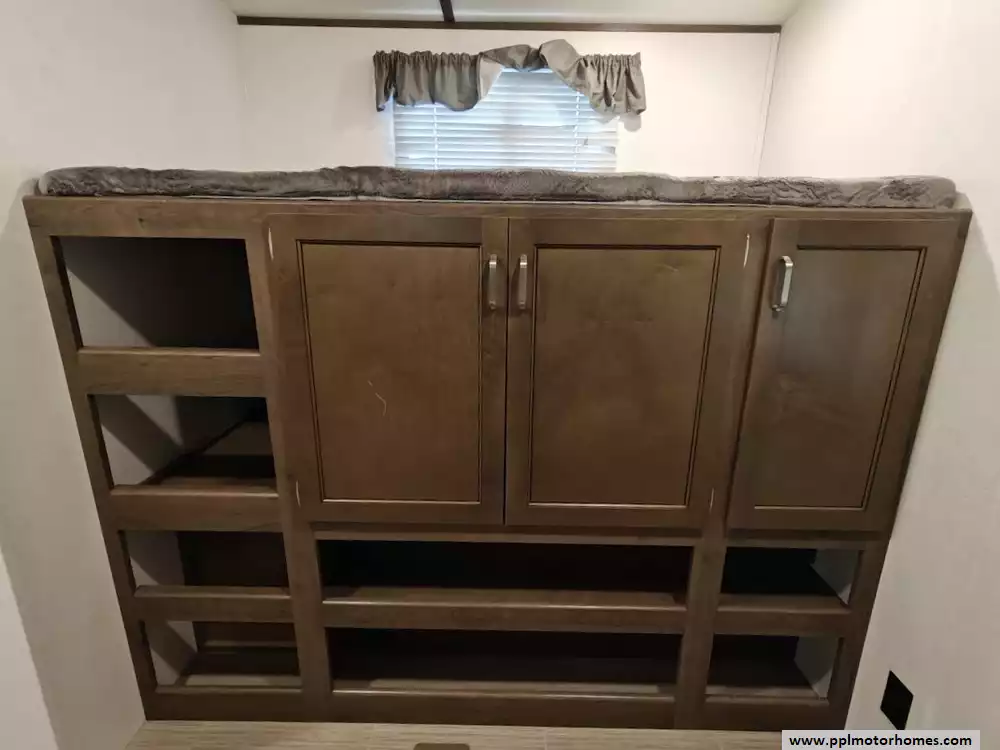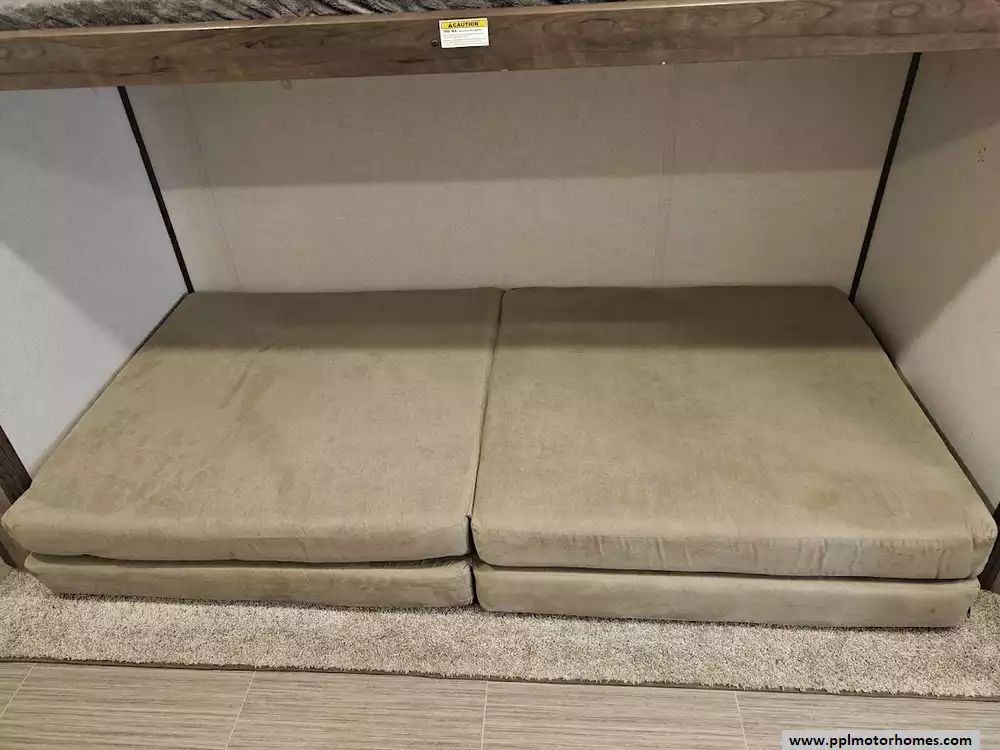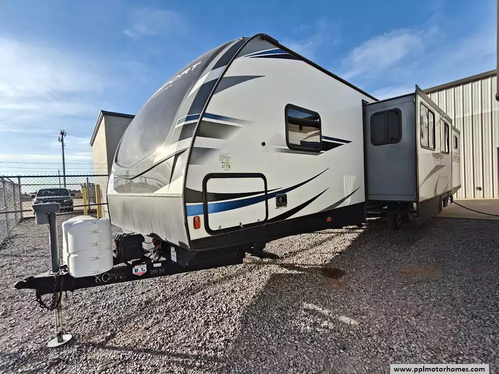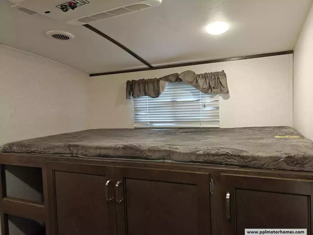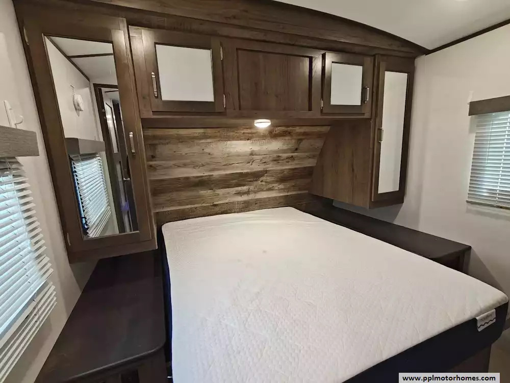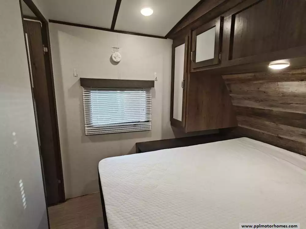 The 2020 Keystone Passport 3351BH GT Series is a bunkhouse travel trailer known for being spacious and family-friendly, featuring a bath-and-a-half design, two entry doors, and an outdoor kitchen. The floor plan includes multiple sleeping areas, the master bedroom, separate rear bunkhouse with two bunks and a trifold memory foam sofa sleeper, a U-shaped dinette and a tri-fold sofa in the main living area. The Passport 3351BH is notable for its "bath and a half" design, providing a full main bathroom and a convenient half-bath, which is a significant advantage for large groups and families. The bathroom includes a spacious shower with a tub surround and built-in shelves for storage, a pedestal foot-flush toilet, a solid wood medicine cabinet with a mirror, and a power exhaust fan The main kitchen inside the RV features a double door refrigerator, 3-burner rang, oven, microwave and range hood. The outdoor kitchen features a 2 burner cooktop and refridgerator. The area features ample storage, including a large pantry and a coat closet, along with additional cabinetry to help keep the space organized.