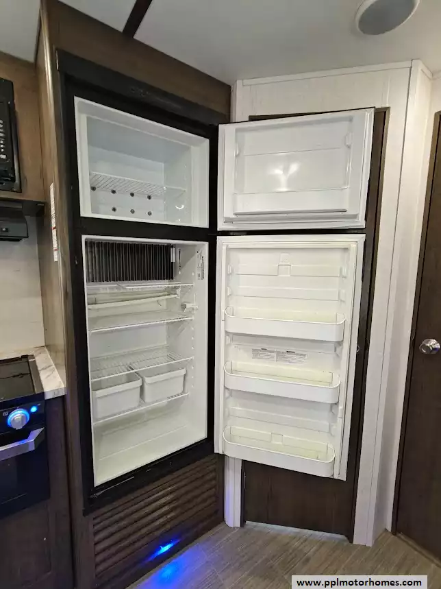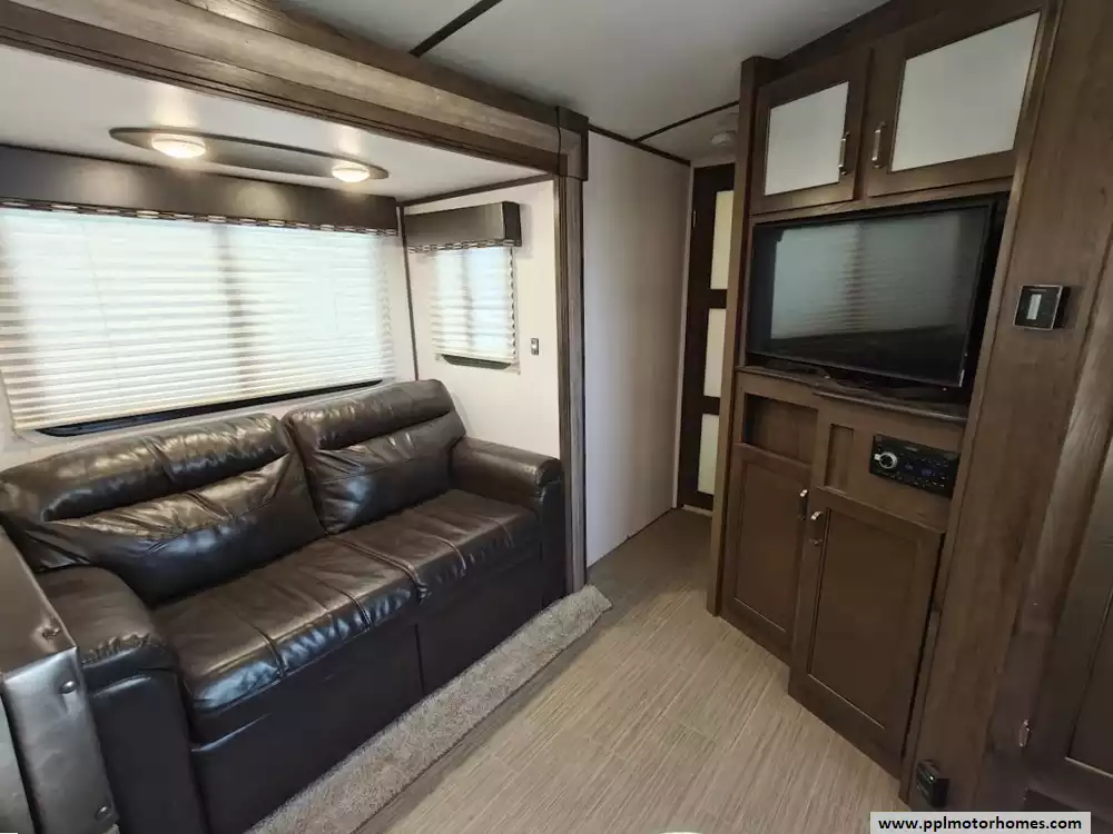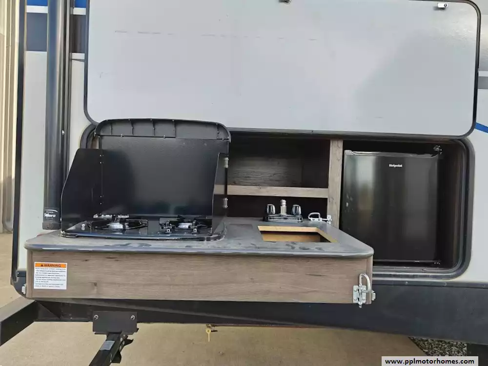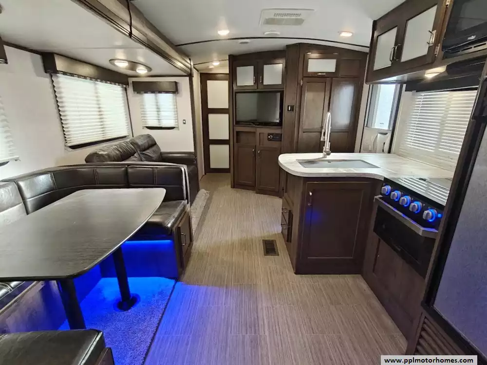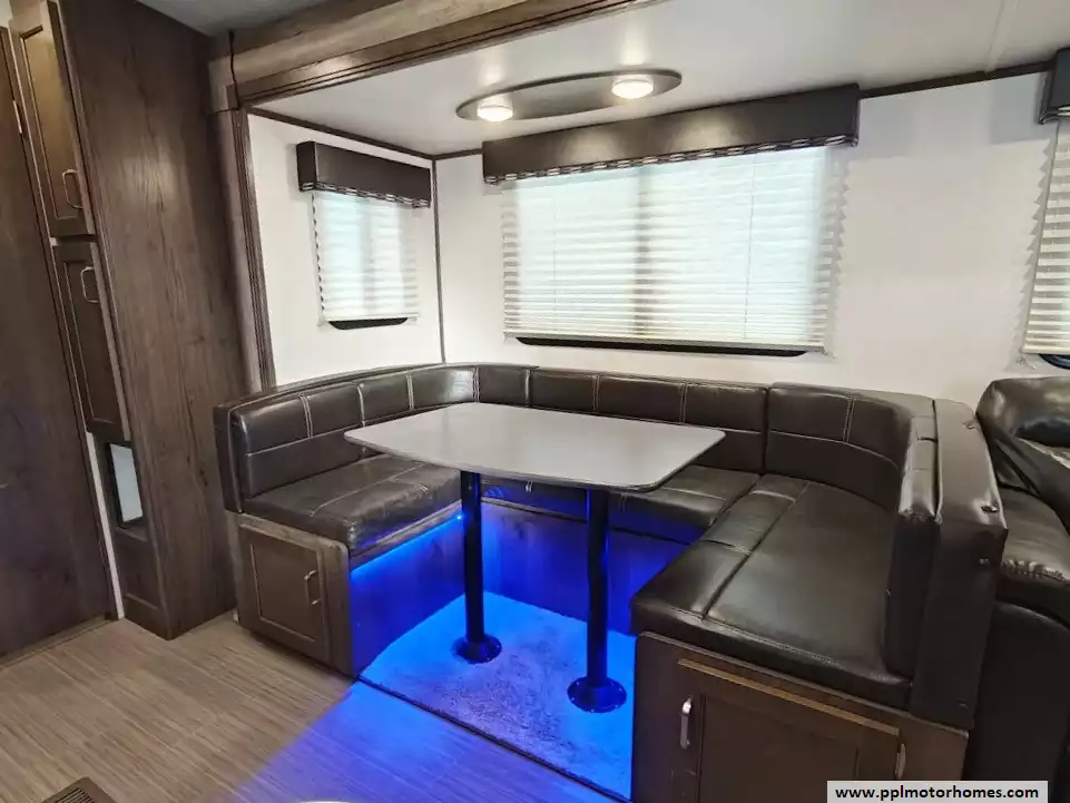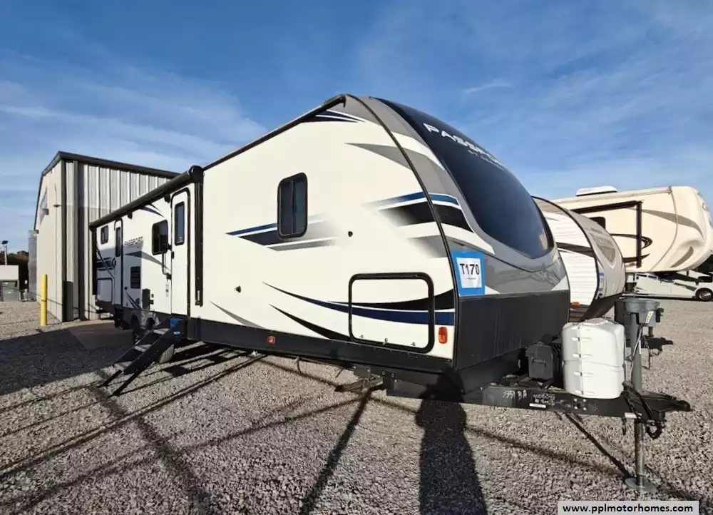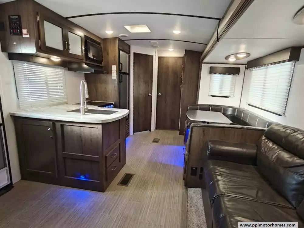 The 2020 Keystone Passport 3351BH GT Series is a bunkhouse travel trailer known for being spacious and family-friendly, featuring a bath-and-a-half design, two entry doors, and an outdoor kitchen. The floor plan includes multiple sleeping areas, the master bedroom, separate rear bunkhouse with two bunks and a trifold memory foam sofa sleeper, a U-shaped dinette and a tri-fold sofa in the main living area. The Passport 3351BH is notable for its "bath and a half" design, providing a full main bathroom and a convenient half-bath, which is a significant advantage for large groups and families. The bathroom includes a spacious shower with a tub surround and built-in shelves for storage, a pedestal foot-flush toilet, a solid wood medicine cabinet with a mirror, and a power exhaust fan The main kitchen inside the RV features a double door refrigerator, 3-burner rang, oven, microwave and range hood. The outdoor kitchen features a 2 burner cooktop and refridgerator. The area features ample storage, including a large pantry and a coat closet, along with additional cabinetry to help keep the space organized.