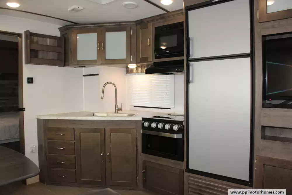 Specs: Length: 31.5 ft., Width: 8 ft., Height: 10.8 ft., Payload Capacity: 1,430 lbs., Total Fresh Water Tank Capacity: 43 gal., Total Gray Water Tank Capacity: 76 gal., Total Black Water Tank Capacity: 38 gal., Number of Propane Tanks: 2, Total Propane Tank Capacity: 40 lbs.