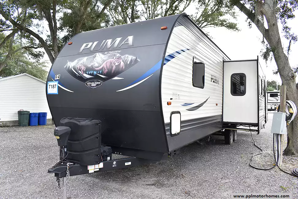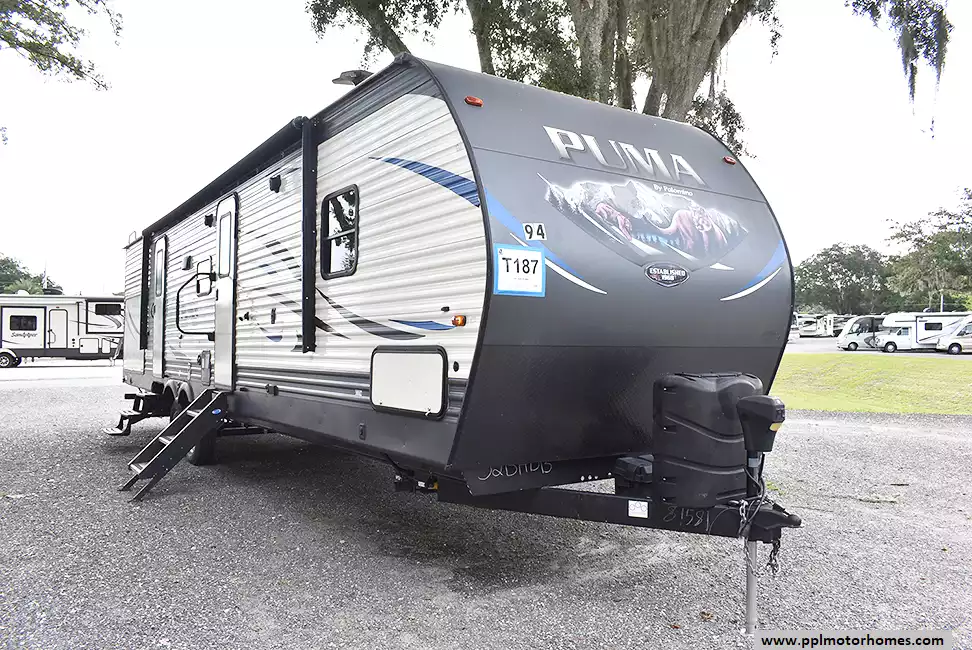 This 2020 Puma 32BHDB has an Electric Tongue Jack, 2 Slide-outs, 2 Ducted Air Conditioners, Double Door 12v Everchill Refrigerator (Additional Refrigerator Present), Automatic Main Awning, Outside Speakers, Outdoor Grill, Outdoor Kitchen, Outside Shower, Microwave, 3 Burner Range, Oven