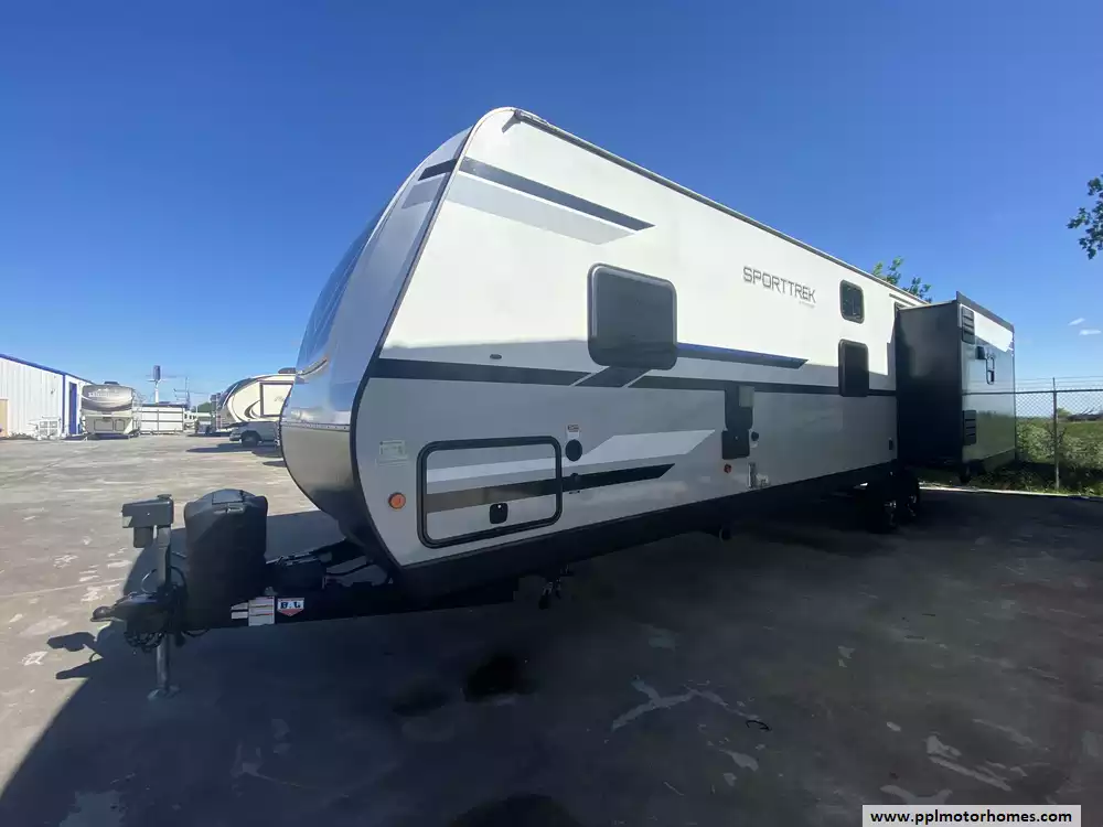 This 2020 Sporttrek 342VMB has an Electric Tongue Jack, 2 Slide-outs, 1 Ducted Air Conditioner, Double Door Gas/110v Norcold Refrigerator (Additional Refrigerator Present), Automatic Main Awning, Outside Speakers, TV, DVD Player, Outside Shower, Fireplace, Microwave, 3 Burner Range, Oven