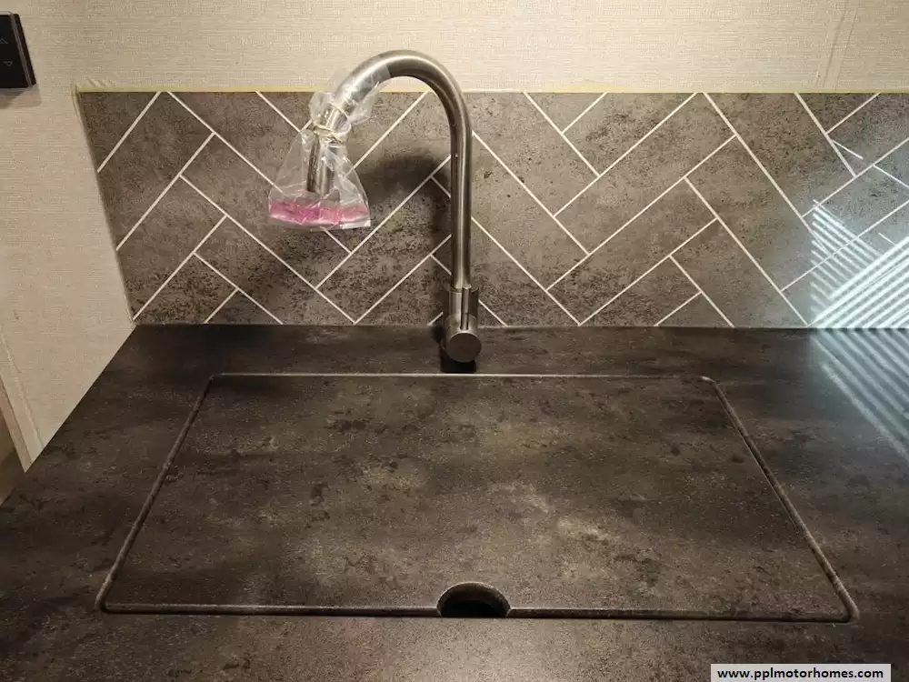 It comes standard with a solar panel, a power tongue jack, an enclosed underbelly, and an outdoor camp kitchen with a small fridge and griddle.