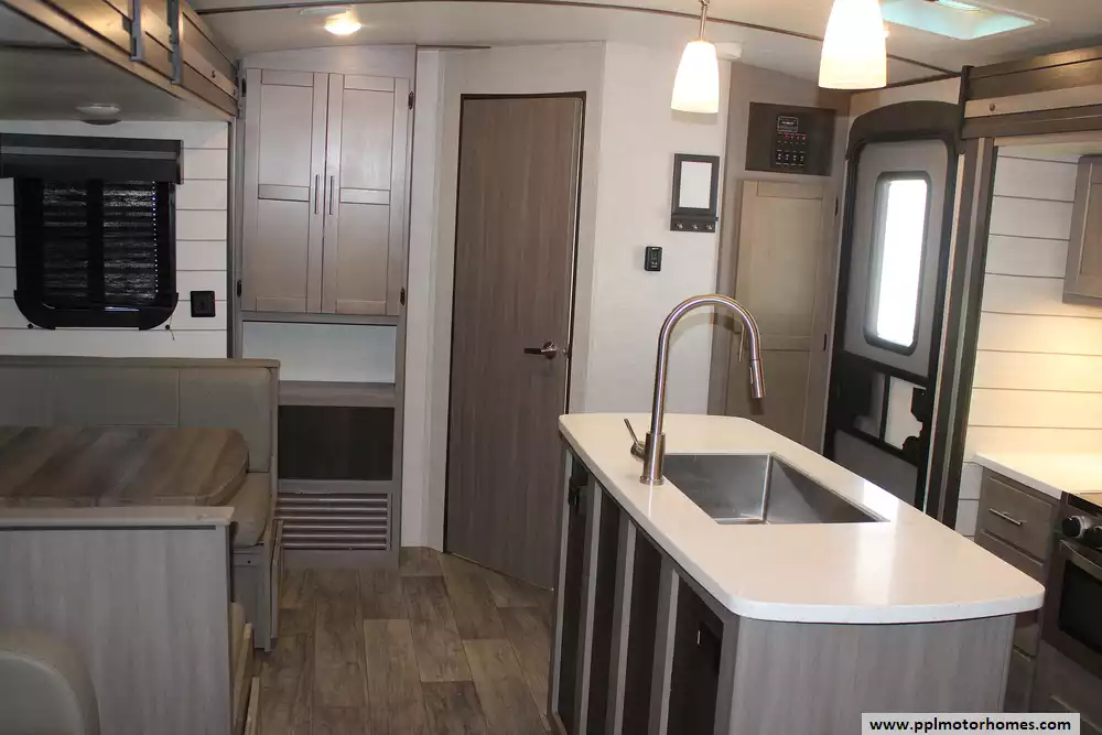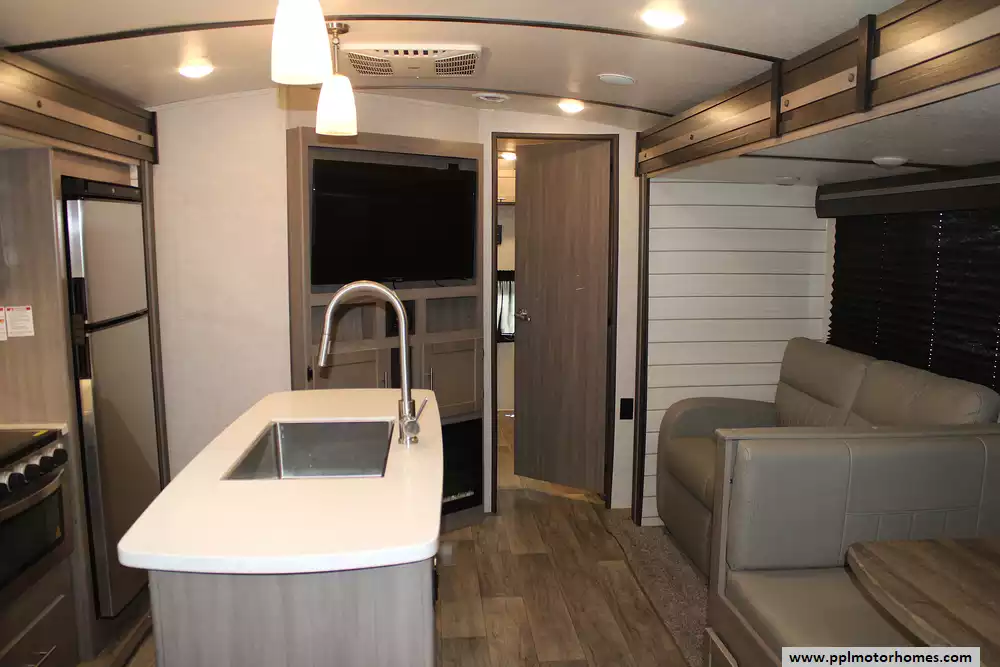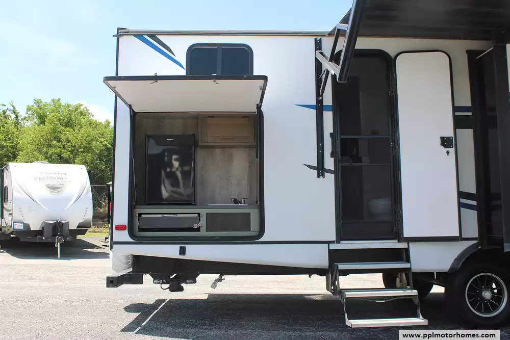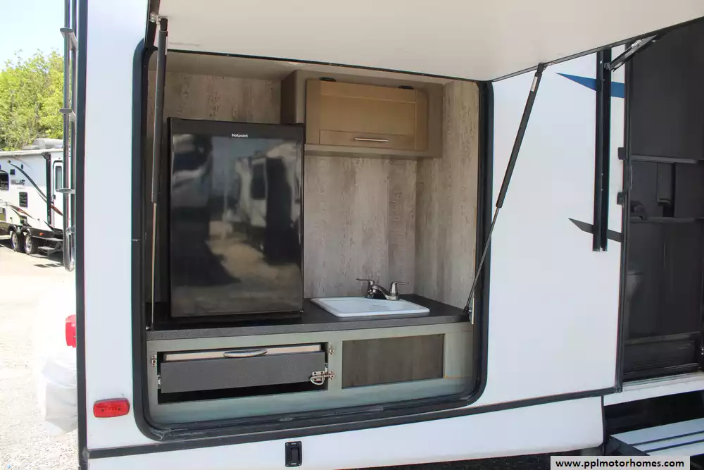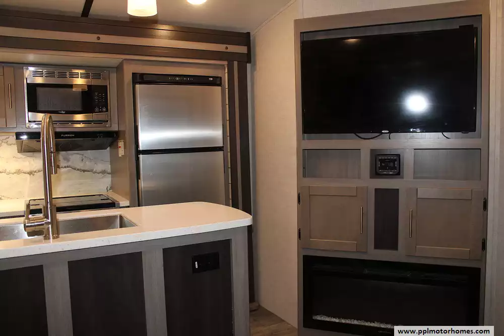 Enjoy a full kitchen with center island, 3-burner cooktop, large 12V refrigerator, and ample counter space, complemented by an outdoor kitchen with sink and fridge for all your outdoor cooking needs. The main living area boasts a large booth dinette, tri-fold sofa, fireplace, and entertainment center. Ideal for relaxing after a full day of adventure. The walk-through full bath provides direct access to the master bedroom, adding both comfort and functionality.