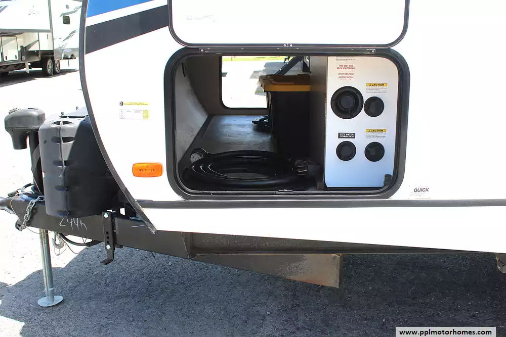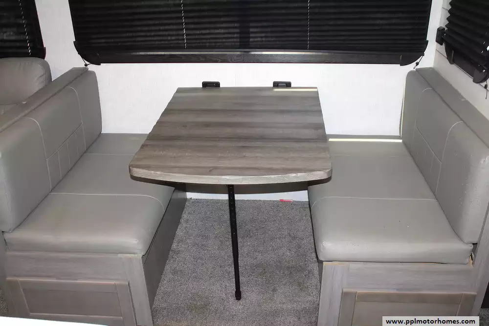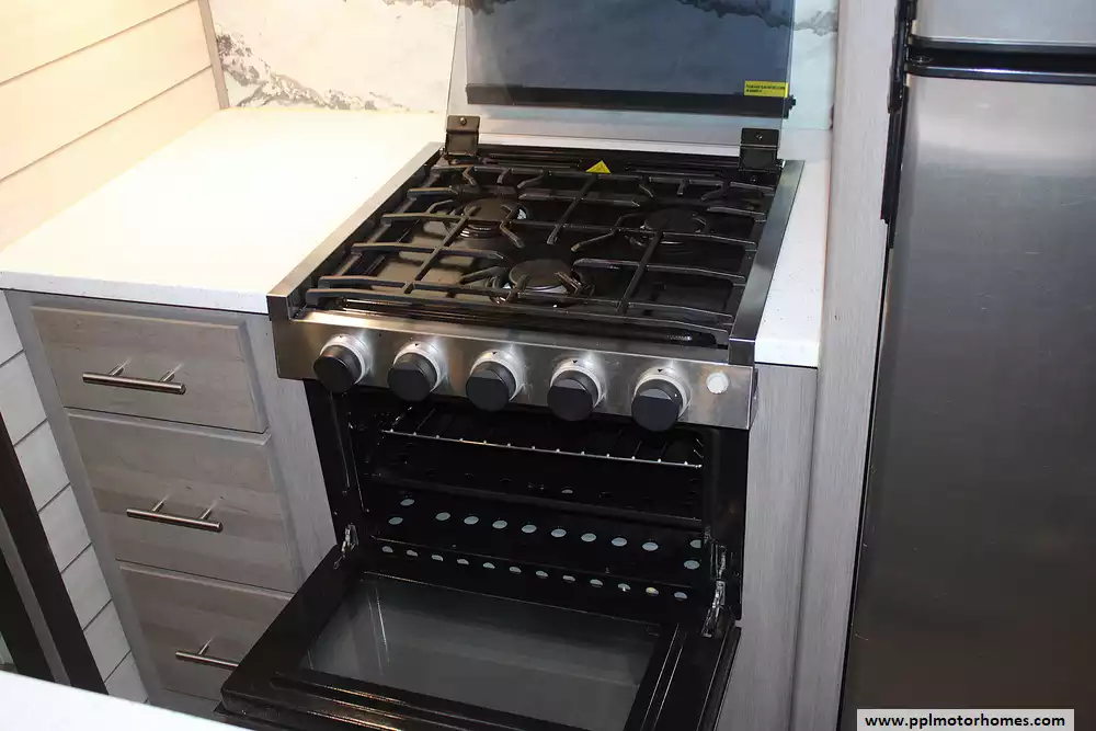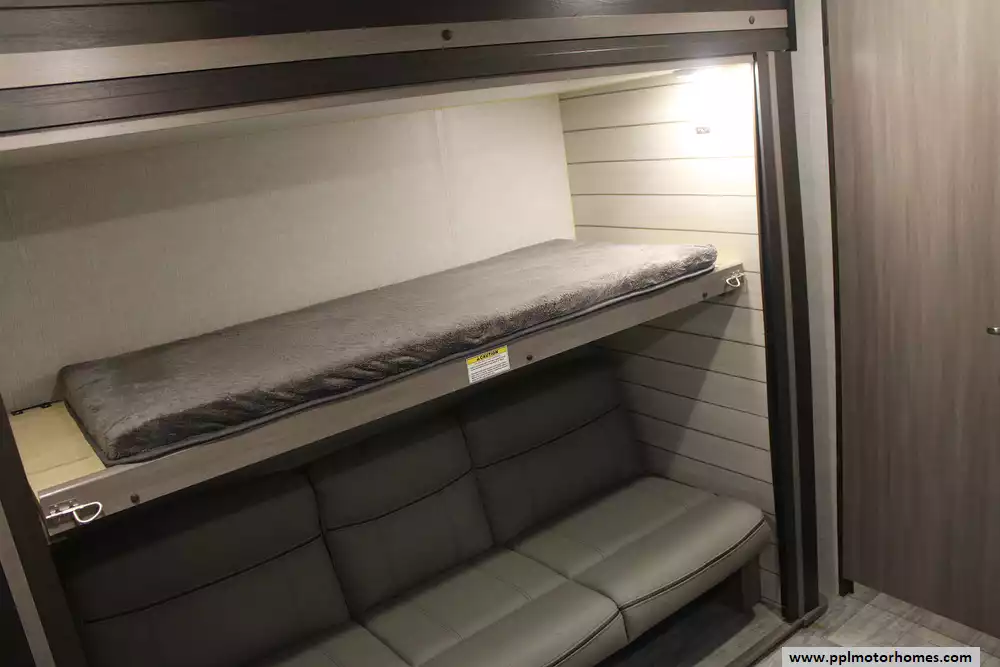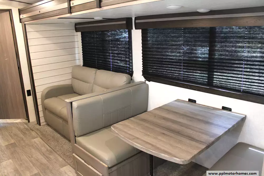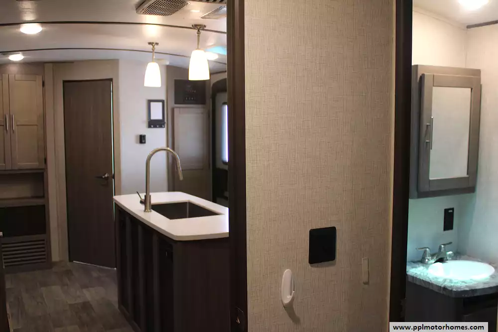 Enjoy a full kitchen with center island, 3-burner cooktop, large 12V refrigerator, and ample counter space, complemented by an outdoor kitchen with sink and fridge for all your outdoor cooking needs. The main living area boasts a large booth dinette, tri-fold sofa, fireplace, and entertainment center. Ideal for relaxing after a full day of adventure. The walk-through full bath provides direct access to the master bedroom, adding both comfort and functionality.