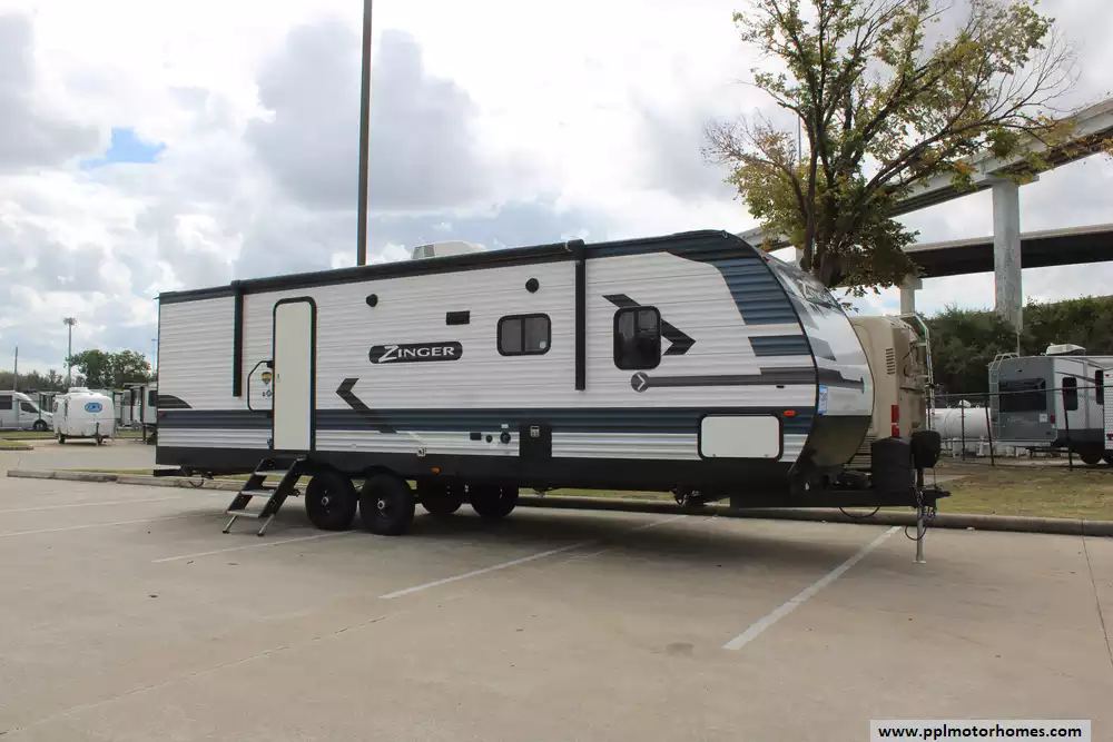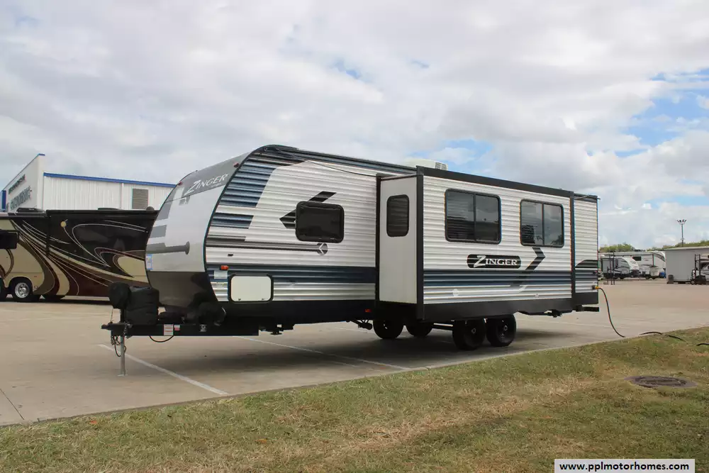 This 2021 Zinger 280RB is a mid-size travel trailer designed for families or couples who like a mix of comfort and good value. Comforts Include...Electric Tongue Jack, 1 Ducted Air Conditioner, Double Door Refrigerator, Automatic Main Awning, Outside Speakers, 2 TVs, Outside Shower, Fireplace, Microwave, 3 Burner Range, and Oven.