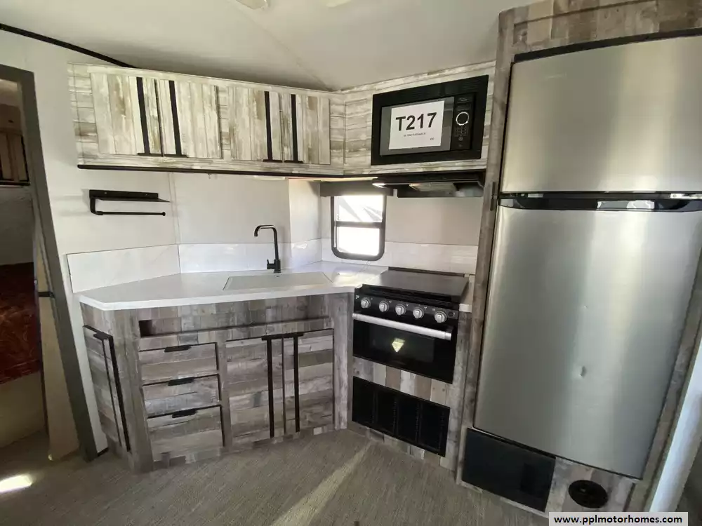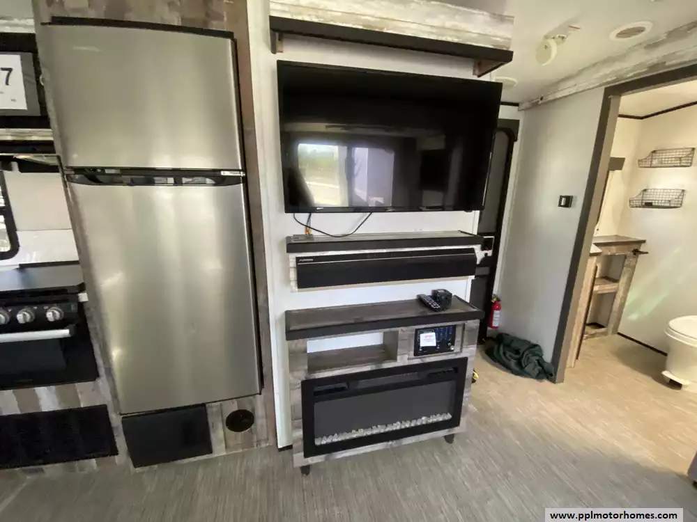 This unit comes fully equipped for maximum comfort and effortless setup, featuring an electric tongue jack and an automatic main awning to get your campsite ready in minutes. The interior is a true retreat, kept perfectly cool by two ducted air conditioners and warmed by the cozy ambiance of an electric fireplace. The gourmet-ready kitchen includes a three-burner range, oven, microwave, and a double-door 12v Everchill refrigerator complete with a rare in-fridge ice maker. Whether you are relaxing inside with the TV or enjoying the outdoors through the integrated outside speakers, this single-slide Radiance 25RB provides the premium amenities and reliable performance today's adventurers demand.