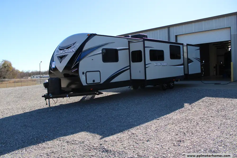This 2021 Shadow 325BHS has an Electric Tongue Jack, 2 Slide-outs, 2 Ducted Air Conditioners, Double Door Gas/110v Norcold Refrigerator, Automatic Main Awning, Outside Speakers, Outdoor Kitchen, Microwave, 3 Burner Range, Oven