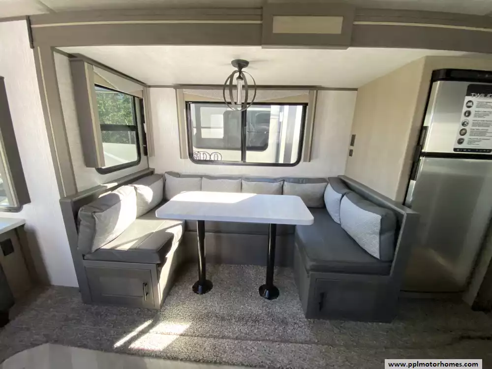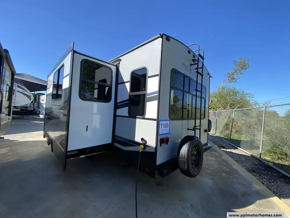 This 2021 Twilight Signature 2500 has an Electric Tongue Jack, 1 Slide-out, 1 Ducted Air Conditioner, Double Door 12v Norcold Refrigerator, Automatic Main Awning, Outside Speakers, TV, DVD Player, Outside Shower, Microwave, 3 Burner Range, Oven, Electric Stabilizers Jacks