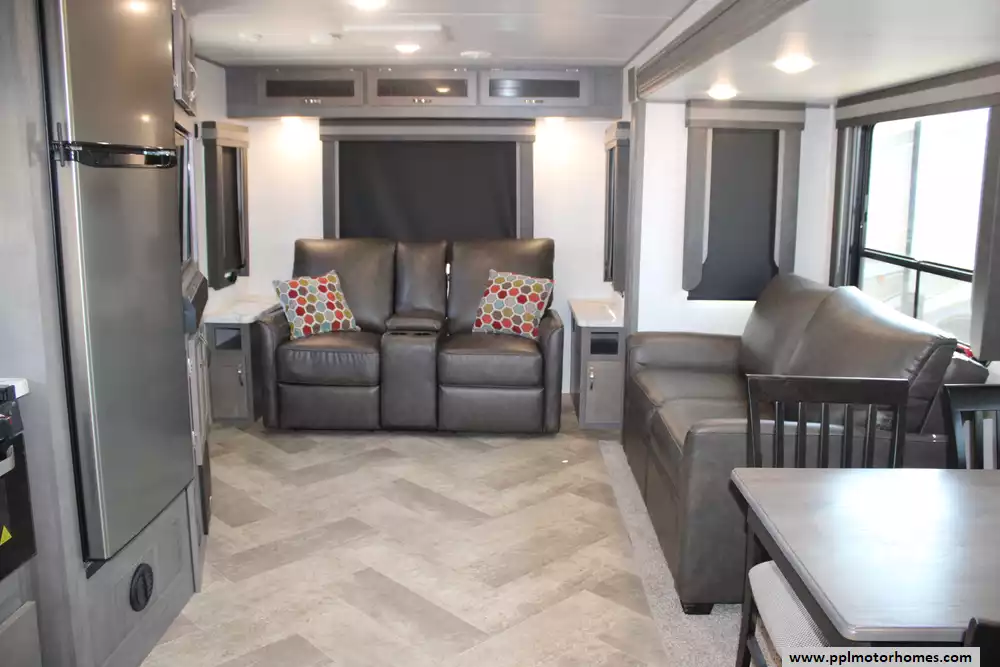 The 2021 East to West Alta 2850KRL is a thoughtfully designed, lightweight rear-living travel trailer measuring 33' 7" in length, with a dry weight around 6,850-6,903 lbs and a hitch weight near 778 lbs. It offers comfortable accommodations for up to five or six, featuring a front private bedroom with a king bed, a spacious slide-out housing a booth dinette, theater seating, and a tri-fold sleeper sofa that converts for added sleeping capacity. The walk-through bathroom adds convenience, while the large L-shaped kitchen includes a stainless-steel 10.5 cu ft refrigerator, a three-burner stove, oven, and solid-surface countertops. Additional standout features include a generous fresh water supply (53 gal), gray (60 gal) and black (30 gal) tanks, a powerful 35,000 BTU furnace, 15,000 BTU AC, power jacks, and a 21' power awning with LED lighting, all set within a quality-laminated build with elevated ceiling height and upscale decor touches. This model also features a brand-new roof!
