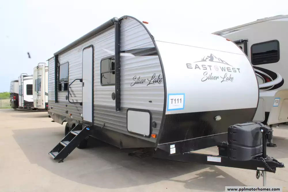 This 2021 East to West Silver Lake 25KRB is a versatile travel trailer designed for families or groups seeking comfort and functionality on the road. Measuring 29 feet overall in length and weighing approximately 4,976 lbs dry, it offers a spacious interior with a king-size bed, convertible sofa and dinette, and a rear bathroom layout. The kitchen is well-equipped with a three-burner stove, oven, microwave, and mid-size refrigerator, complemented by ample storage and counter space. Entertainment is provided by a 32-inch LED TV and a surround sound system, while the 15,000 BTU air conditioner and 35,000 BTU heater ensure year-round comfort. Externally, the trailer features a 15-foot power awning, manual leveling jacks, King One Pro antenna, and more! This Silver Lake is eligible for PPL's convenient financing options.
