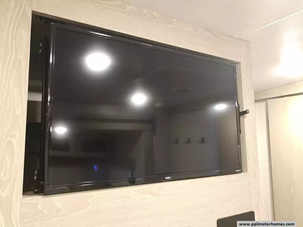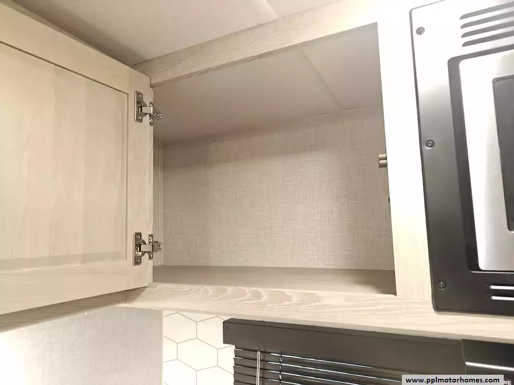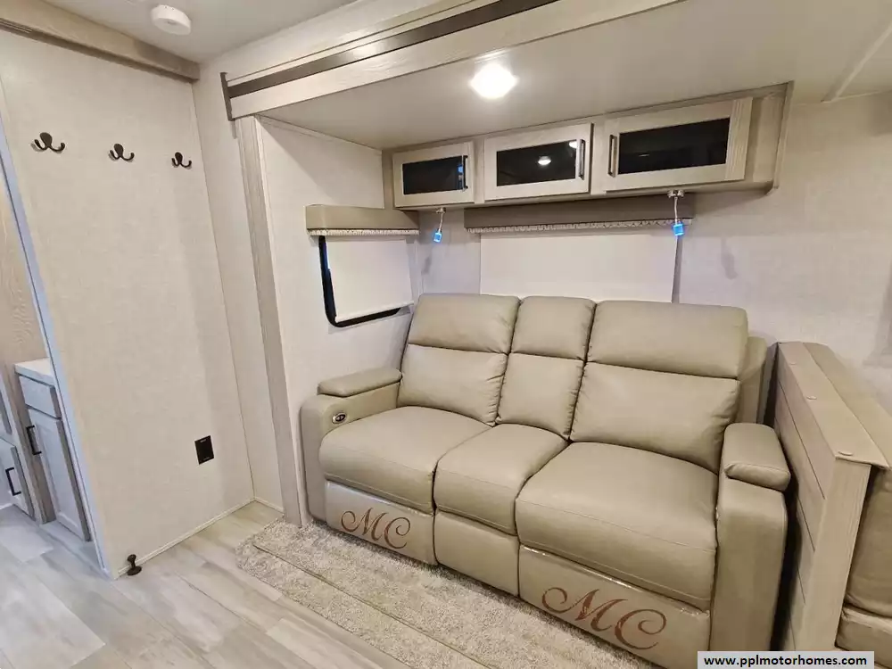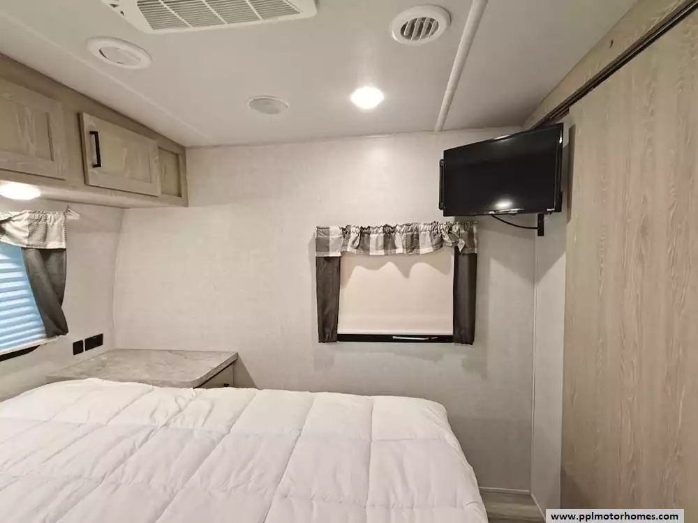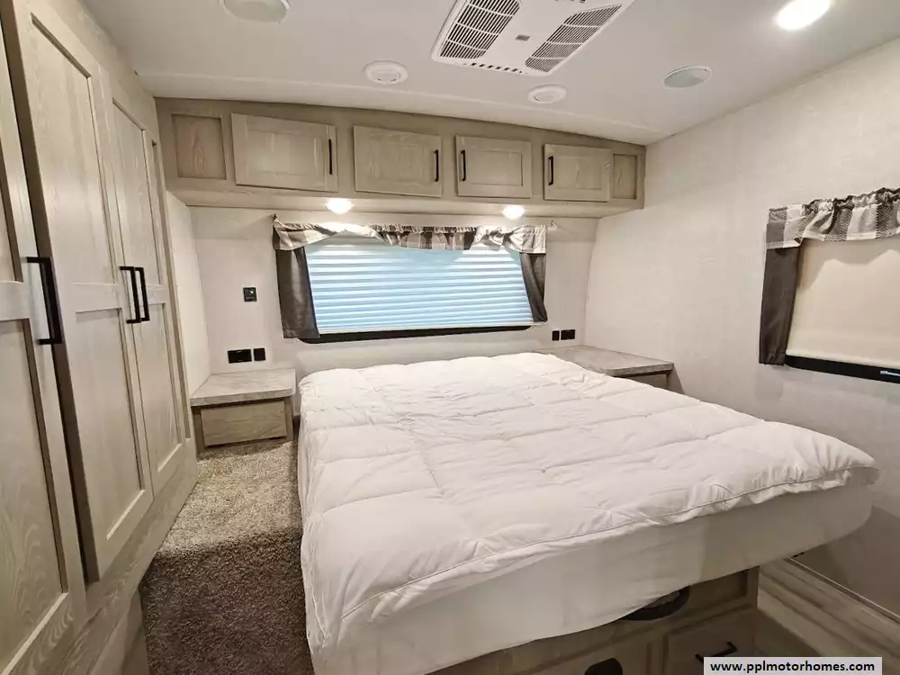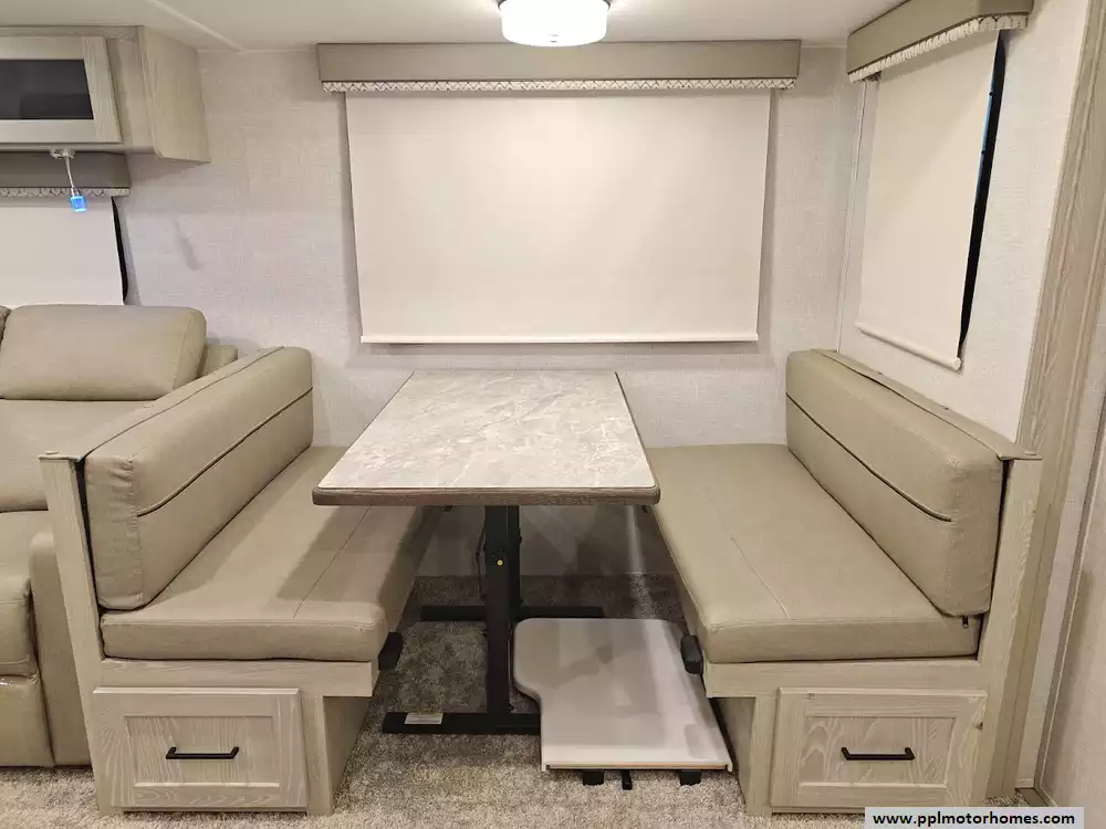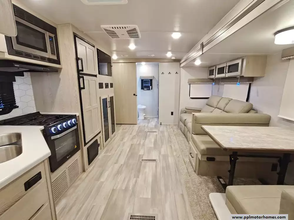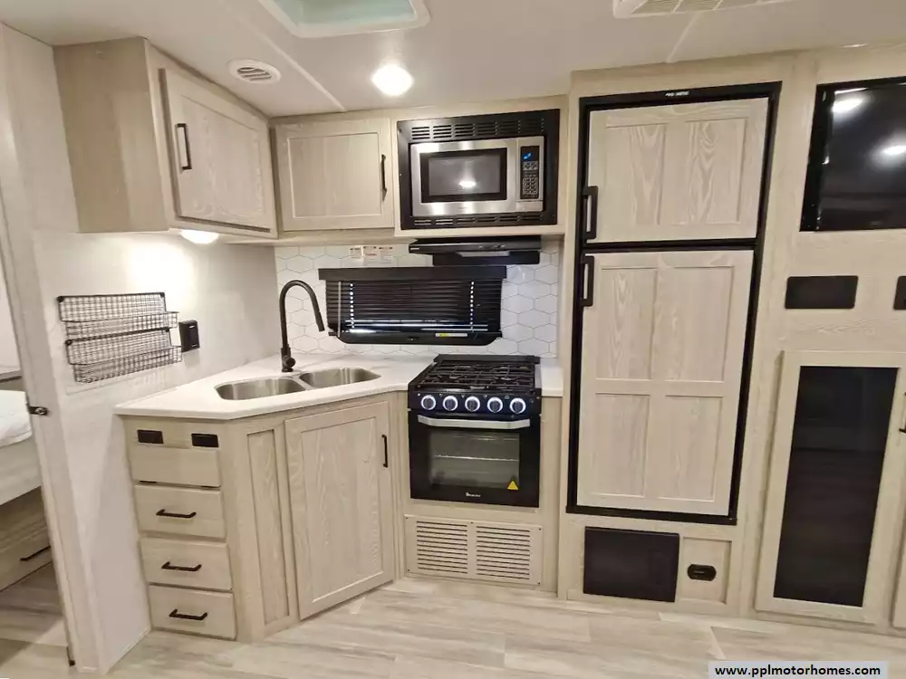 This 2021 Super Lite 26RBWS features theater reclining seating equipped with cup holders, USB charging ports, and adjustable lumbar support. These are positioned directly across from the entertainment center which includes a large LED TV and soundbar system with Bluetooth connectivity.The kitchen features a large undermount double-bowl kitchen sink with a residential-style high-rise pull-down faucet, remium solid surface kitchen countertops, hardwood cabinet doors and drawers with hidden hinges and soft-close roller bearing slides, a booth dinette, a flip-up counter extension for extra prep space, Double Door Refrigerator, Microwave, 3 Burner Range and Oven. A major highlight of this floor plan is the large rear bathroom, which includes a linen closet and offers a spacious feel similar to a residential bathroom. The front bedroom includes a dedicated slide-out specifically for the wardrobe, which significantly increases floor space for dressing and provides deep hanging storage and drawers.It is also equipped with hardwood cabinets mounted above the head of the queen sized bed, USB charging ports and TV. Other features include an Electric Tongue Jack, 1 Slide-out, Automatic Main Awning And Door Awning, Solar Panel, Heated Tanks, Outside Speakers, Outside grill connection, DVD Player and Outside Shower.