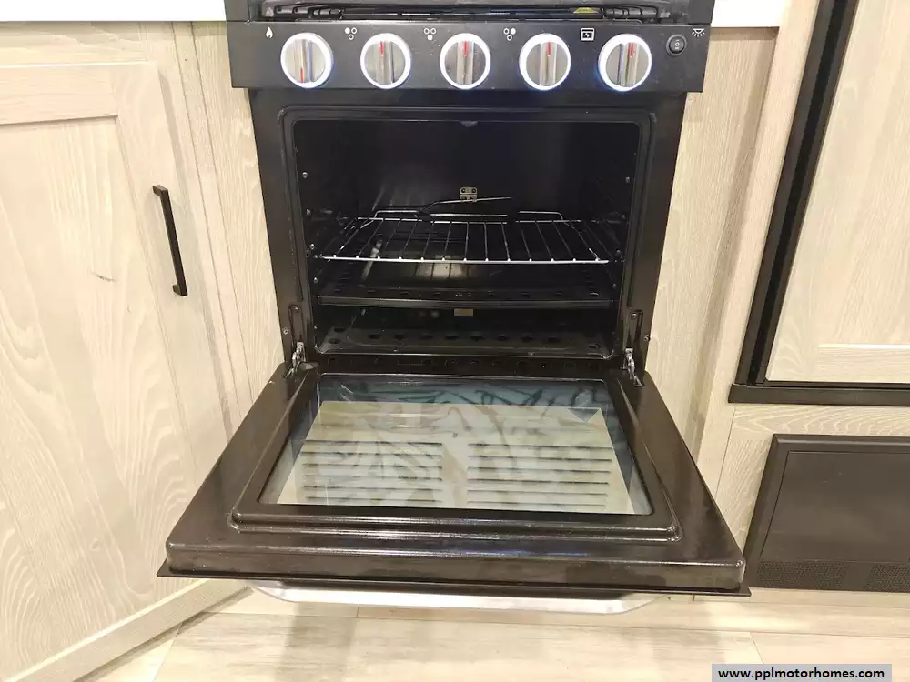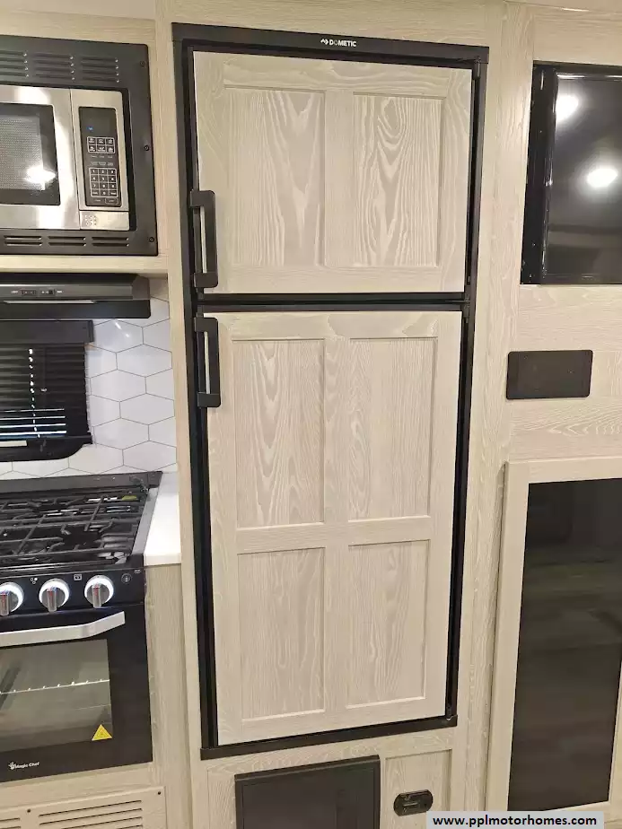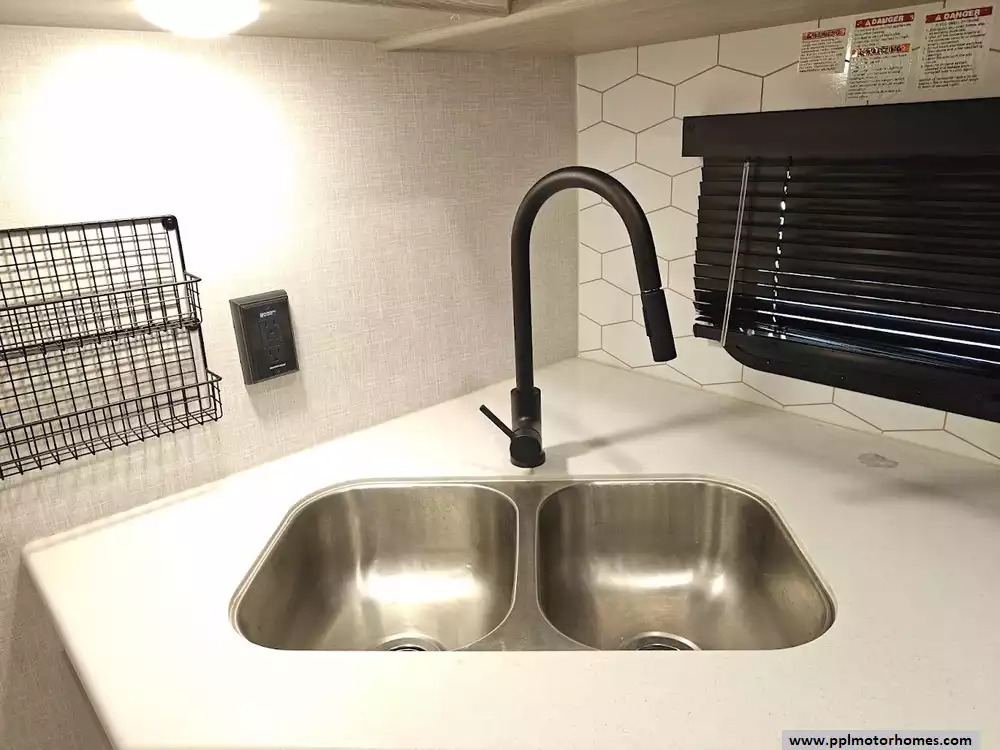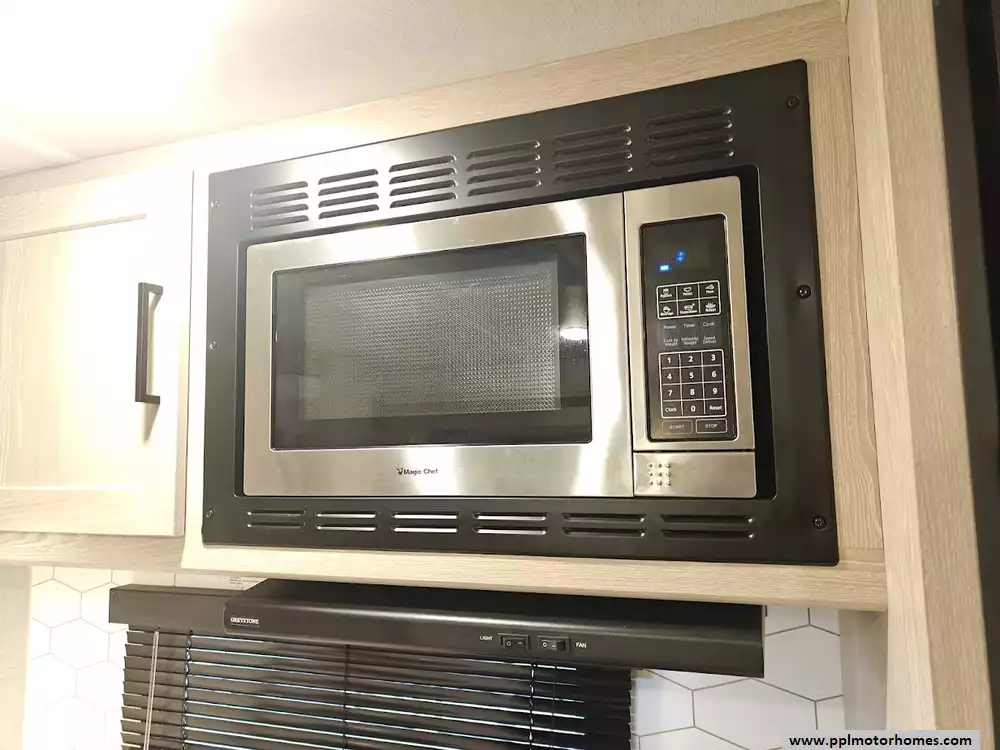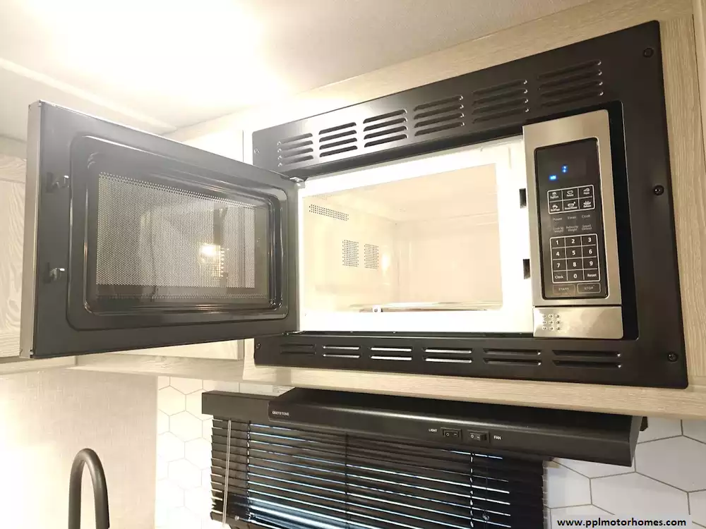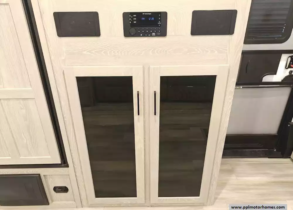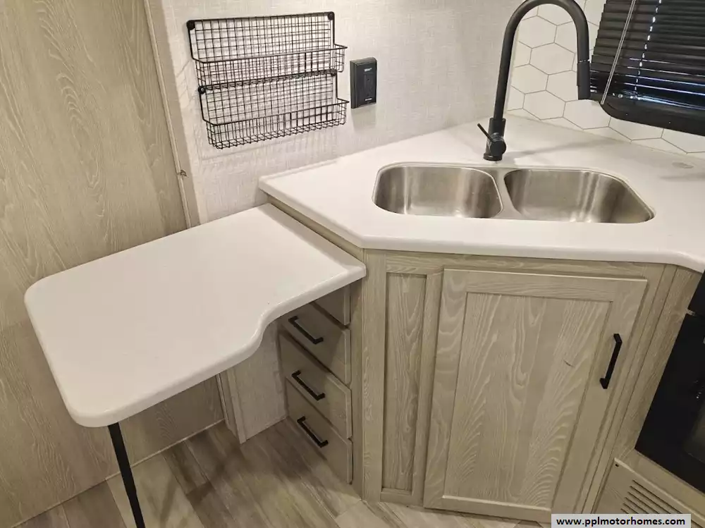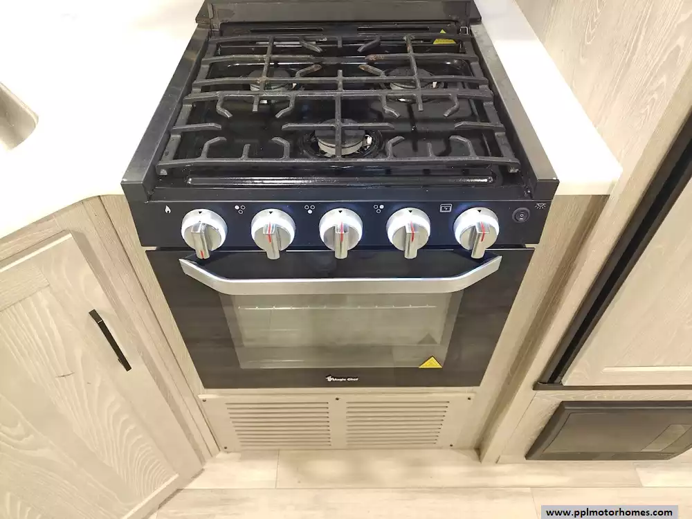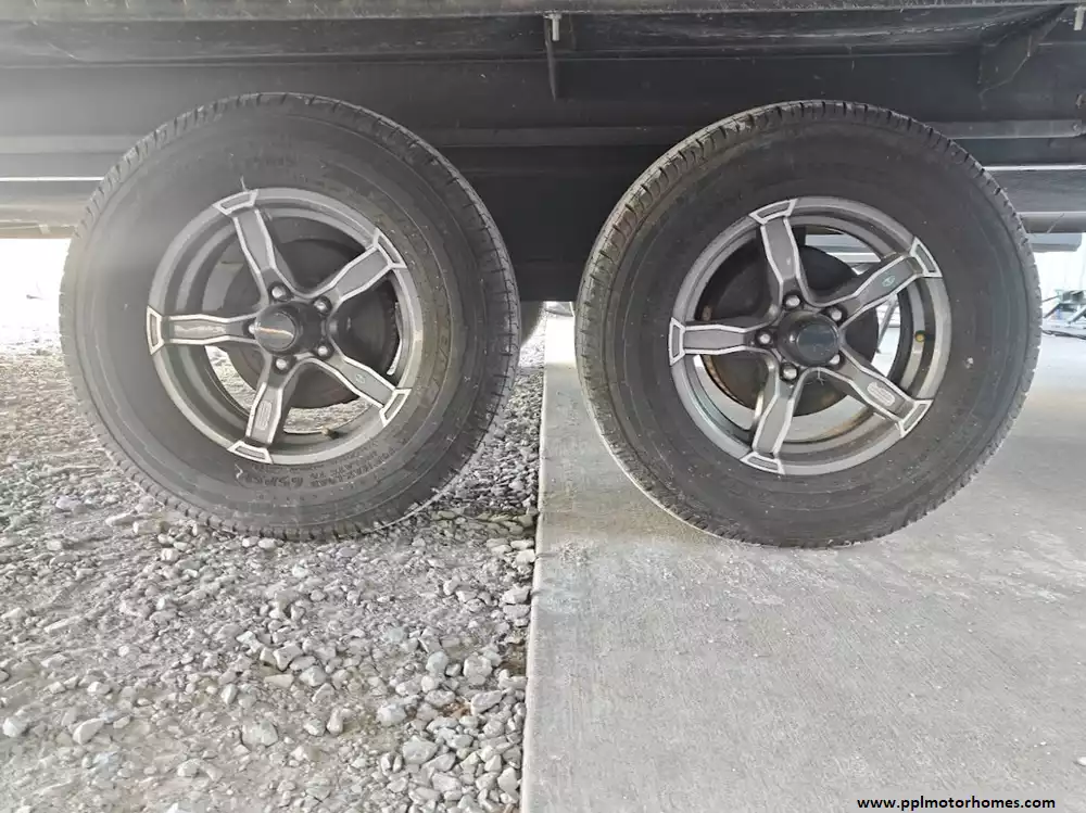 This 2021 Super Lite 26RBWS features theater reclining seating equipped with cup holders, USB charging ports, and adjustable lumbar support. These are positioned directly across from the entertainment center which includes a large LED TV and soundbar system with Bluetooth connectivity.The kitchen features a large undermount double-bowl kitchen sink with a residential-style high-rise pull-down faucet, remium solid surface kitchen countertops, hardwood cabinet doors and drawers with hidden hinges and soft-close roller bearing slides, a booth dinette, a flip-up counter extension for extra prep space, Double Door Refrigerator, Microwave, 3 Burner Range and Oven. A major highlight of this floor plan is the large rear bathroom, which includes a linen closet and offers a spacious feel similar to a residential bathroom. The front bedroom includes a dedicated slide-out specifically for the wardrobe, which significantly increases floor space for dressing and provides deep hanging storage and drawers.It is also equipped with hardwood cabinets mounted above the head of the queen sized bed, USB charging ports and TV. Other features include an Electric Tongue Jack, 1 Slide-out, Automatic Main Awning And Door Awning, Solar Panel, Heated Tanks, Outside Speakers, Outside grill connection, DVD Player and Outside Shower.