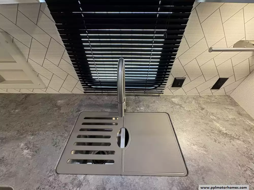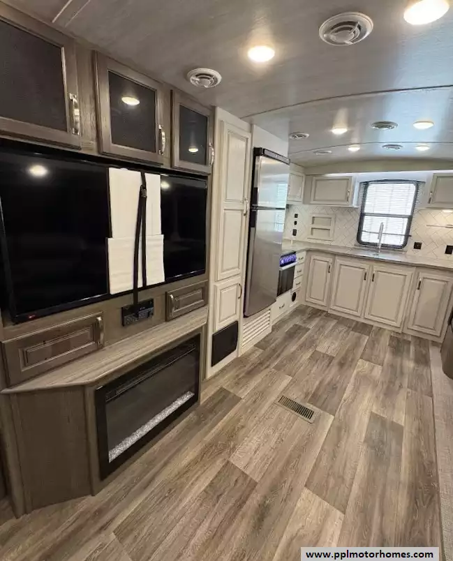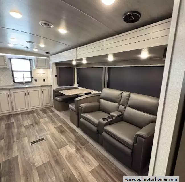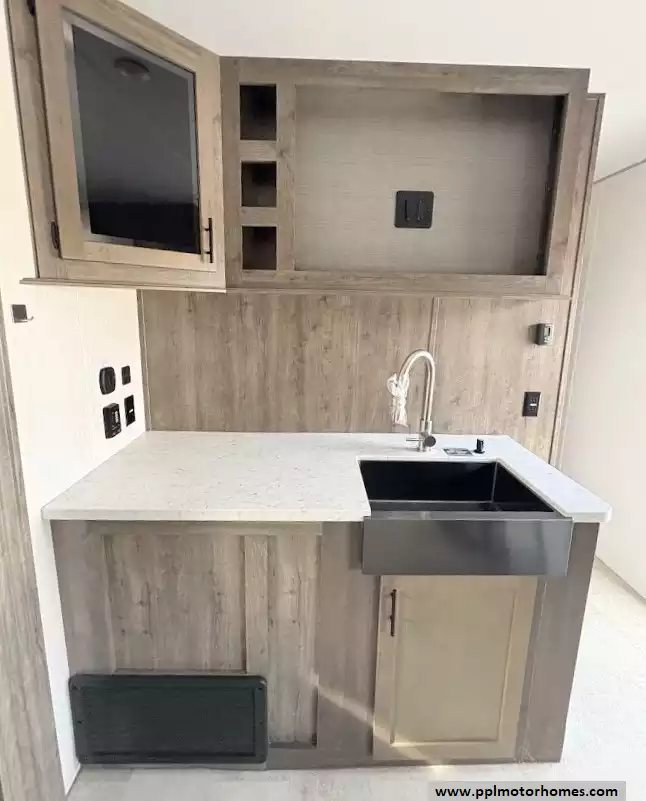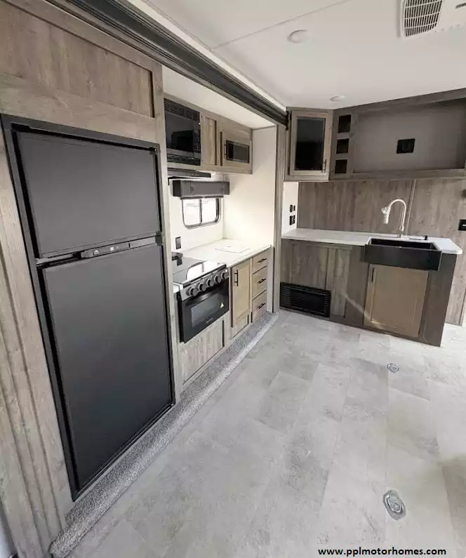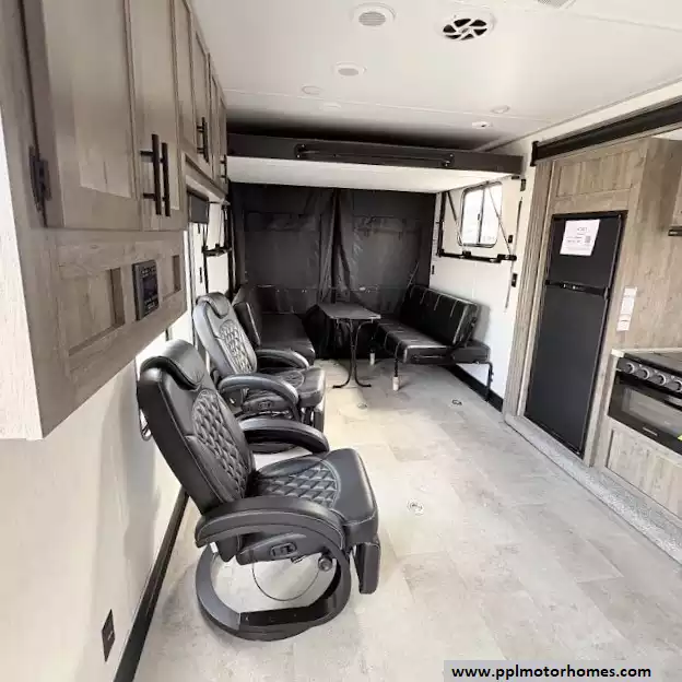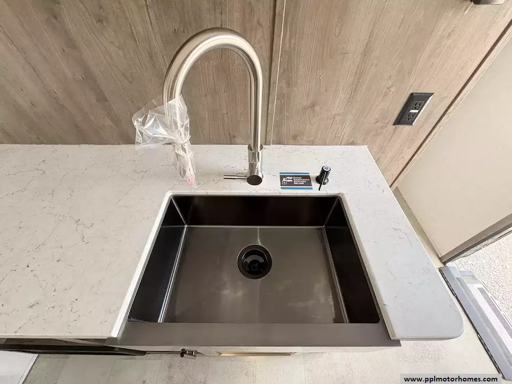 The kitchen is located on a slide-out, providing more living space and features a residential black stainless steel farm sink, seamless countertops, and a 10.1 cubic foot 12V residential refrigerator. Sleeping areas include a king bed in the front master bedroom and the "Quick Set" bed system in the garage, along with rollover sofas.