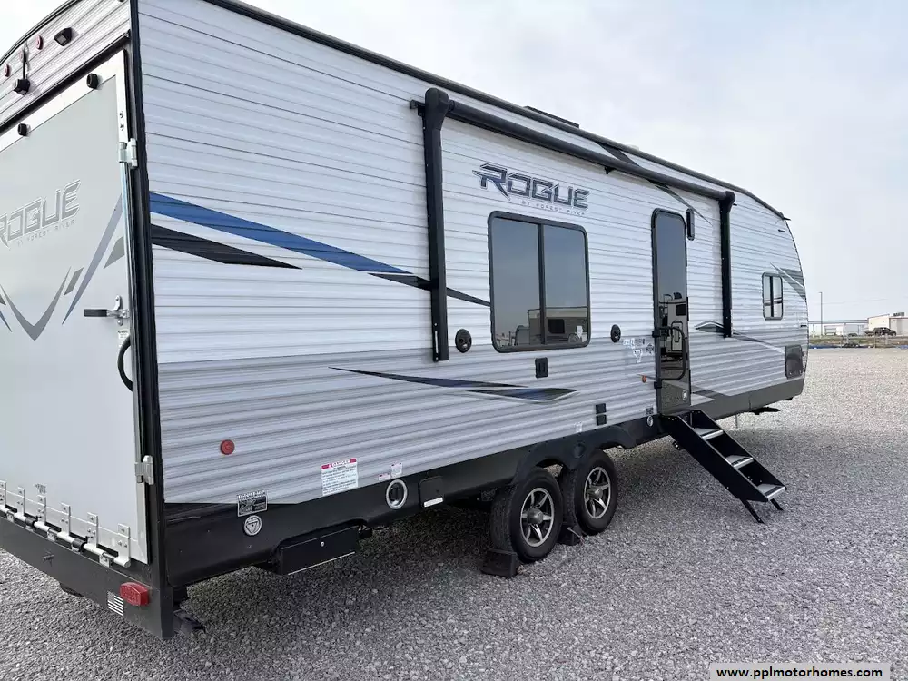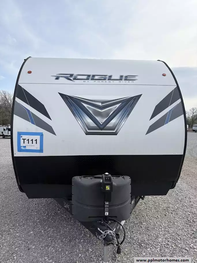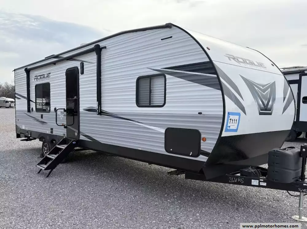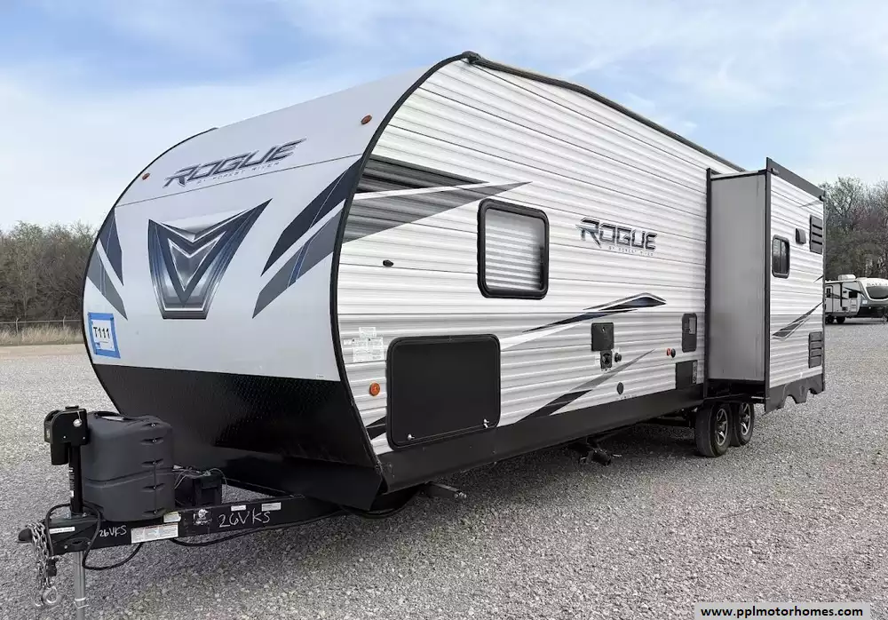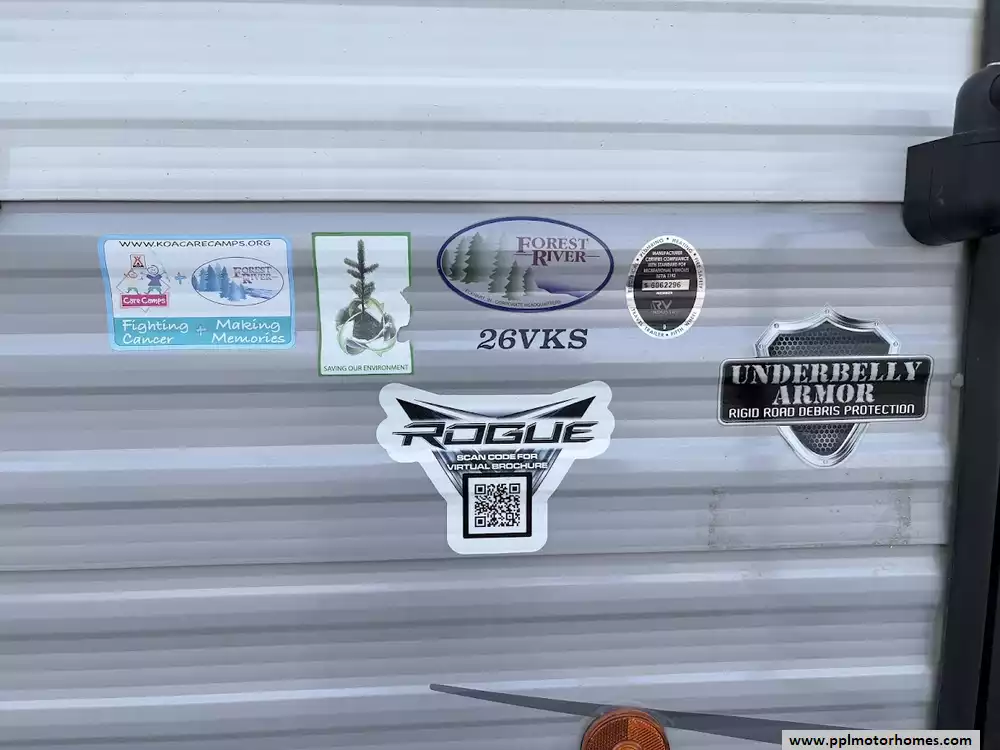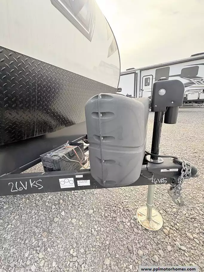 This 2021 Forest River Vengeance Rogue 26VKS features a 15-foot garage with a 3,000 lb. rated ramp door that can double as a patio. It includes a 30-gallon fuel station for your toys, an outside shower, and a power awning with LED lights. The unit is built with 102" wide-body construction and an enclosed underbelly. It is prepped for a generator and a backup camera.