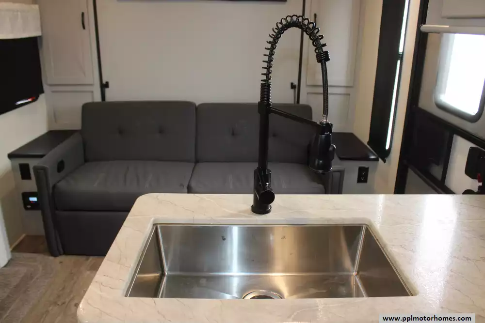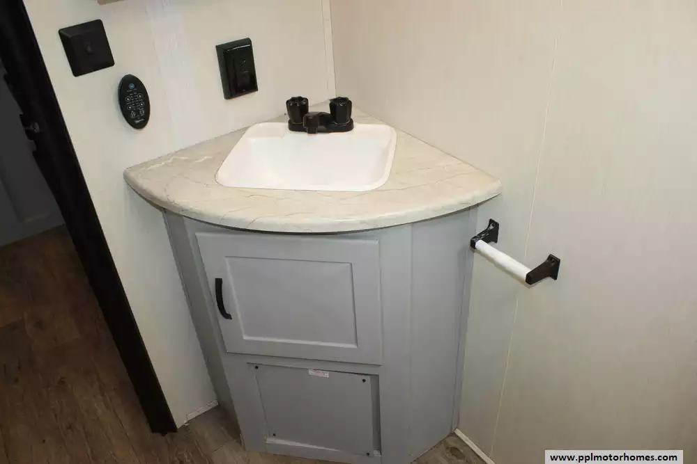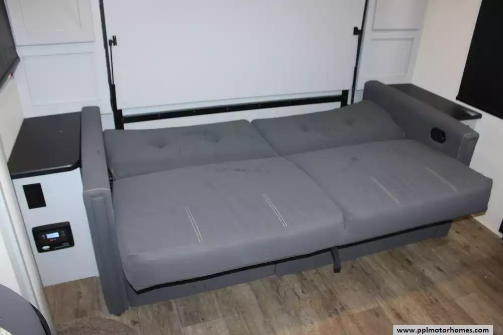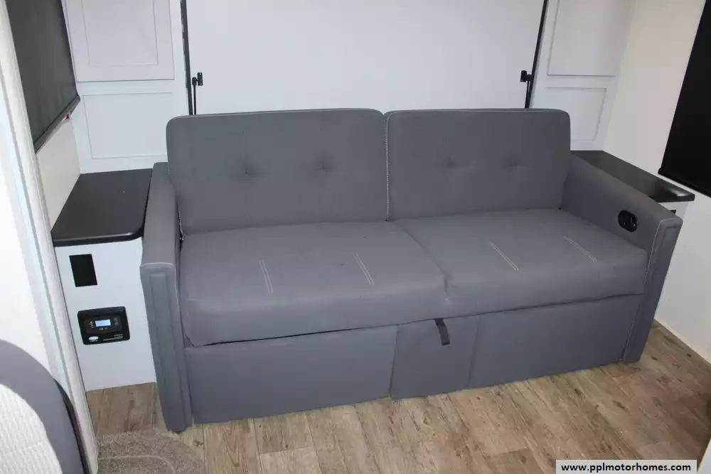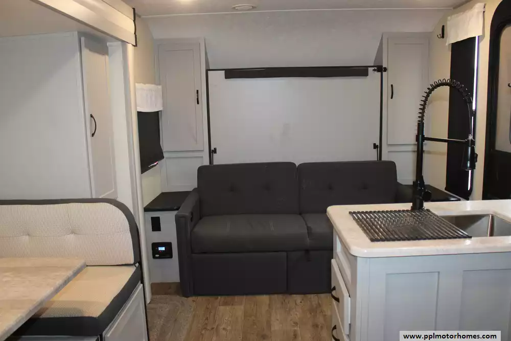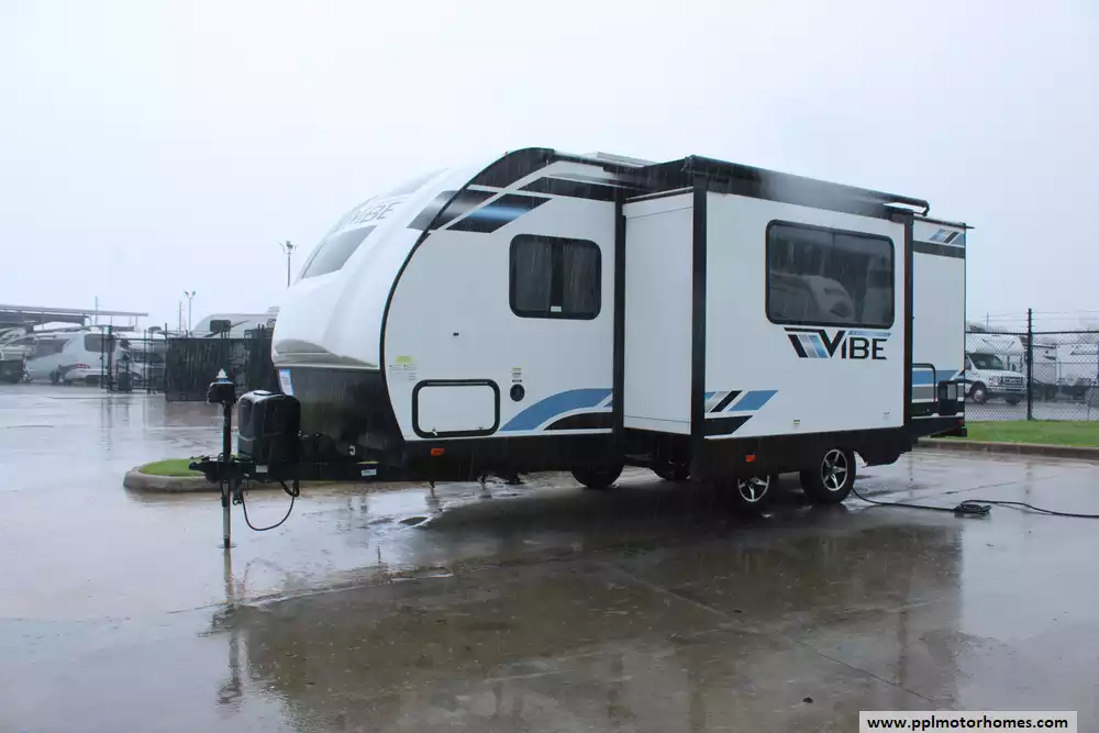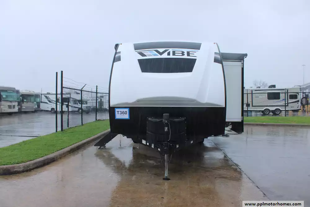 Designed for the modern adventurer, this Vibe comes equipped with a solar panel for off-grid flexibility and an electric tongue jack for effortless setup at the campsite. The chef-ready kitchen features a double-door Everchill refrigerator, a three-burner range, an oven, and a microwave to make meal prep a breeze. Outside, you can enjoy the ultimate patio experience with an outdoor kitchen, outside speakers, and an automatic main awning with an additional slide awning for extra protection. Complete with an outside shower, a built-in TV, and a DVD player, this well-maintained travel trailer is a versatile, high-performance retreat ready for your next getaway.