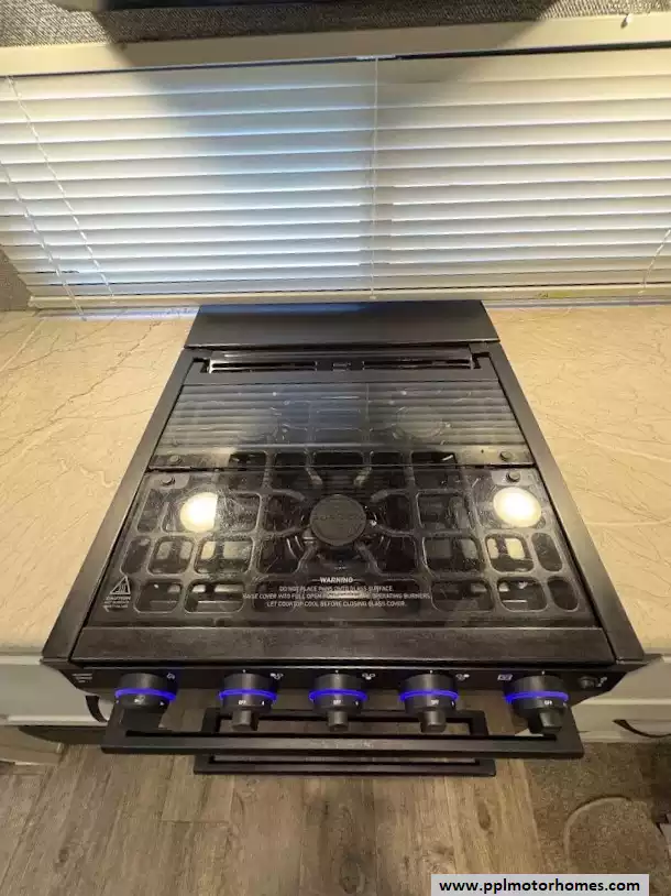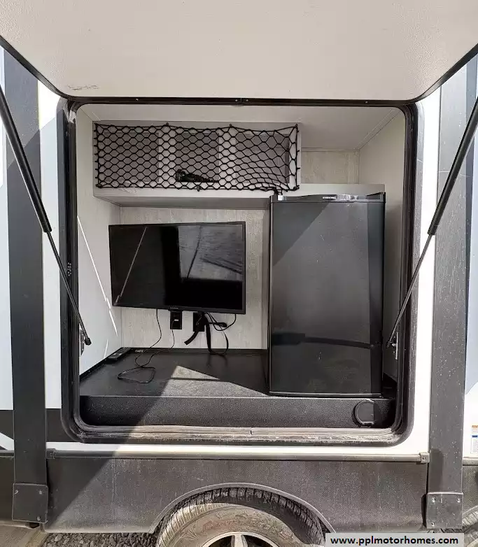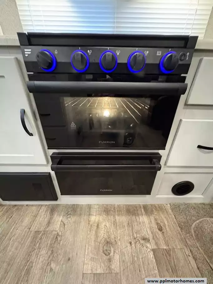 A rear kitchen layout designed with a "chef-inspired" focus. It maximizes workspace and storage by utilizing a dedicated slide-out and a unique walk-in pantry, a rare feature in travel trailers of this size. It includes a three-burner cooktop, microwave, oven and a large single bowl stainless steel undersink with a high-rise spout. A built-in countertop bar with two stools serves as a breakfast nook or additional prep area, facing a large panoramic window.