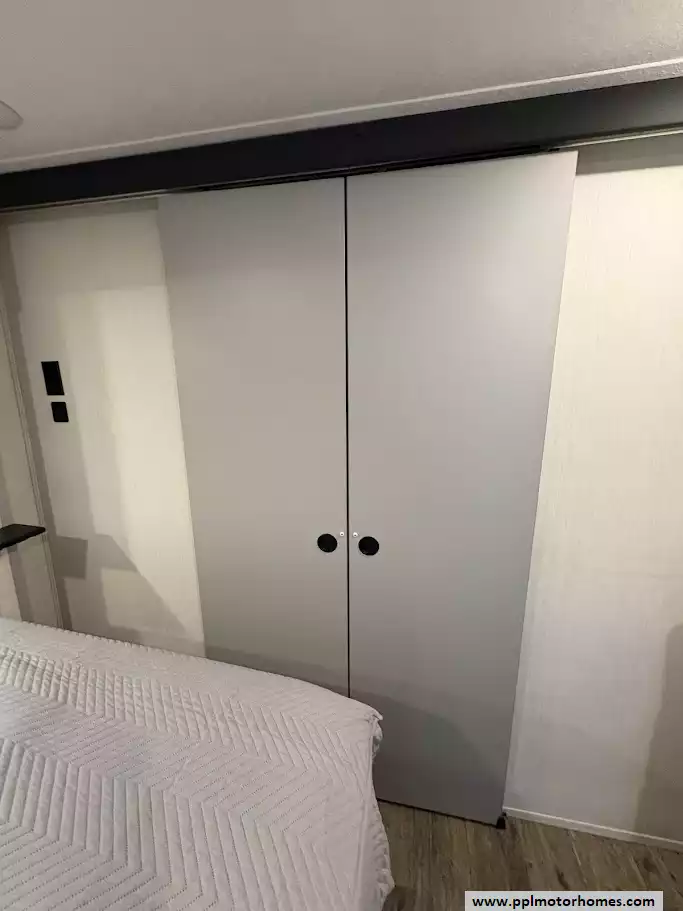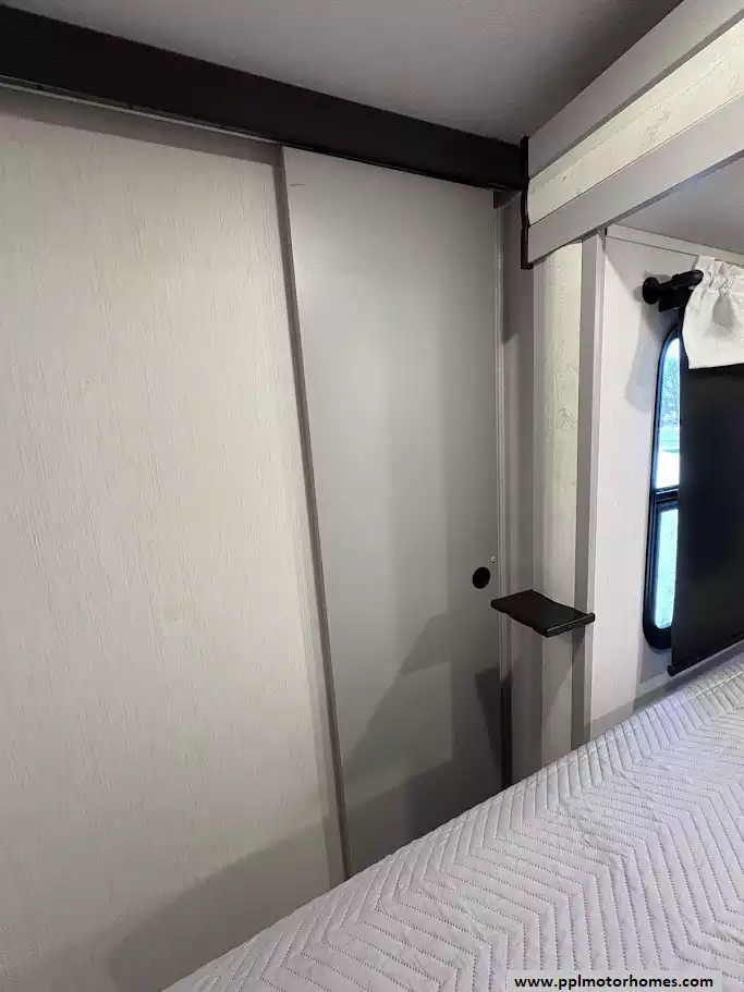 A private front-end master suite. It is designed to feel spacious by utilizing the trailer's third slide-out and offering residential-style storage. The bed is housed in its own slide-out, which opens up significant floor space compared to standard non-slide bedrooms. Access to the bedroom is through a solid hard door rather than a curtain, ensuring complete privacy from the main living area. A built-in dresser offers additional drawer space for clothing and personal items.