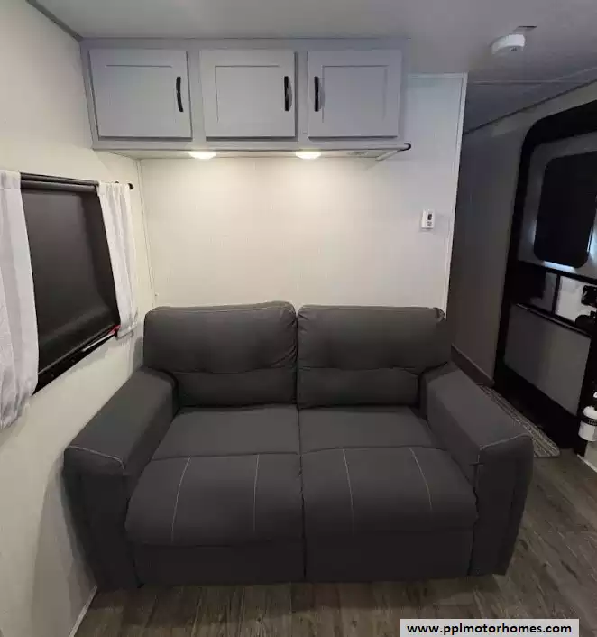 The living area is designed as a central social hub, featuring dual opposing slide-outs that significantly widen the interior floor space. Dual recliners are positioned for a clear view of the entertainment center, these chairs offer dedicated space for lounging. An electric fireplace provides both ambiance and supplemental warmth.