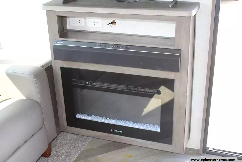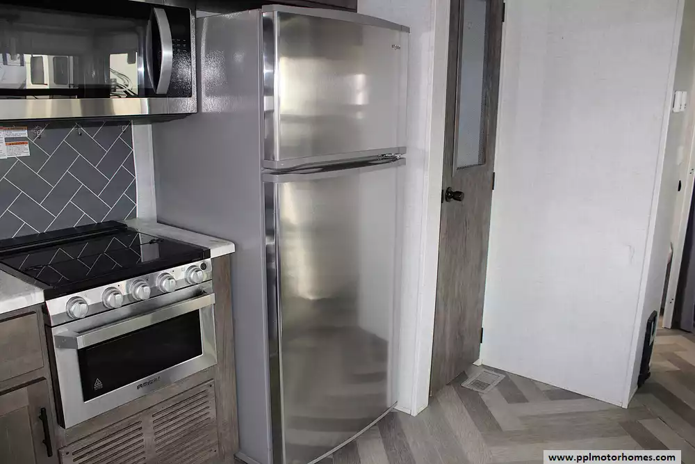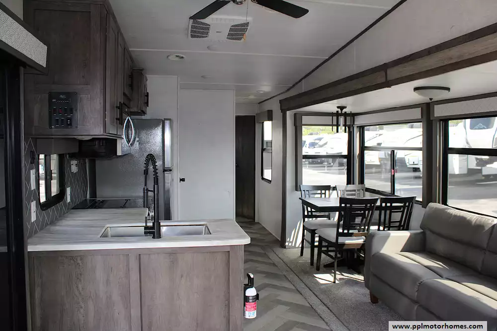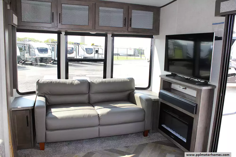 Built with strength and convenience in mind, the Wildwood Lodge 40FDEN is towable by a properly equipped heavy-duty vehicle capable of handling its impressive weight. Once set up at your favorite destination, you'll discover a full array of residential-style comforts. A rear private bedroom with a king-size bed slide offers a restful sanctuary, while the front living area features plush seating, a cozy fireplace, and an entertainment center for movie nights or quiet evenings. The chef's kitchen boasts full-size appliances, including a refrigerator, microwave, range, and ample countertop space, ensuring meal prep is as effortless as it is at home.