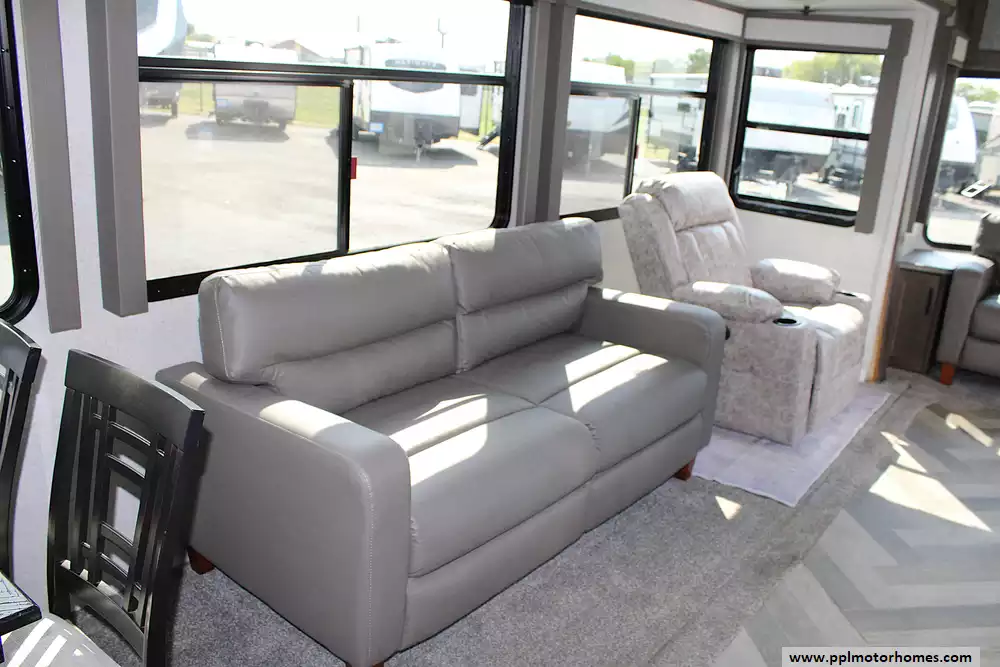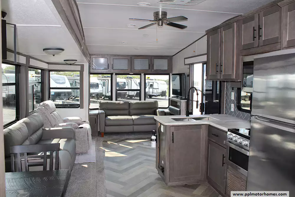 2021 Forest River Wildwood Lodge 40FDEN, a destination trailer that redefines luxury living on the road. Stretching over 42 feet in length, this spacious retreat is designed to feel more like a residential home than an RV. With its dual slide-outs, soaring 8-foot ceilings, and sweeping front windows, it creates an open, light-filled living space perfect for entertaining or simply unwinding in style. This model can comfortably sleep up to 8 guests, making it a fantastic choice for large families or those who enjoy hosting friends during their travels.