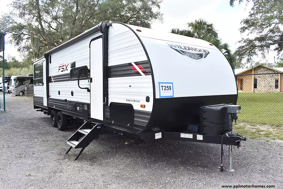 This 2021 Wildwood Fsx 280RT has an Electric Tongue Jack, 1 Slide-out, 1 Ducted Air Conditioner, Double Door 110v Everchill Refrigerator, Automatic Main Awning, Outside Stereo, TV, Outside Shower, Fireplace, Microwave, 3 Burner Range, Oven