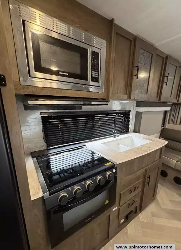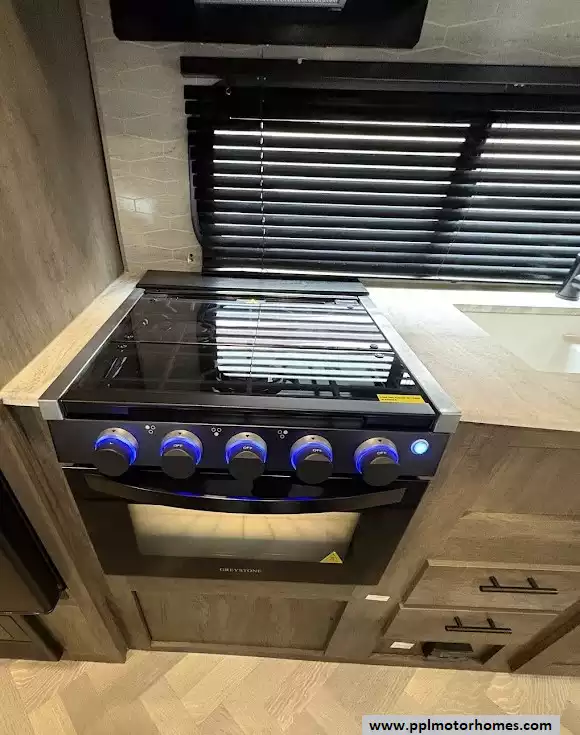 This well-equipped model comes ready for adventure with an Electric Tongue Jack for effortless setup and a central Ducted Air Conditioner to keep the entire cabin cool during summer trips. The kitchen is a standout, featuring a Double Door 12v Everchill Refrigerator that cools quickly and efficiently, complemented by a 3-burner range and microwave for easy meal prep. Outside, the automatic main awning and additional window/door awnings provide extensive shaded lounge space, while the integrated outside speakers allow you to enjoy your favorite music as you relax in the great outdoors.