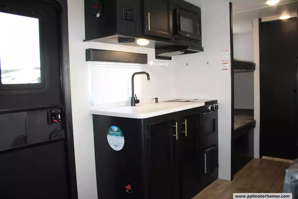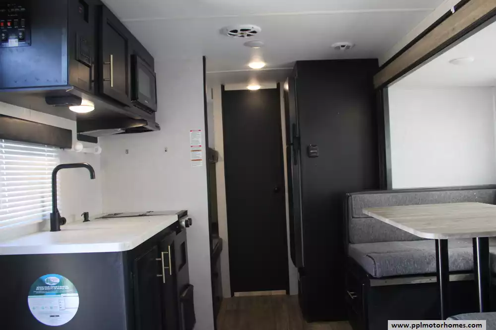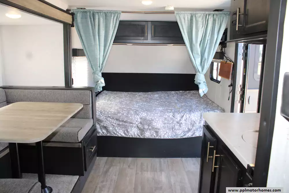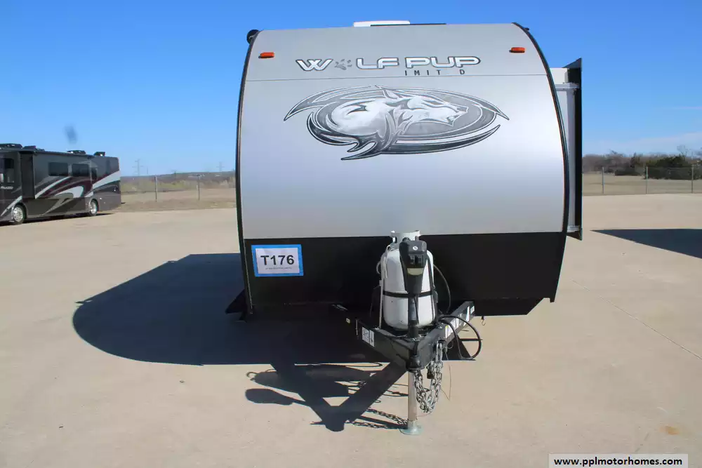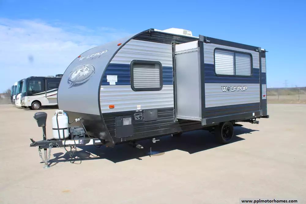 The 2021 Forest River Wolf Pup Limited 17JG is a compact, family-friendly travel trailer designed to sleep up to six with a front queen bed, rear bunk beds, and a U-shaped dinette that converts to additional sleeping space, all on a single-axle 23-foot frame ideal for mid-size tow vehicles. Inside you'll find a well-equipped kitchen, private bathroom, and plenty of storage, while the exterior features a powered awning with LED lighting, a mini outdoor Pup kitchen, exterior speakers, TV bracket and practical touches like a backup camera system and integrated control app. Built for comfort on the road, it also includes a 13,500 BTU air conditioner and 20,000 BTU furnace to handle changing weather and large under-bed storage to keep gear organized. This model includes a brand-new roof as well as a new slide floor.