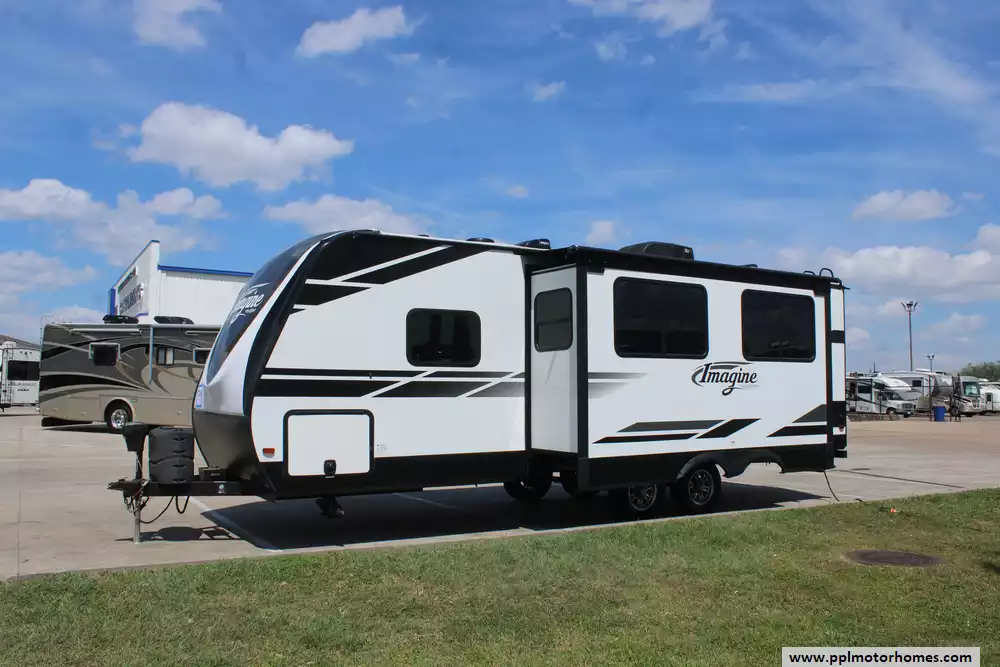 This 2021 Grand Design Imagine 2600RB is a premier 29-foot travel trailer that perfectly balances lightweight towing with residential-grade luxury. Renowned for its superior build quality and "best-in-class" storage, this model features a durable fiberglass exterior and a reliable rubber roof. Setting up camp is a breeze thanks to the electric tongue jack, while the automatic main awning and additional slide awning create an expansive outdoor living area. Complemented by outside speakers and a convenient outside shower, this Imagine is designed for those who appreciate the Great Outdoors without sacrificing the comforts of home.