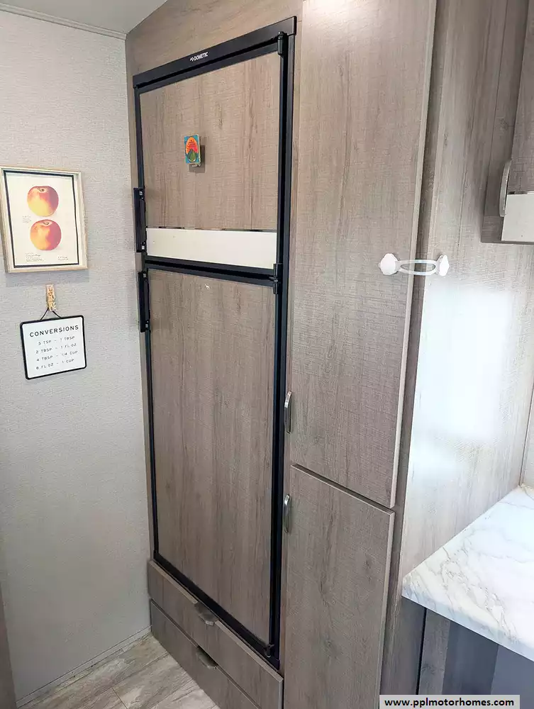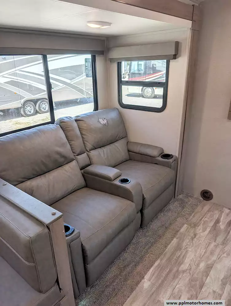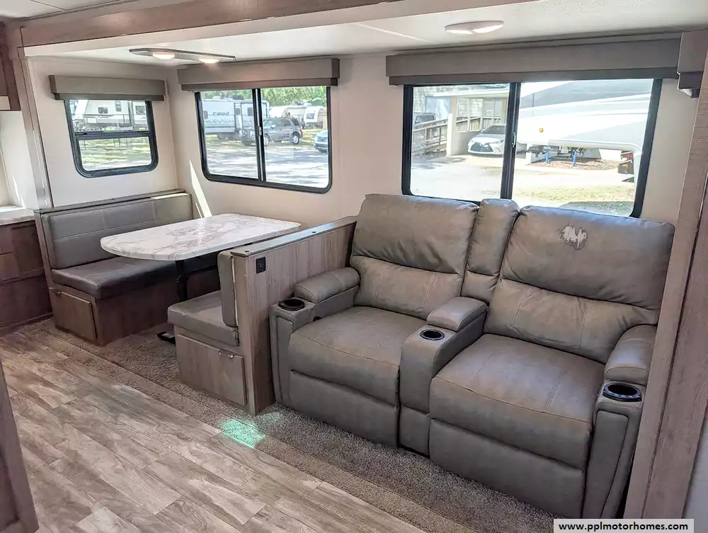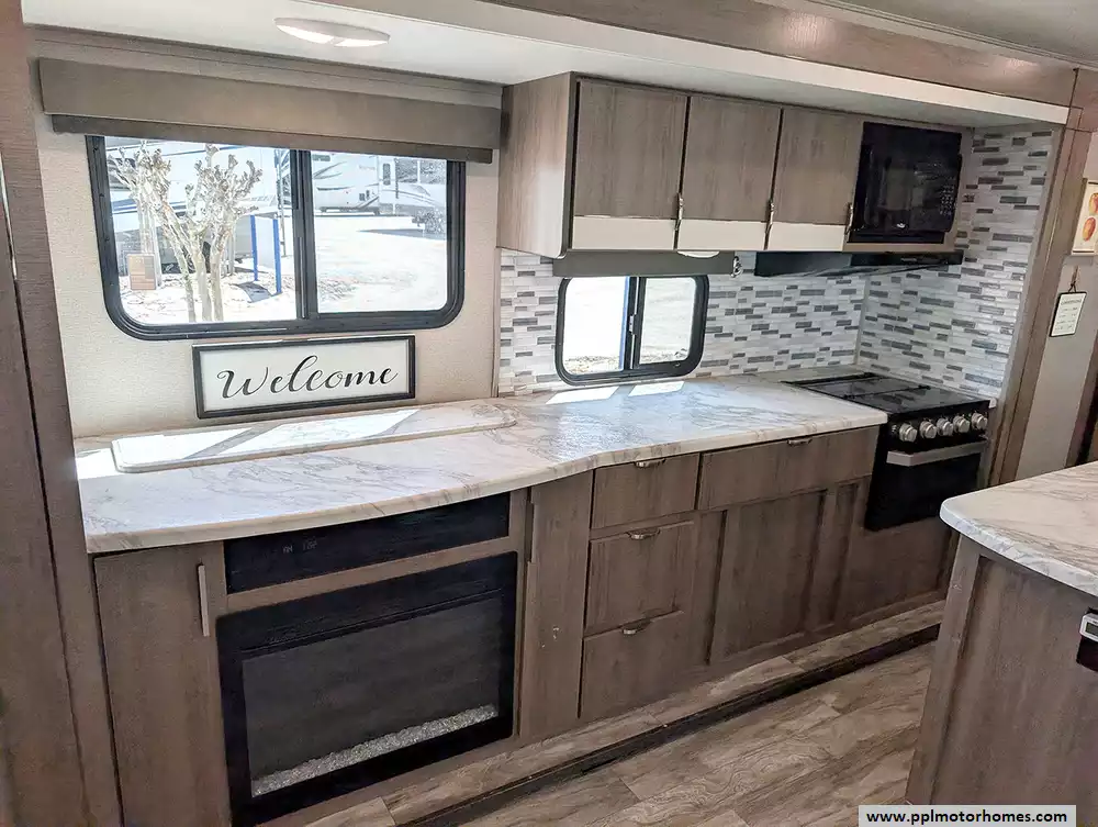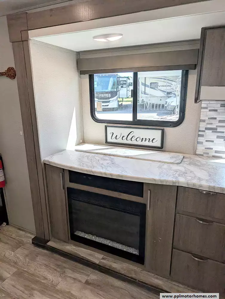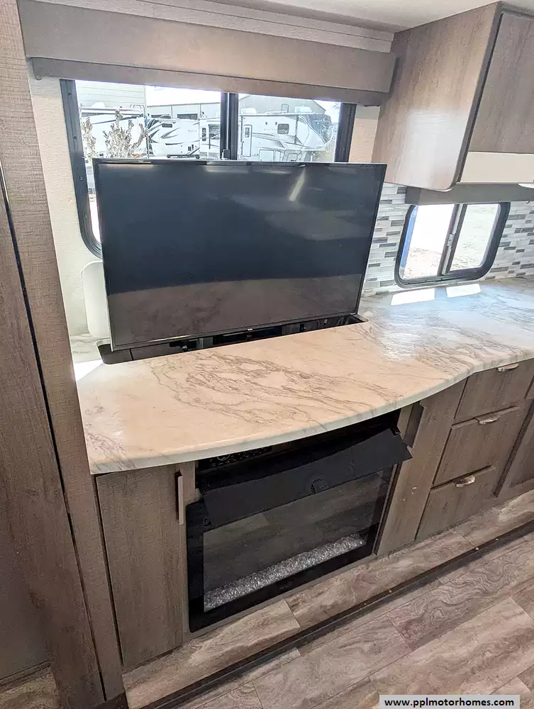 Equipped for total comfort in any climate, this unit features two ducted air conditioners and a cozy interior fireplace. The kitchen is fully appointed with a three-burner range, oven, microwave, and a double-door Dometic gas/electric refrigerator, along with an additional refrigerator for extra storage. You will find plenty of entertainment options with the included TV, satellite receiver, and outside speakers. The outdoor lifestyle is further enhanced by an automatic main awning, an outdoor grill, and an outside shower for easy cleanups. Complete with an electric tongue jack for effortless setup, this 2670MK is ready to take your next adventure to the next level.