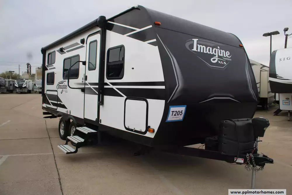 The 2021 Grand Design Imagine XLS 21BHE is a lightweight, family-friendly travel trailer designed to provide comfort and versatility while remaining easy to tow. Measuring approximately 24 feet 11 inches long with a dry weight of about 4,700 pounds, it can sleep up to 7 or 8 people and features a practical bunkhouse layout with double-size rear bunks, a front queen Murphy bed that converts into a sofa during the day, and a booth dinette that also converts into additional sleeping space. The trailer includes a well-equipped kitchen with a three-burner cooktop, microwave, double-door refrigerator, and ample storage, along with a full bathroom featuring a walk-in shower. Additional highlights include a 15-foot power awning with LED lighting, outdoor kitchen, pass-through storage, and modern conveniences such as air conditioning, a 25,000-BTU furnace, and large holding tanks, making the Imagine XLS 21BHE a great option for families seeking a comfortable and towable RV for weekend trips or extended camping adventures.