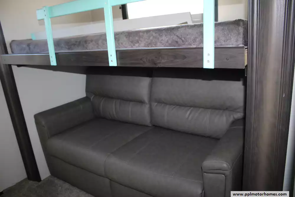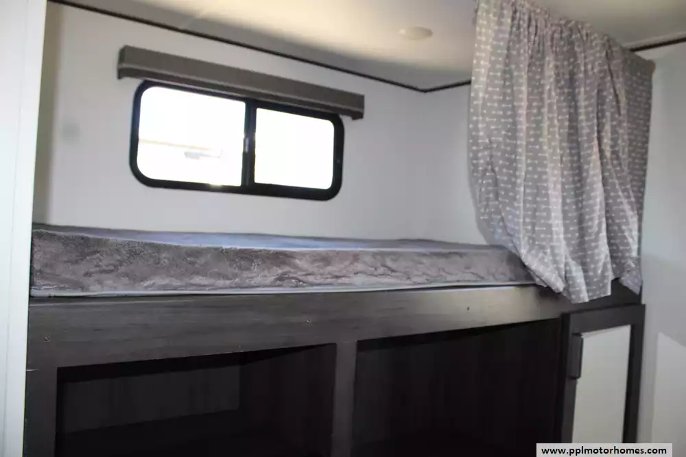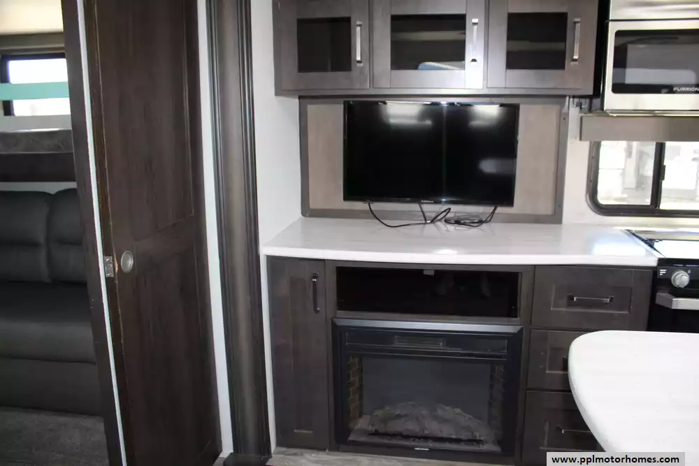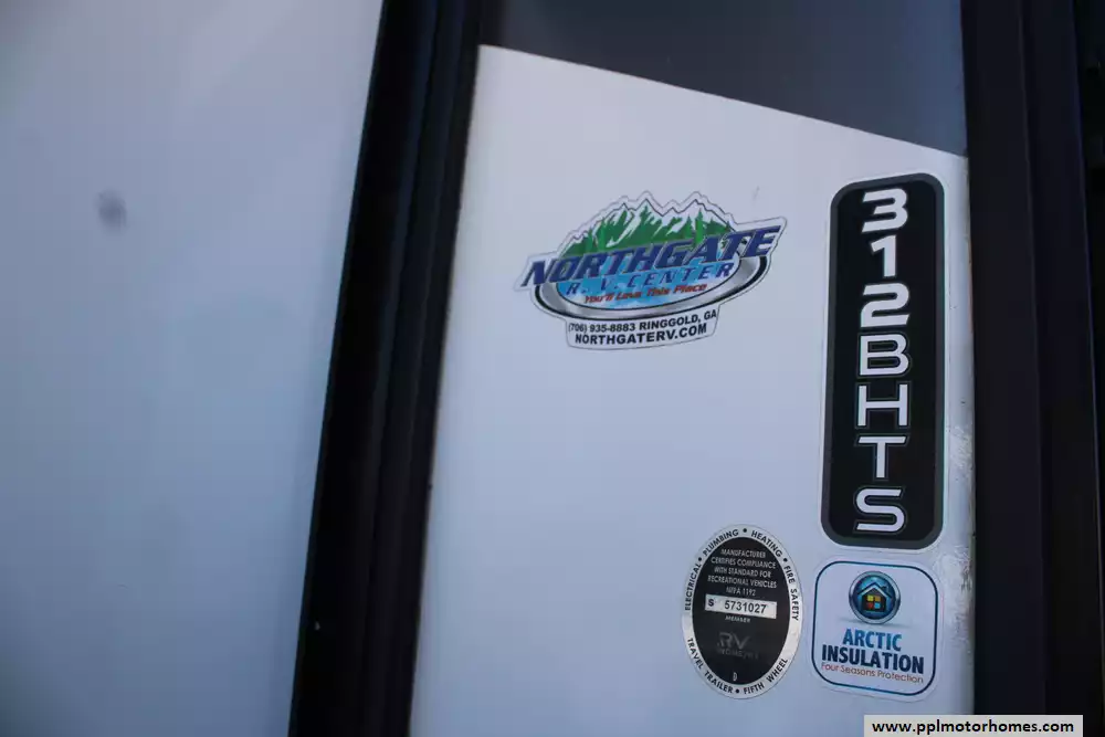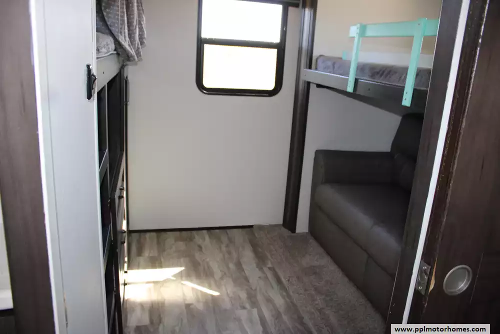 The 2021 Grand Design Reflection 312BHTS is a spacious bunkhouse travel trailer designed for families who want residential comfort and generous sleeping capacity while traveling. Measuring about 37 feet 4 inches long and featuring three slide-outs, this floorplan provides a large central living area with theater seating, booth dinette, entertainment center, and fireplace across from a full kitchen with solid-surface countertops, island prep space, and residential-style appliances. A private rear bunkhouse with multiple bunks and seating offers a dedicated space for kids or guests, while the front bedroom includes a queen bed with wardrobe storage for added privacy. Built with aluminum-framed fiberglass construction, the trailer has a dry weight around 9,291 lbs., GVWR of 11,295 lbs., and can sleep up to 7, maybe 8 people, depending on arrangements, making it ideal for extended family trips. Additional highlights include an outside kitchen, 21-ft power awning, 60-gallon fresh water tank, 86-gallon gray tank, and 43-gallon black tank, providing comfort and convenience for longer camping stays.
