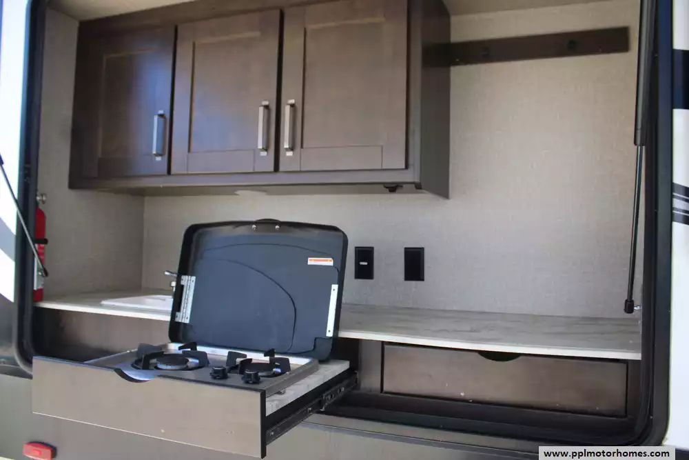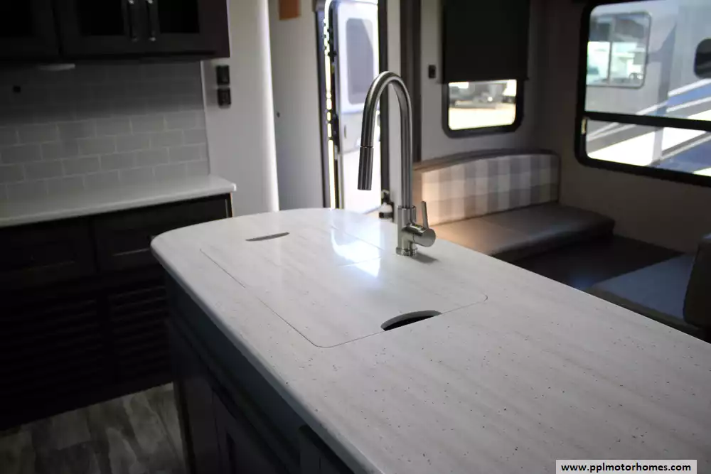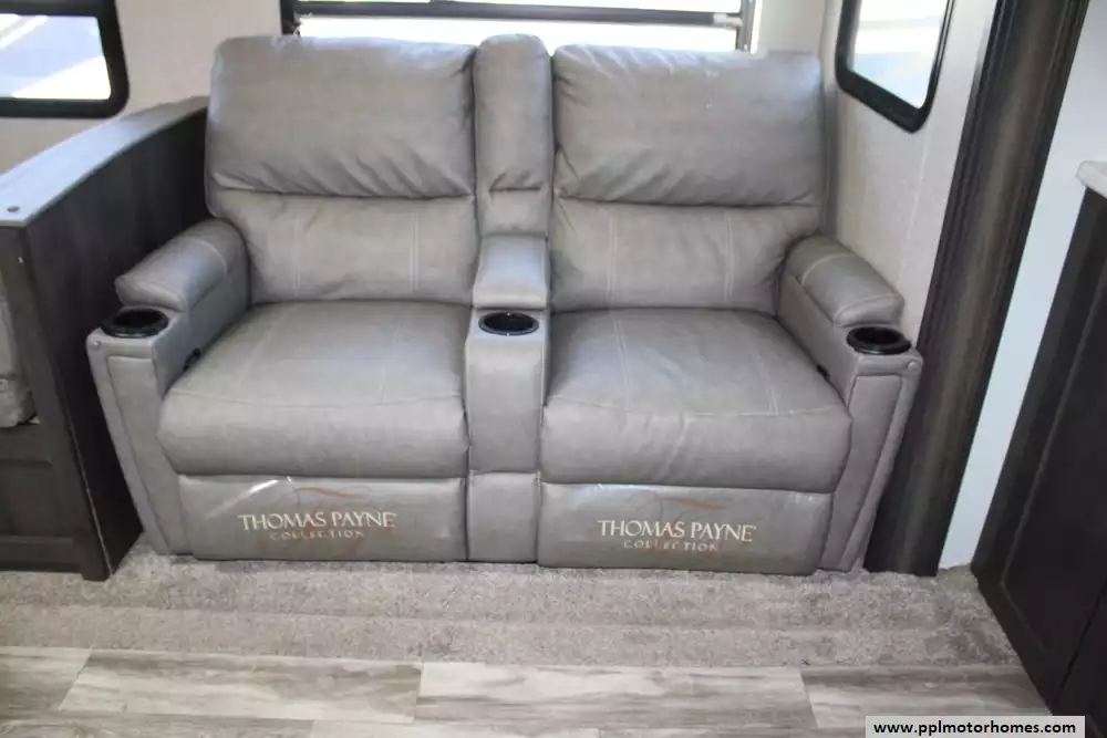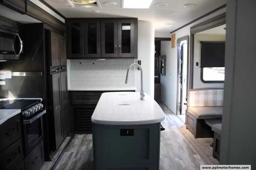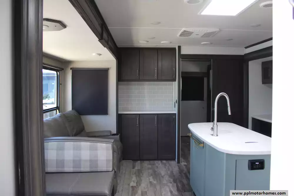The 2021 Grand Design Reflection 312BHTS is a spacious bunkhouse travel trailer designed for families who want residential comfort and generous sleeping capacity while traveling. Measuring about 37 feet 4 inches long and featuring three slide-outs, this floorplan provides a large central living area with theater seating, booth dinette, entertainment center, and fireplace across from a full kitchen with solid-surface countertops, island prep space, and residential-style appliances. A private rear bunkhouse with multiple bunks and seating offers a dedicated space for kids or guests, while the front bedroom includes a queen bed with wardrobe storage for added privacy. Built with aluminum-framed fiberglass construction, the trailer has a dry weight around 9,291 lbs., GVWR of 11,295 lbs., and can sleep up to 7, maybe 8 people, depending on arrangements, making it ideal for extended family trips. Additional highlights include an outside kitchen, 21-ft power awning, 60-gallon fresh water tank, 86-gallon gray tank, and 43-gallon black tank, providing comfort and convenience for longer camping stays.