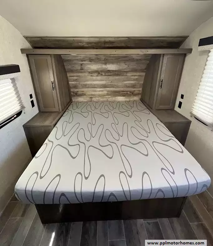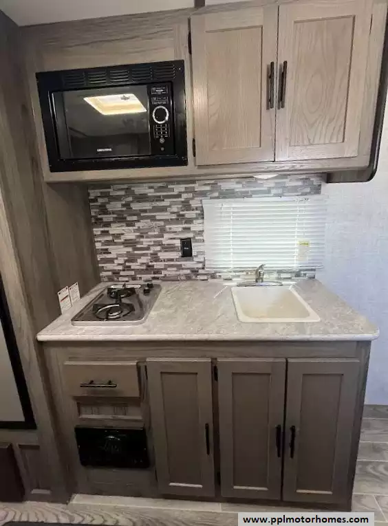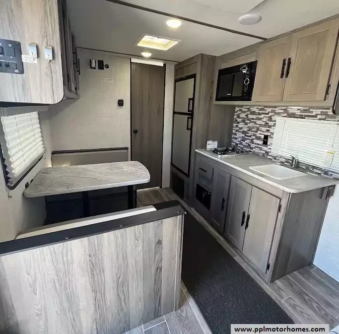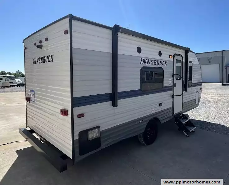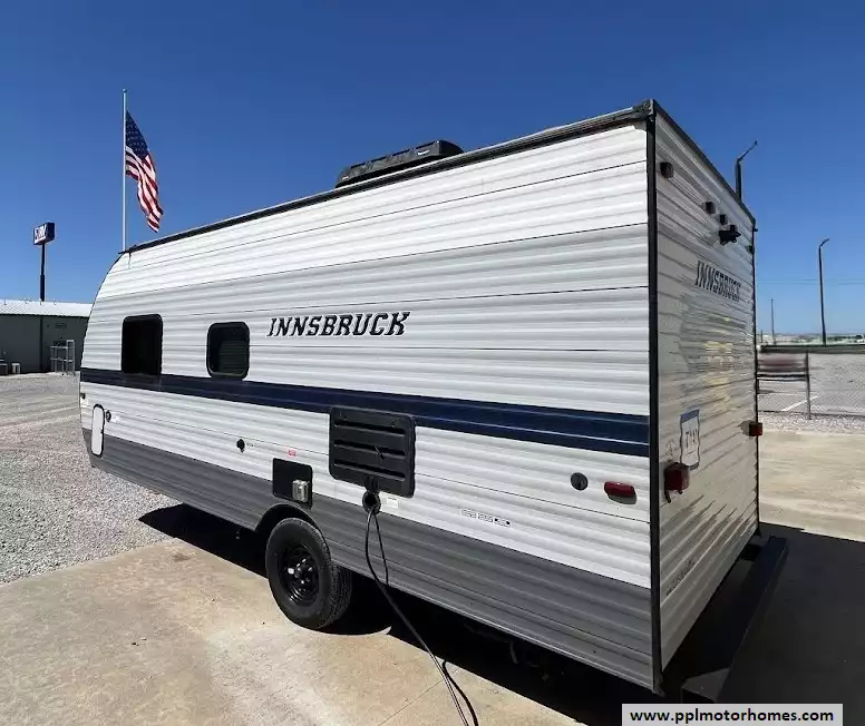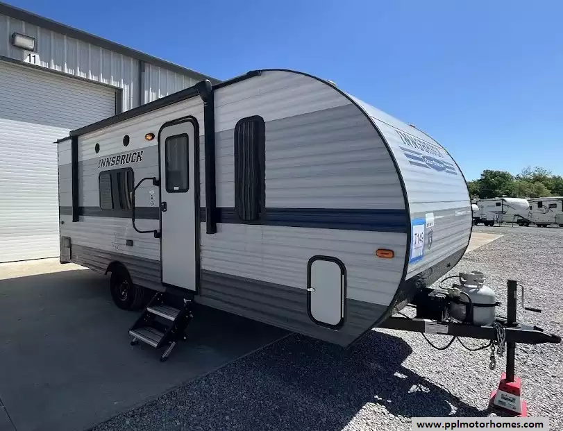 This 2021 Innsbruck Super Lite 189DD has a 1 Non-Ducted Air Conditioner, Double Door Gas/12v Dometic Refrigerator, Automatic Main Awning And Window/Door Awnings, Outside Speakers, Microwave, 2 Burner Range