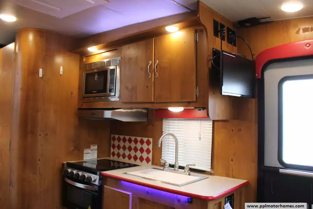 Inside, you will find a fully equipped kitchen featuring a double door gas/110v Dometic refrigerator, microwave, three-burner range, and an oven, making it easy to prepare home-cooked meals on the road. Comfort is guaranteed in any climate with ducted air conditioning, while the entertainment suite-including two TVs, a DVD player, and outside speakers-ensures you are never without your favorite media. Whether you are relaxing under the shade of the automatic awning or enjoying the spacious interior, this Vintage Cruiser offers the perfect blend of retro charm and modern convenience for your next adventure.