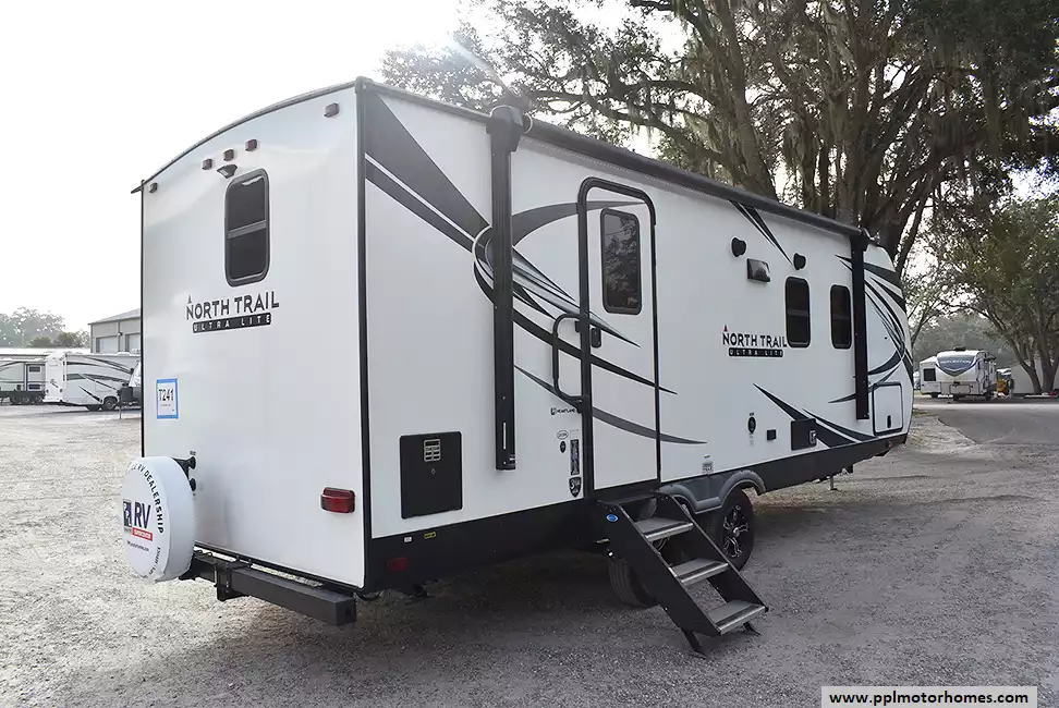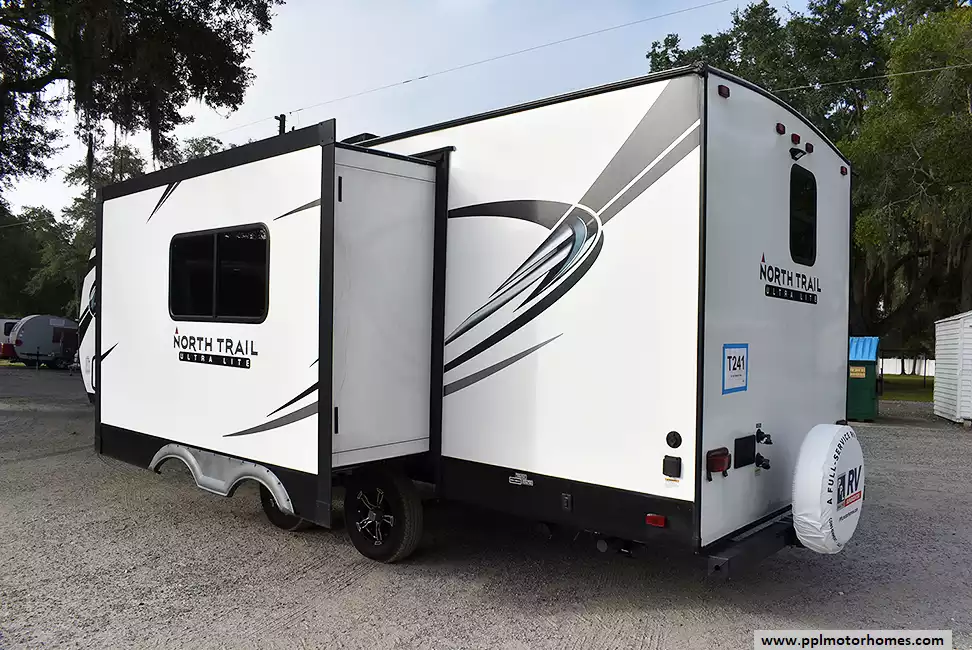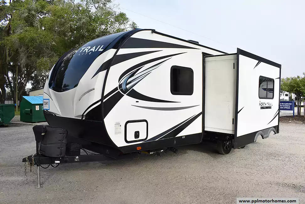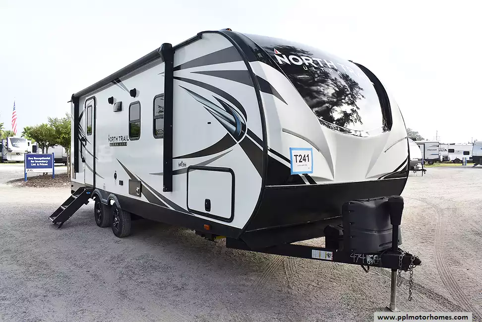 This 2021 North Trail 22CRB has a 1 Slide-out, 1 Ducted Air Conditioner, Double Door Gas/110v Everchill Refrigerator, Automatic Main Awning, Satellite Receiver, Outside Speakers, TV, Outside Shower, Fireplace, Microwave, 3 Burner Range
