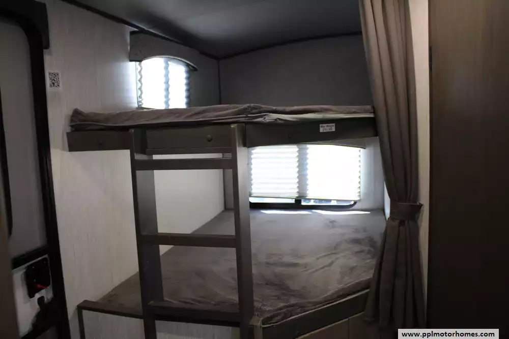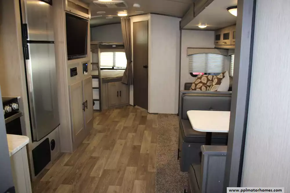 The 2021 Heartland Sundance 278BH is a versatile Ultra-Lite travel trailer built for families and camping trips. At roughly 32'10" long with a dry weight of about 6,565 lbs and a GVWR of 9,460 lbs, it's towable by many half-ton and larger trucks. Inside, it can sleep 8-10 people thanks to a rear bunkhouse with double-size bunks, a private front queen bedroom, and convertible dinette/sofa sleeping options. The unit comes well-equipped, a full kitchen (3-burner cooktop, oven, 10.7 cu ft 12 V refrigerator), generous water/holding-tank capacities (44 gal fresh, 87 gal grey, 30 gal black), 13,500 BTU A/C and 30,000 BTU furnace for comfort in varying climates, and a 20-foot electric awning for outdoor lounging. Construction-wise, the trailer uses lightweight yet durable composite sidewalls, a walkable barrel roof, insulated underbelly, and solid build-quality expected of a modern RV, aiming to balance comfort, functionality, and towability for family or multi-person trips.
