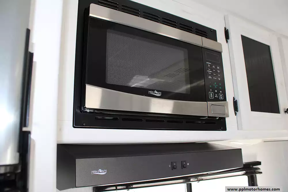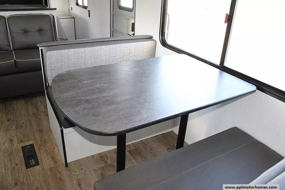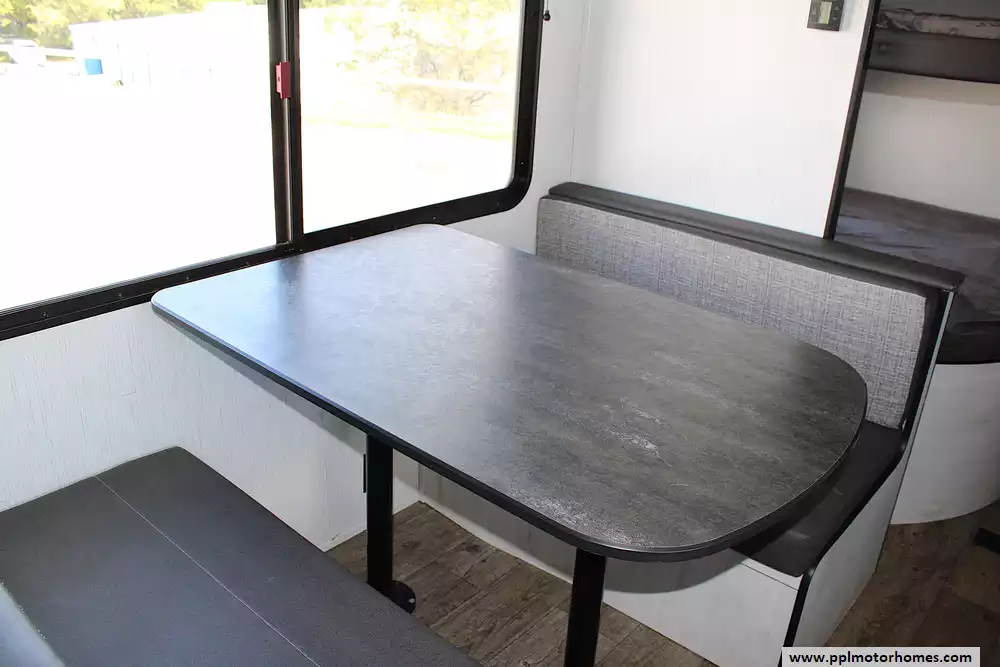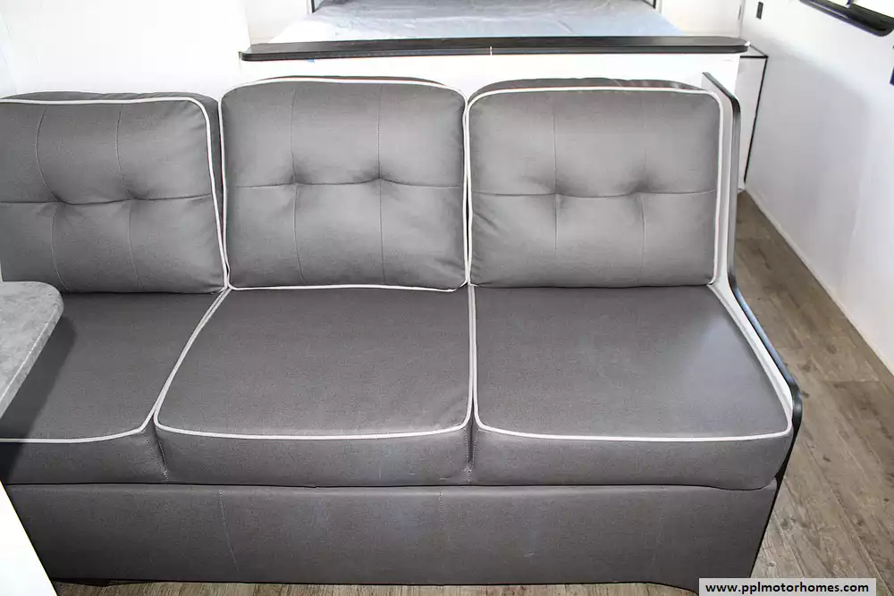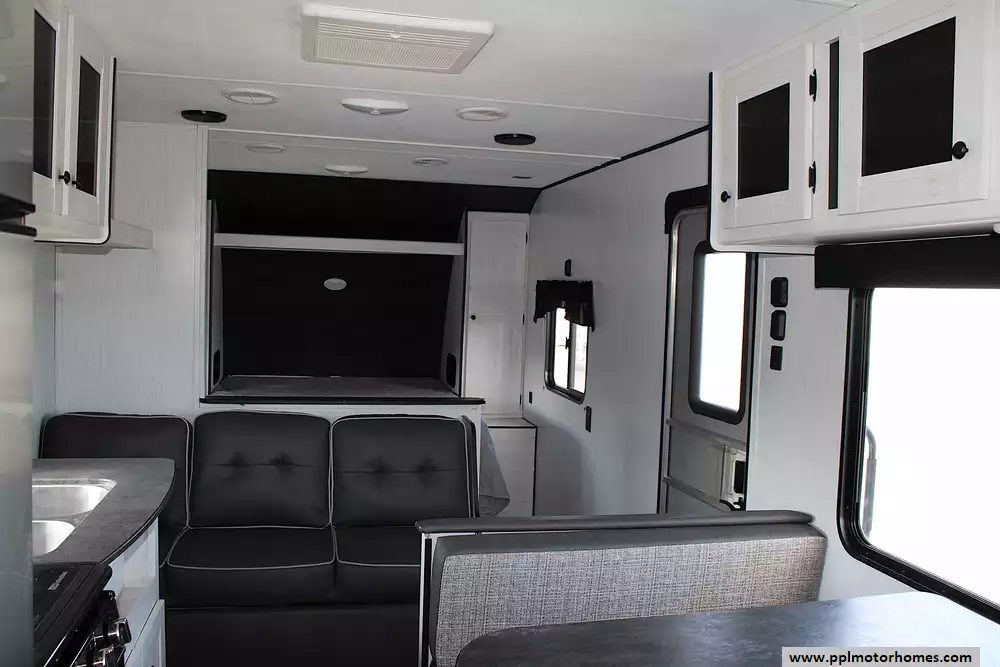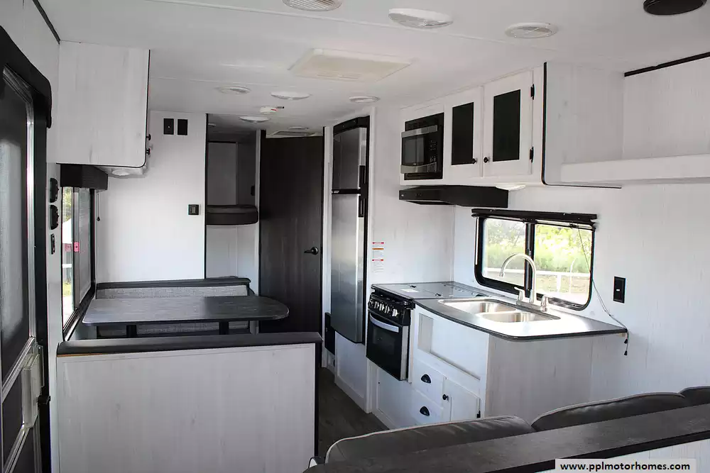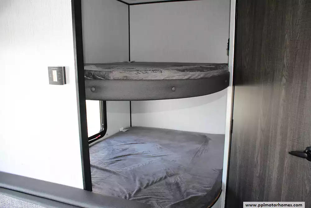 Inside, this Trail Runner welcomes you with a thoughtful layout designed for both families and groups of friends. It comfortably sleeps up to 10 people, thanks to a private front queen bedroom, spacious rear double-over-double bunks, and additional sleeping from the convertible dinette and sofa. The open living area provides room to gather, share meals, or simply enjoy downtime, while the kitchen comes equipped with a refrigerator, three-burner cooktop, microwave, and ample storage for all your essentials. Every detail is crafted to make life on the road feel just like home-only better.