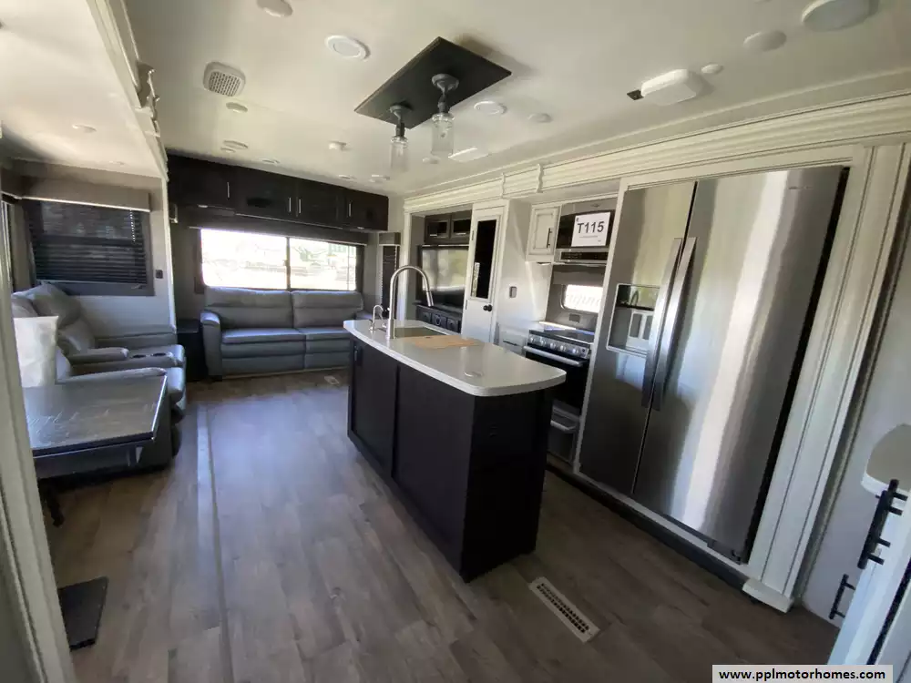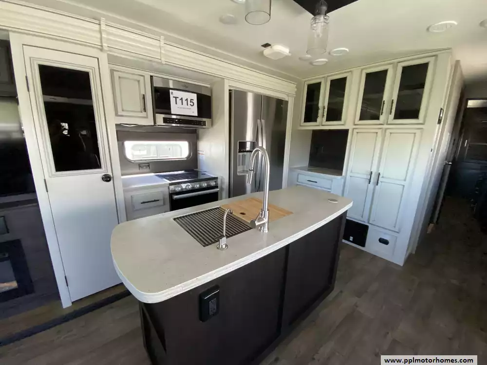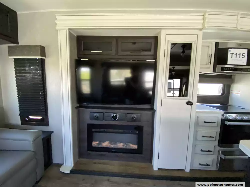 The interior is thoughtfully appointed for modern convenience, anchored by a gourmet kitchen that includes a double-door 12v residential Whirlpool refrigerator with an in-fridge ice maker, a microwave, a three-burner range, and an oven. Relax in the expansive living area by the fireplace while enjoying one of the two TVs, or take advantage of the rare convenience of an on-board washer and dryer. Exterior setup is effortless thanks to the electric tongue jack, while the automatic main awning, outside speakers, and outside shower create the perfect atmosphere for outdoor entertaining. This Eagle Series 330RSTS truly combines heavy-duty craftsmanship with all the comforts of home.